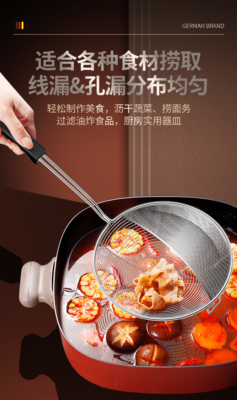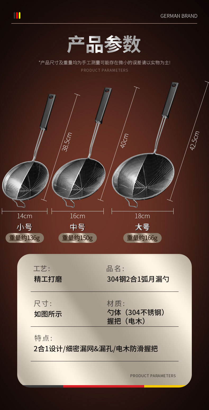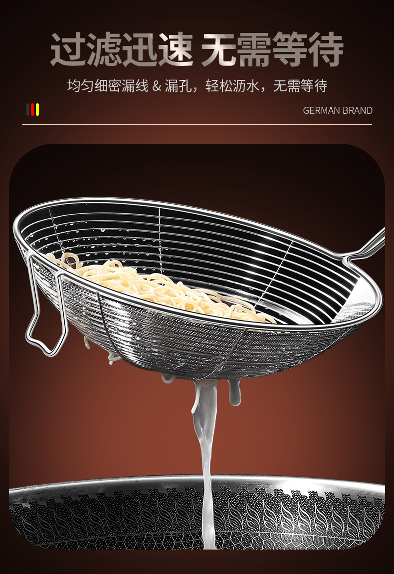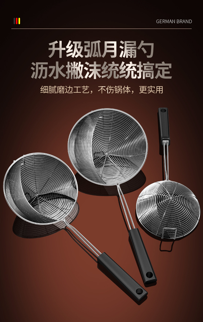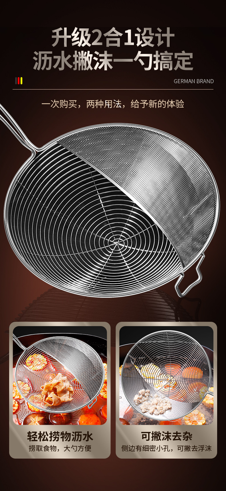 【跨境出口德国316不锈钢大漏勺】316不锈钢线漏厨房加大沥水勺多用途带滤网笊篱加长防烫柄大漏勺