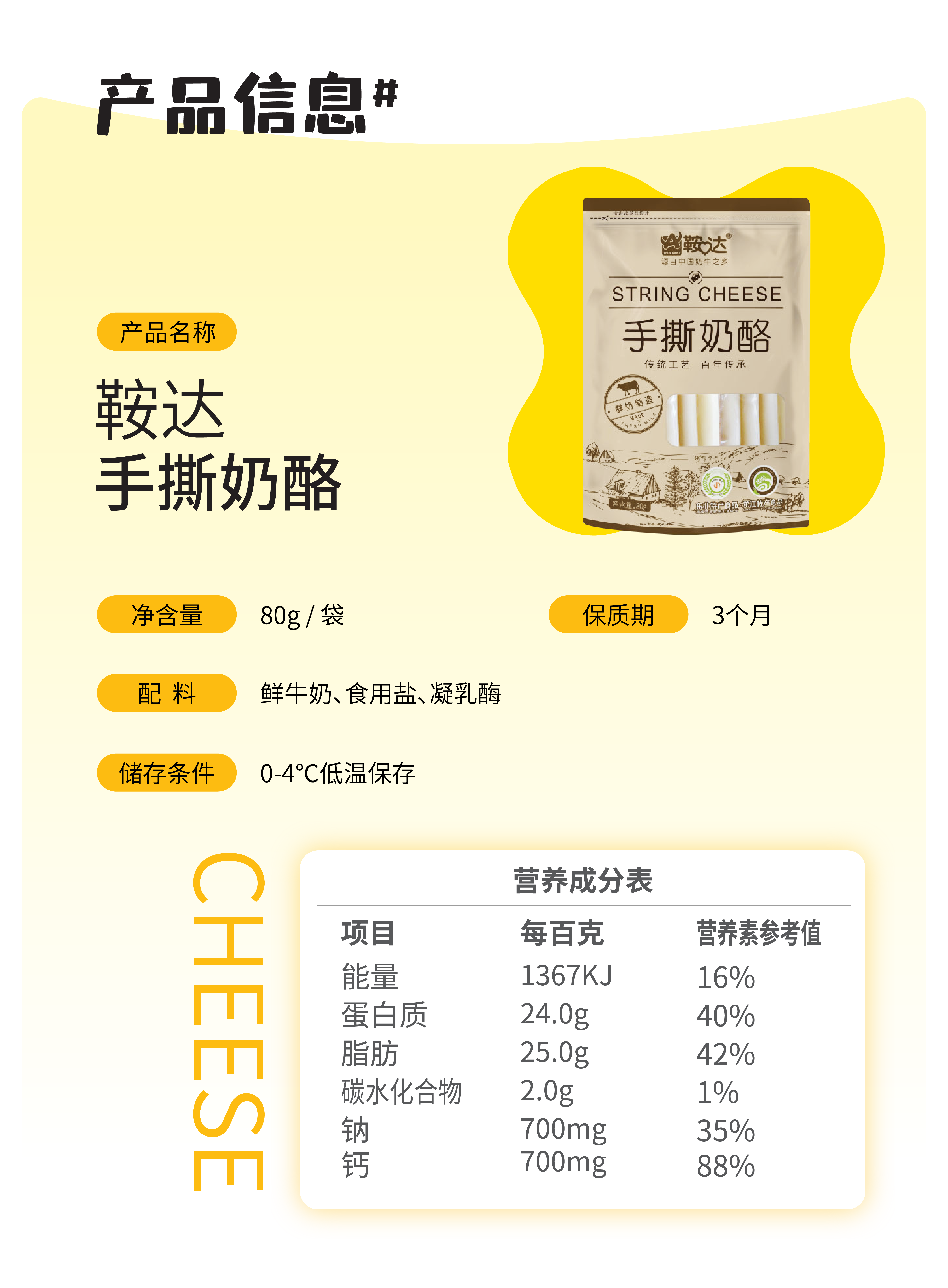温馨提示:鞍达手撕奶酪是纯天然发酵,无任何防腐剂,因此常温下会加速发酵,缩短保质期。如发生在常温下存放的情况,请尽快食用完毕,或放入冰箱冷冻储存,食用前提前取出。温度越高,奶酪越软,冷冻后会恢复较硬口感。