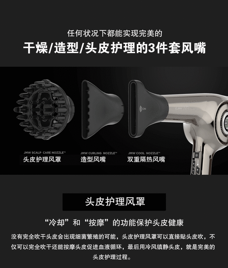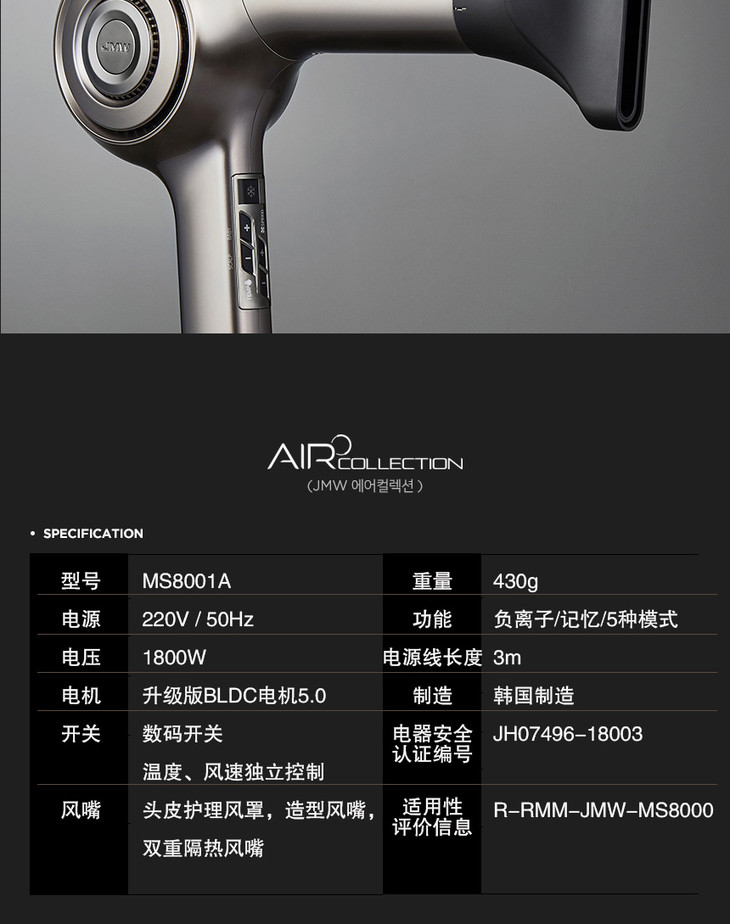JMW韩国智能触摸变频1800W大风力低噪音负离子造型电吹风机MS8001A