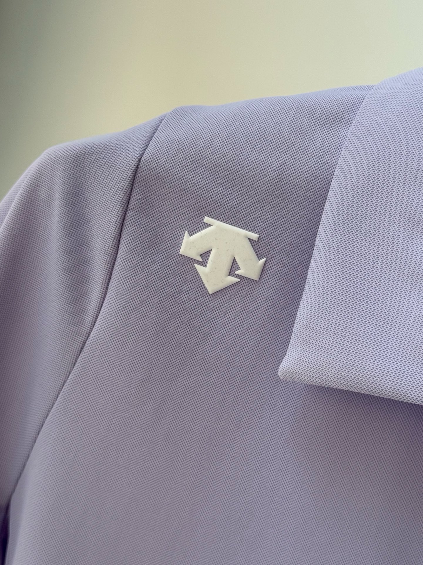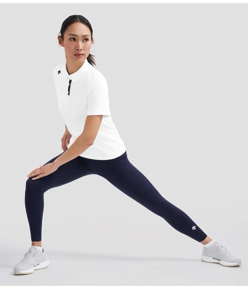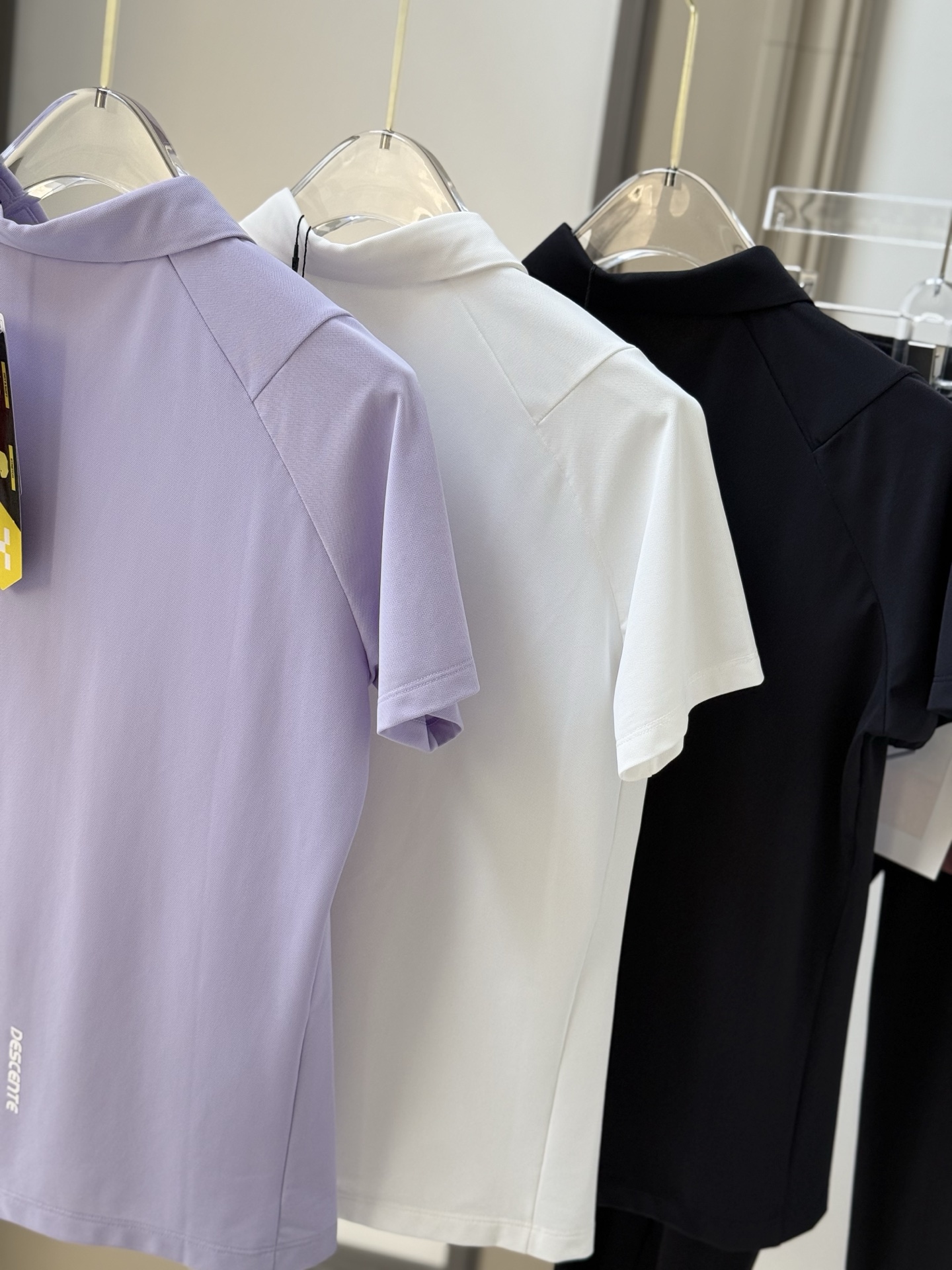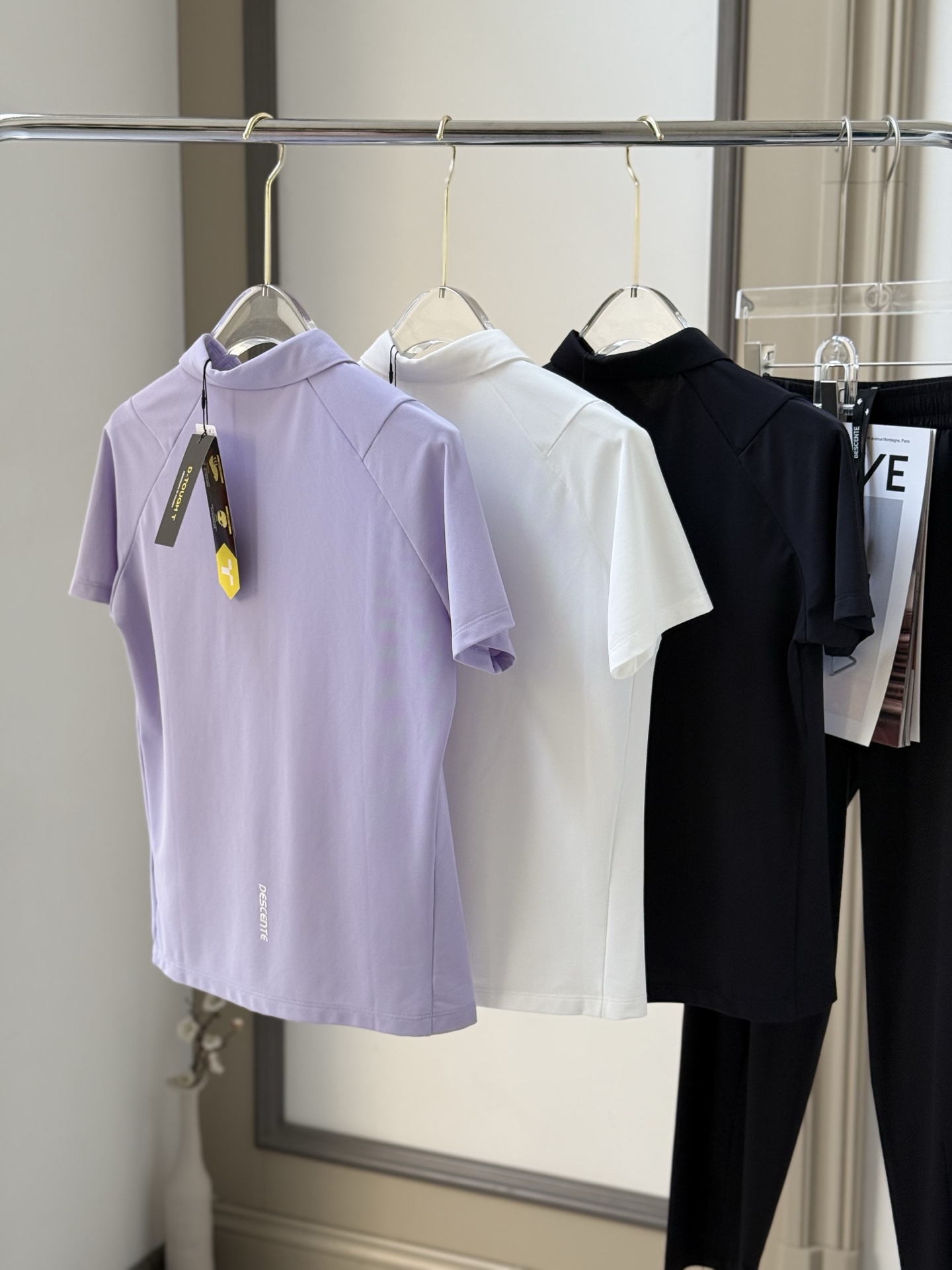 105 货号090632105 xj 迪桑特女款高尔夫FIELD修身翻领短袖,简约质感,轻松驾驭春夏球场 使用经典Carvico针纺梭面料制成的短袖POLO衫。面料轻质挺阔,平整顺滑,抗皱的同时具有抗紫外线功能性。袖口的撞色提织装饰,小巧秀气,细节设计感凸显。领口和袖口的提花工艺,确保花纹立体感的同时保持抗皱、耐磨性。立体剪裁设计,贴合女性身材曲线,兼顾运动灵活性与优雅线条,避免传统POLO衫的臃肿感,偏运动剪裁,若追求宽松效果可考虑大一码。
