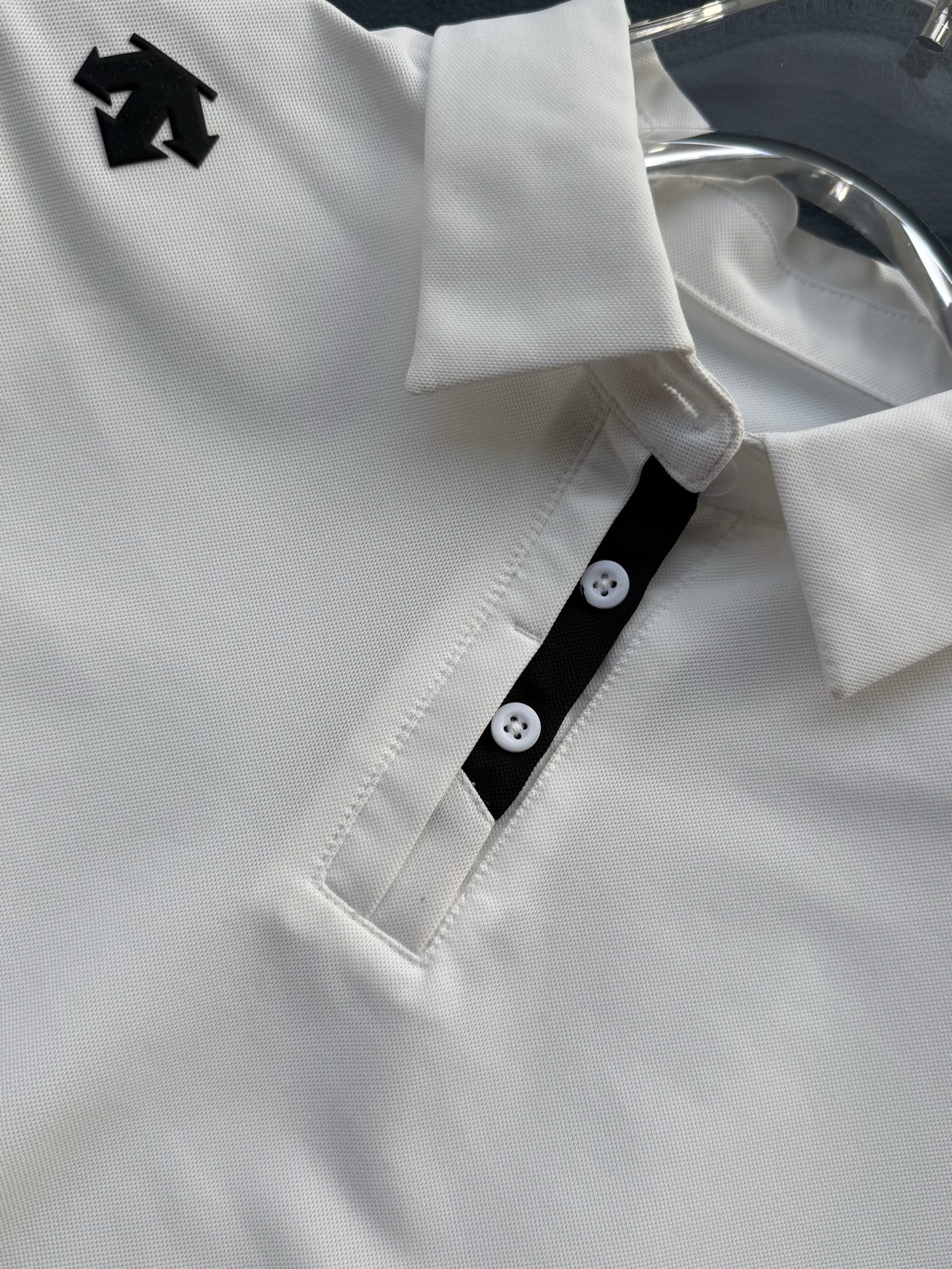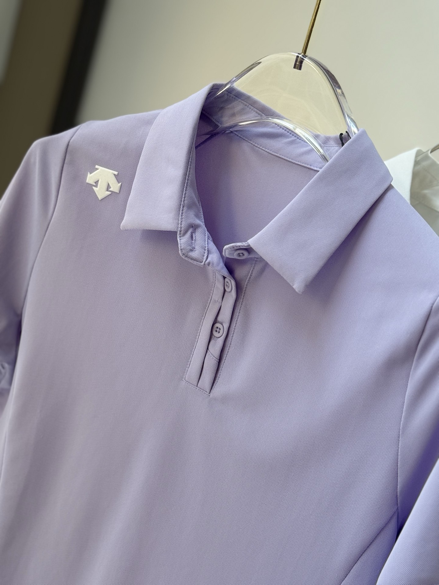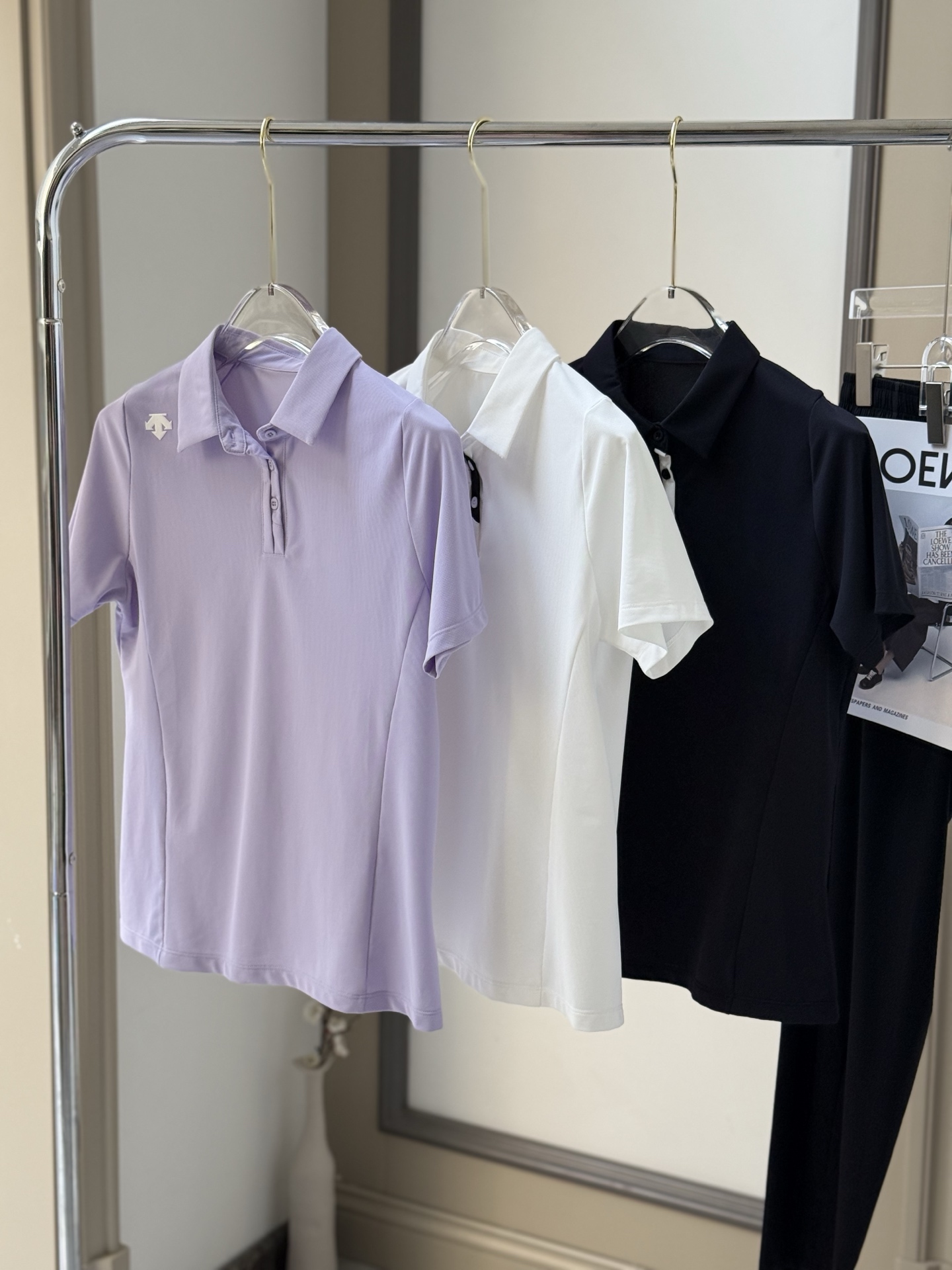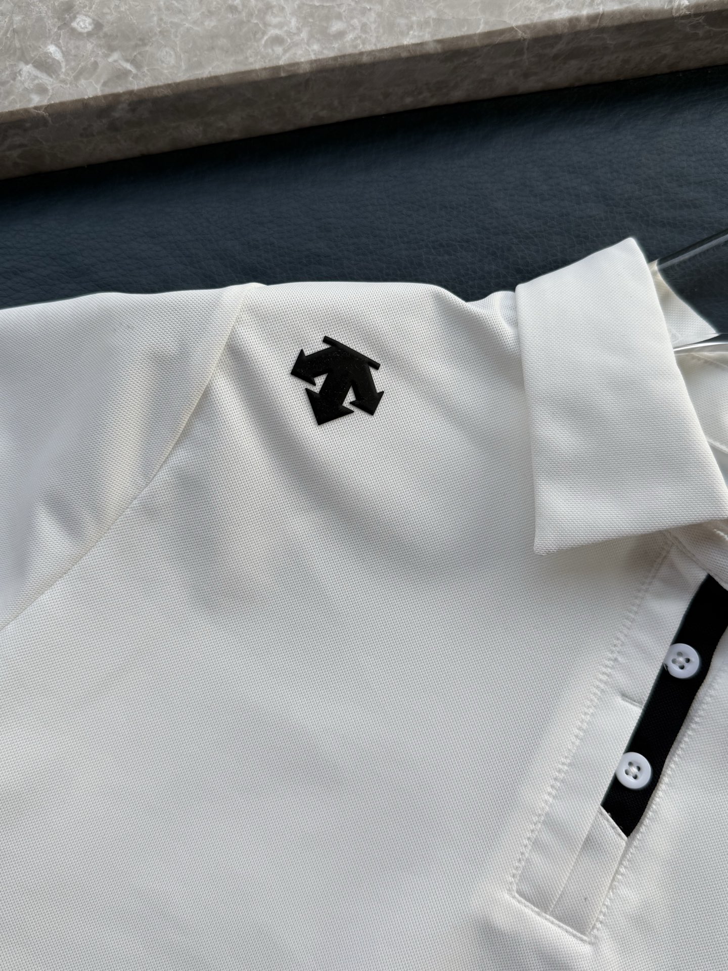 105 货号090632105 xj 迪桑特女款高尔夫FIELD修身翻领短袖,简约质感,轻松驾驭春夏球场 使用经典Carvico针纺梭面料制成的短袖POLO衫。面料轻质挺阔,平整顺滑,抗皱的同时具有抗紫外线功能性。袖口的撞色提织装饰,小巧秀气,细节设计感凸显。领口和袖口的提花工艺,确保花纹立体感的同时保持抗皱、耐磨性。立体剪裁设计,贴合女性身材曲线,兼顾运动灵活性与优雅线条,避免传统POLO衫的臃肿感,偏运动剪裁,若追求宽松效果可考虑大一码。