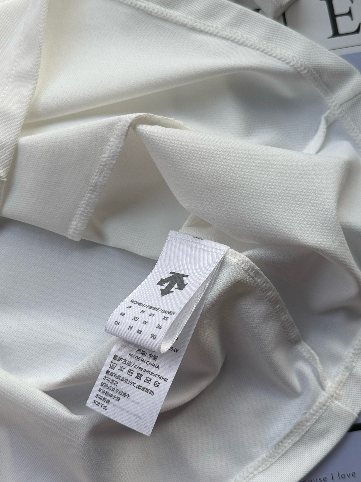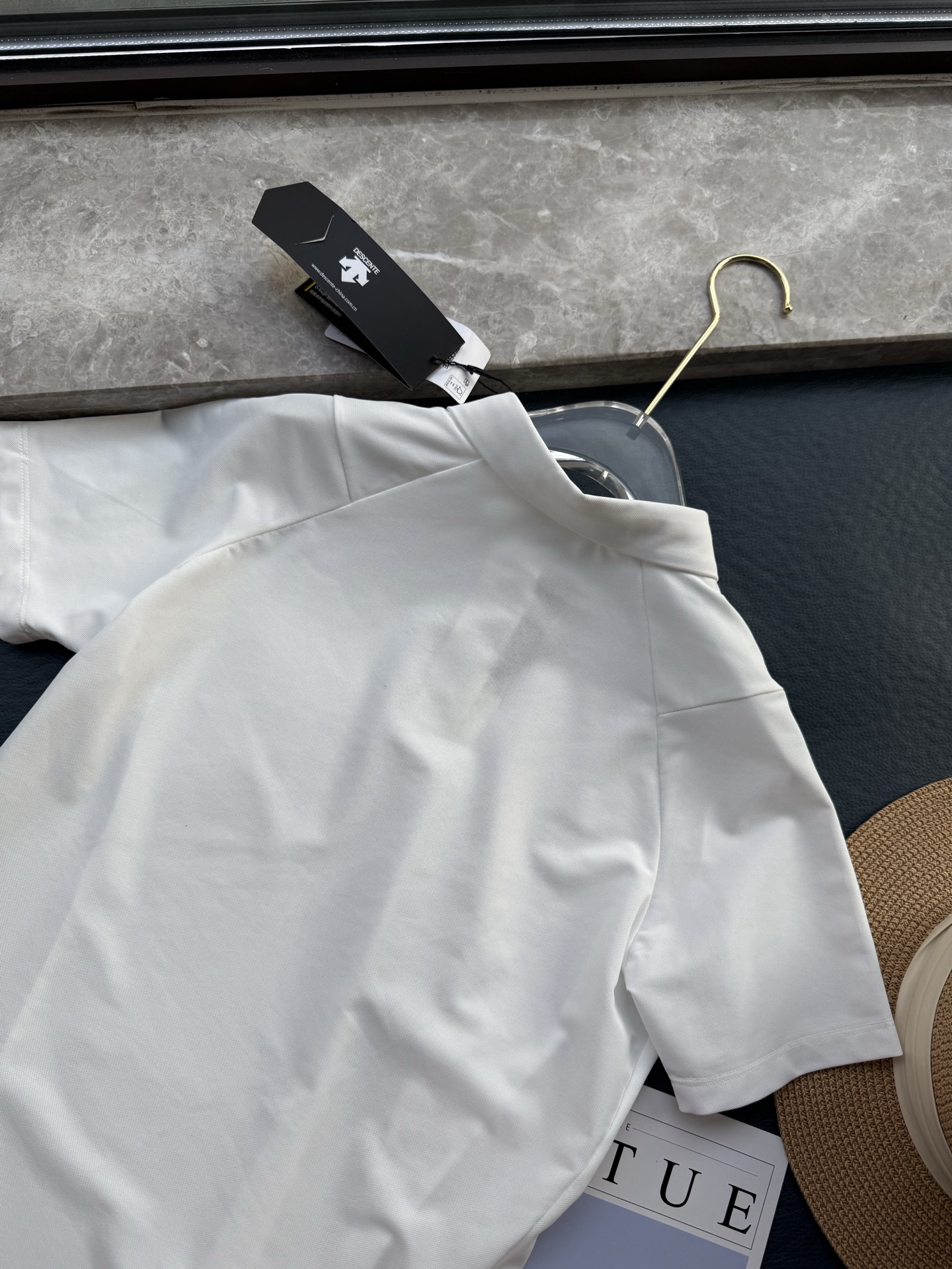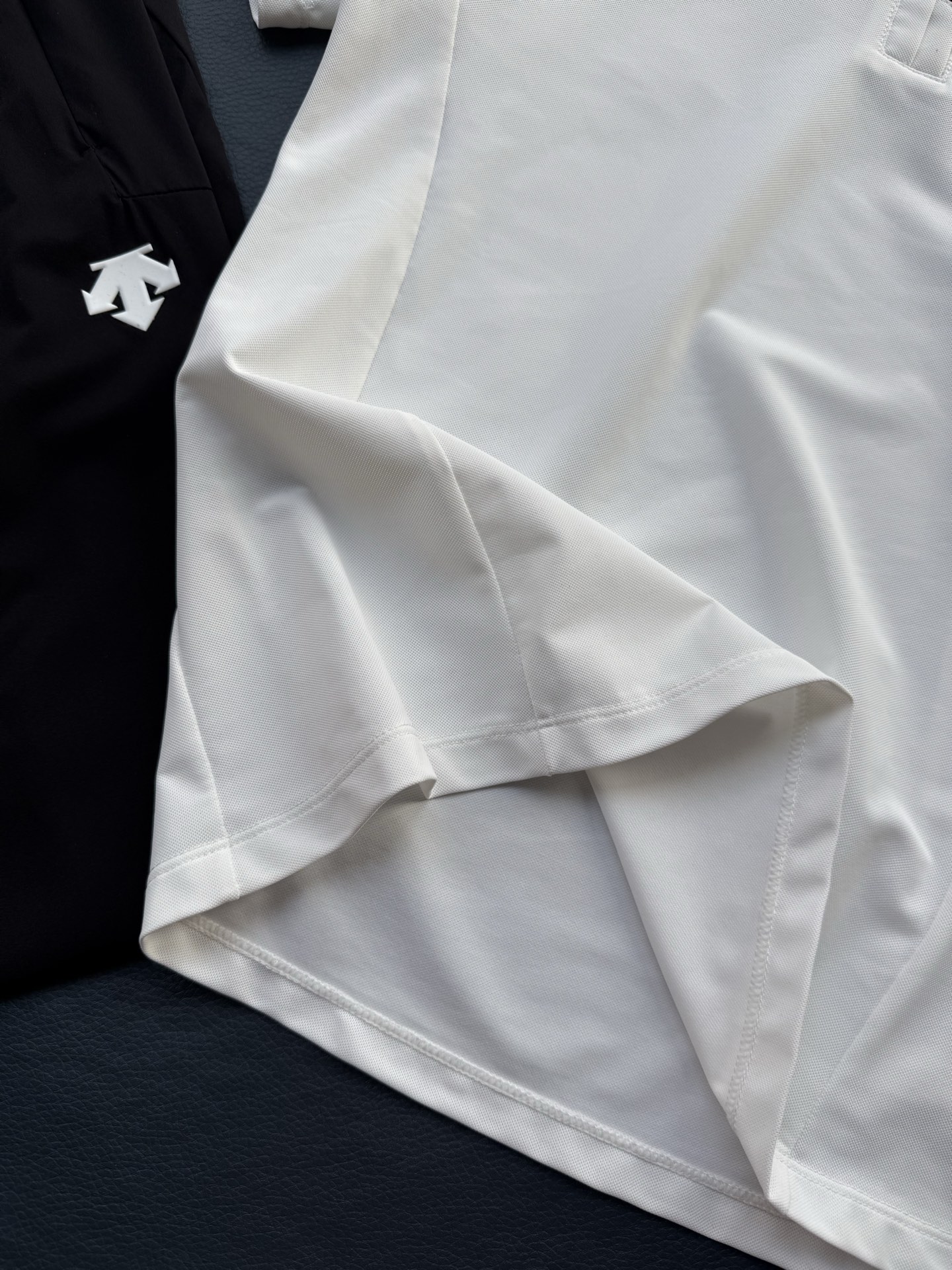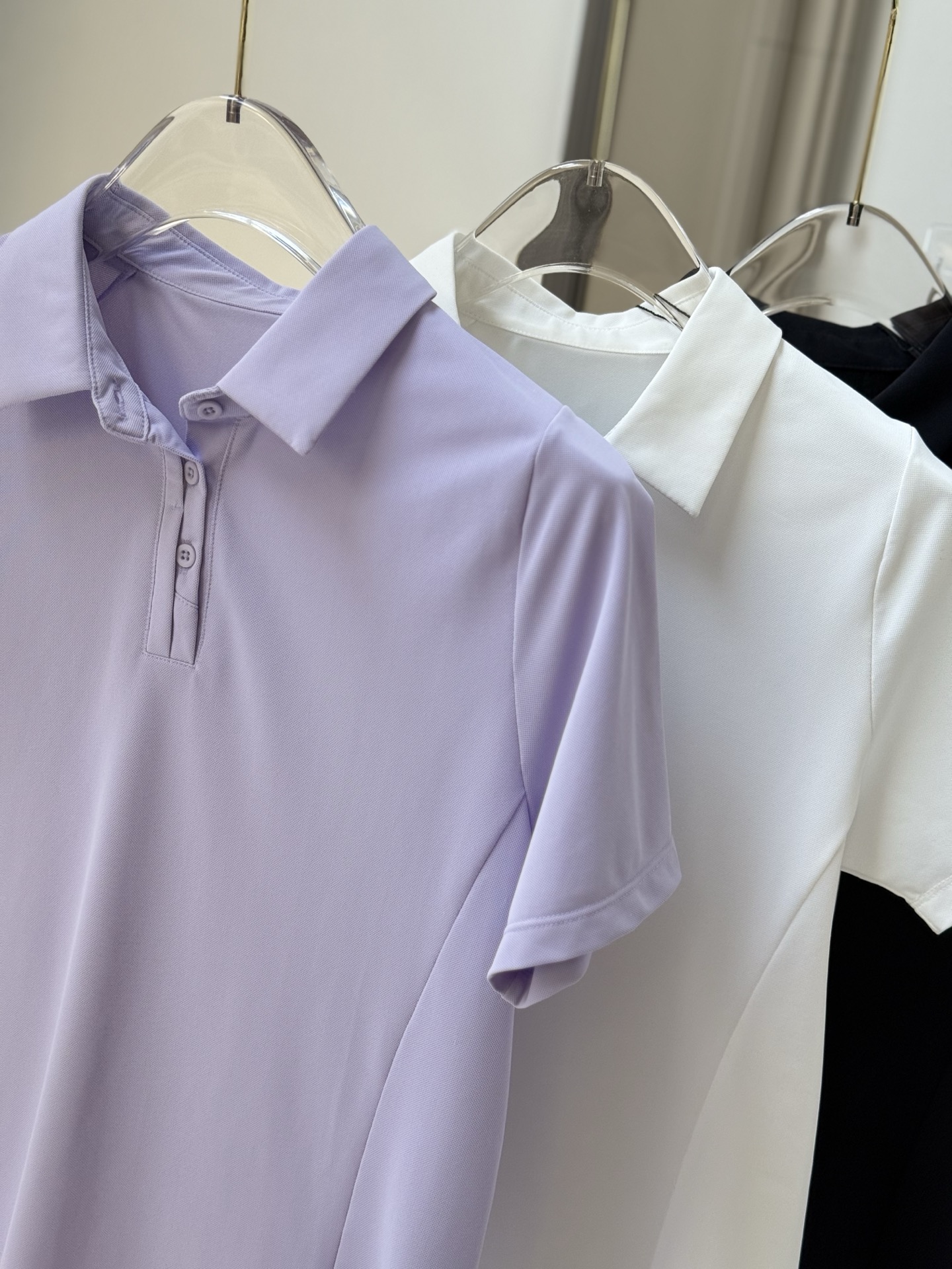 105 货号090632105 xj 迪桑特女款高尔夫FIELD修身翻领短袖,简约质感,轻松驾驭春夏球场 使用经典Carvico针纺梭面料制成的短袖POLO衫。面料轻质挺阔,平整顺滑,抗皱的同时具有抗紫外线功能性。袖口的撞色提织装饰,小巧秀气,细节设计感凸显。领口和袖口的提花工艺,确保花纹立体感的同时保持抗皱、耐磨性。立体剪裁设计,贴合女性身材曲线,兼顾运动灵活性与优雅线条,避免传统POLO衫的臃肿感,偏运动剪裁,若追求宽松效果可考虑大一码。