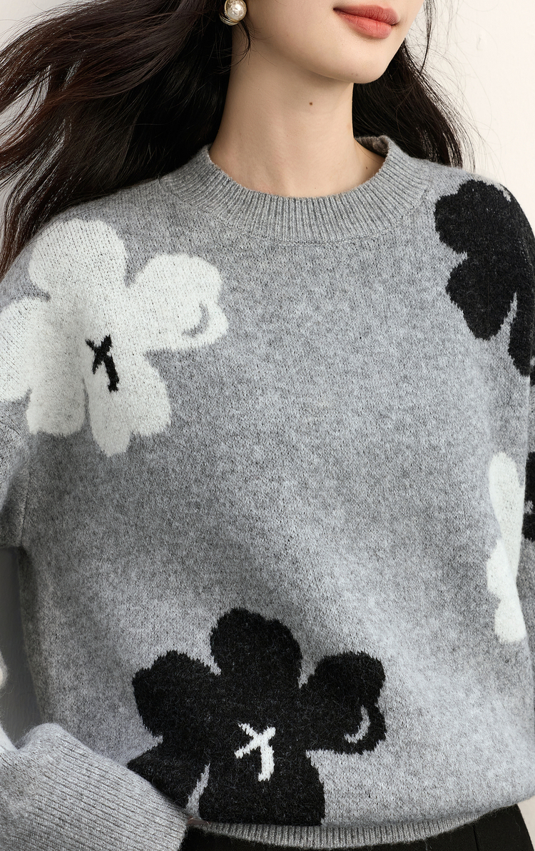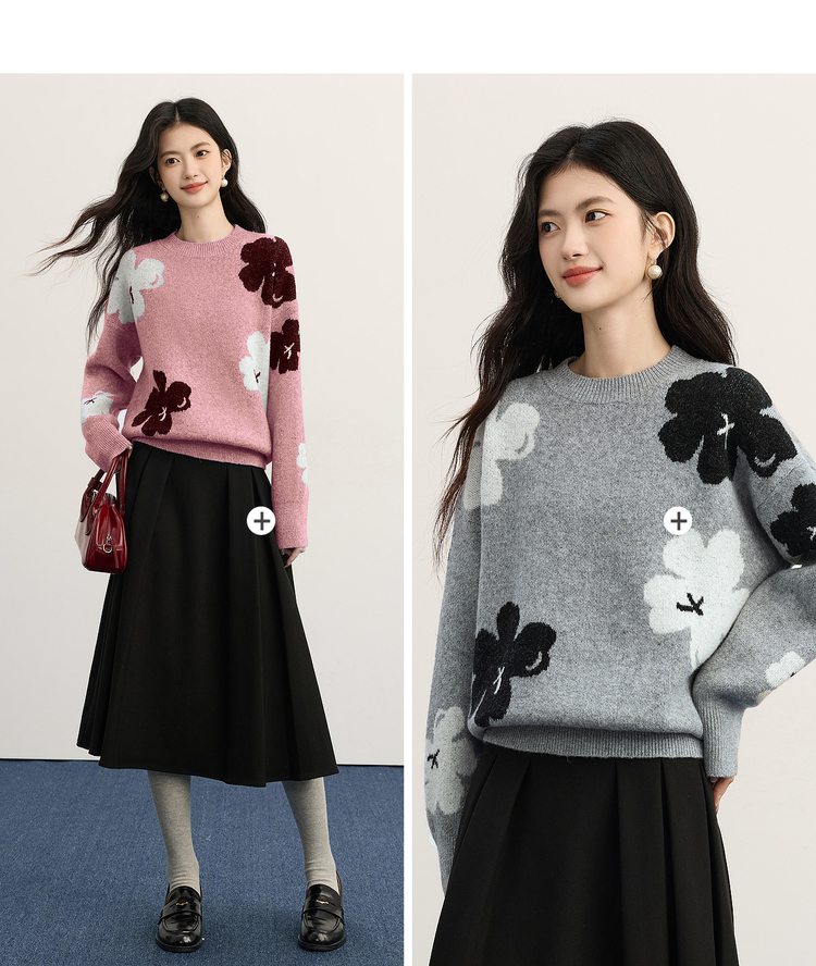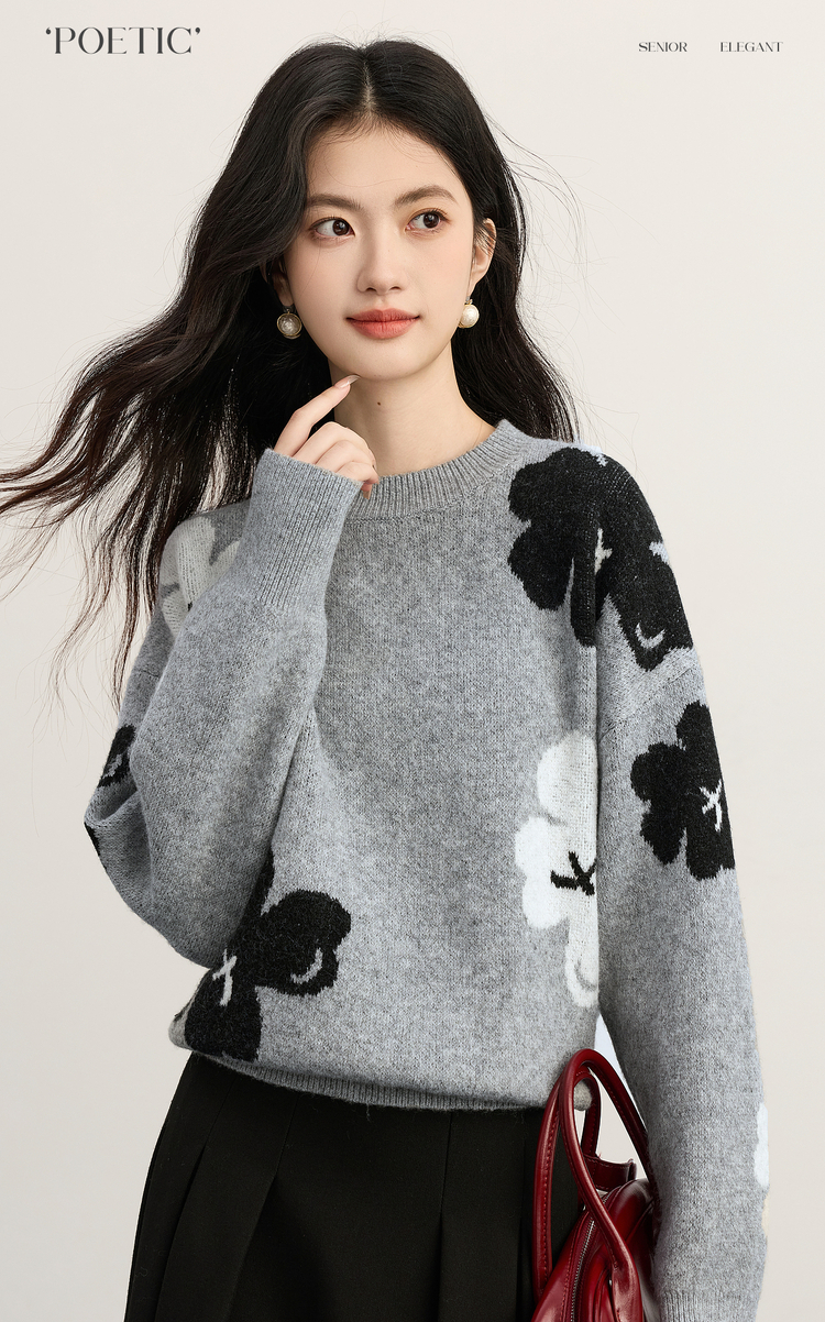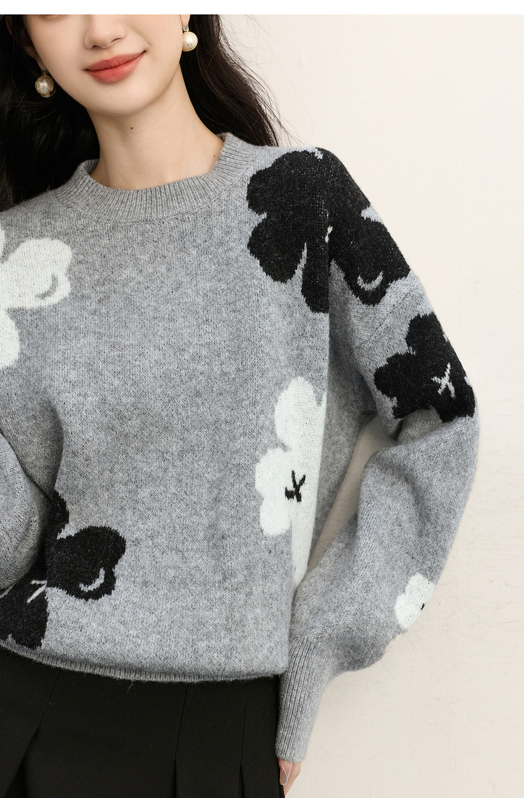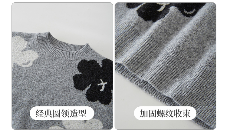 【年终特卖】熙世界含羊毛万花绒毛衣女套头2025冬季新款气质提花灰色厚针织衫