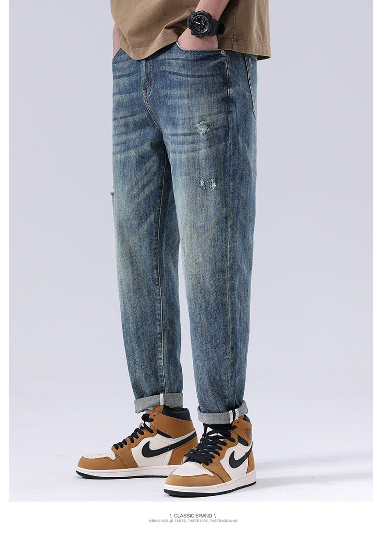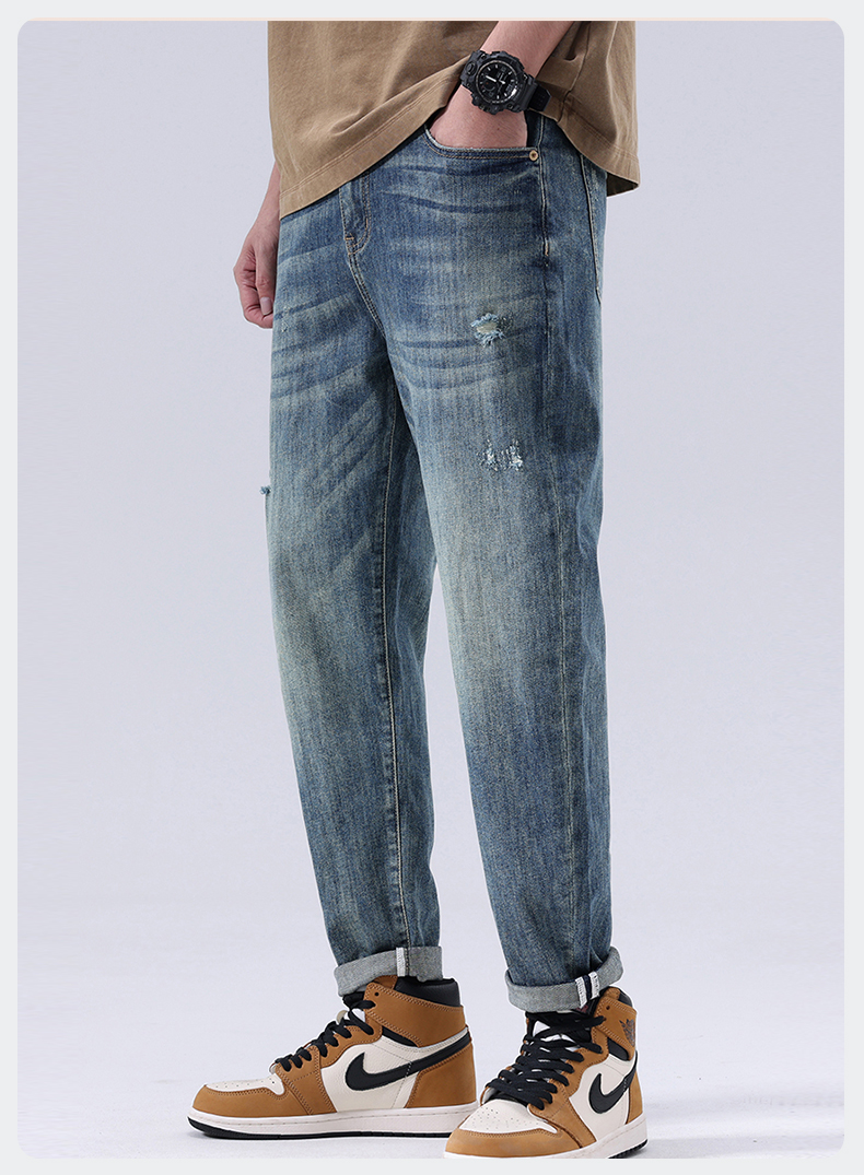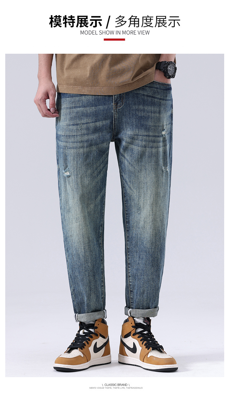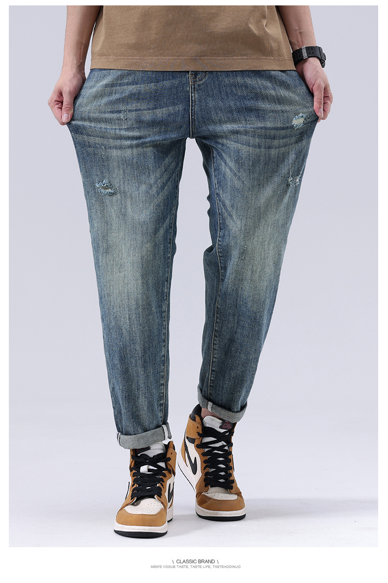 【夏款】【新款DQ】大依优型大码破洞牛仔裤九分长裤小脚裤YKK拉链男舒适弹力休闲薄款简约百搭加肥加大男装潮款