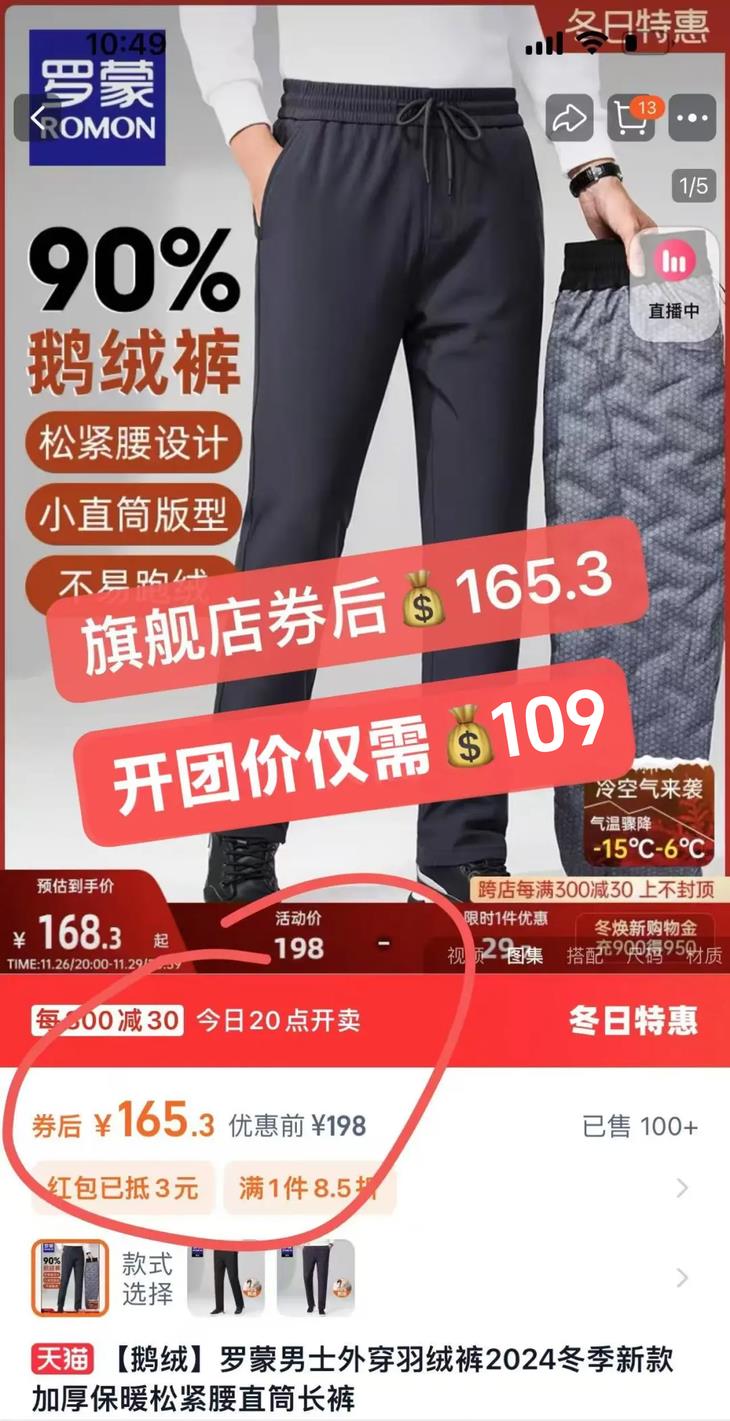 一个朋友知道后,给我推荐了这条 罗蒙ROMON防风抗寒鹅绒裤。