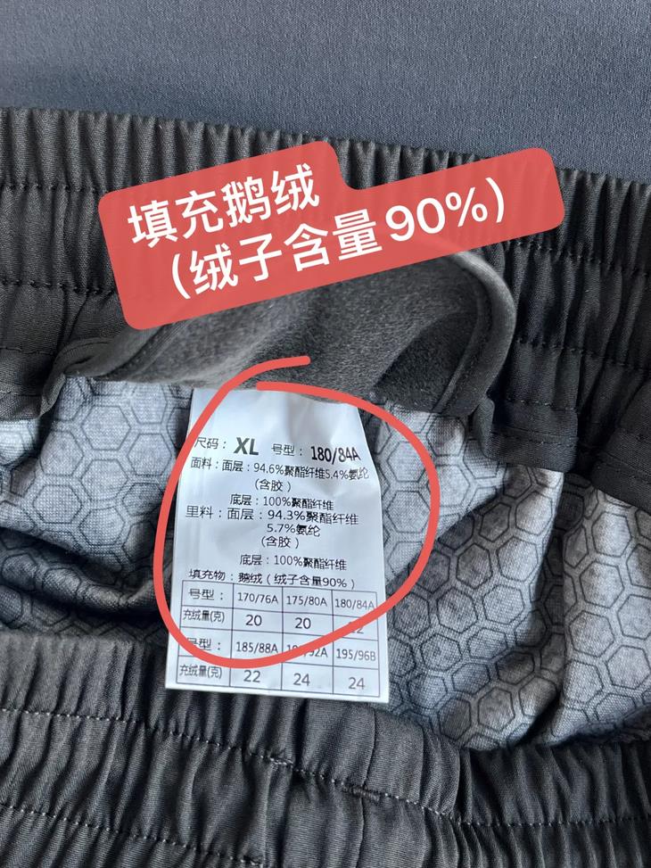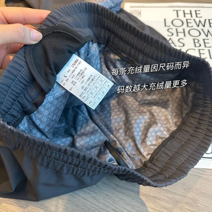 大家关注的充绒量,看洗标哦。因尺码大小而异,每条裤子的充绒量各有不同,码越大充容量越多。