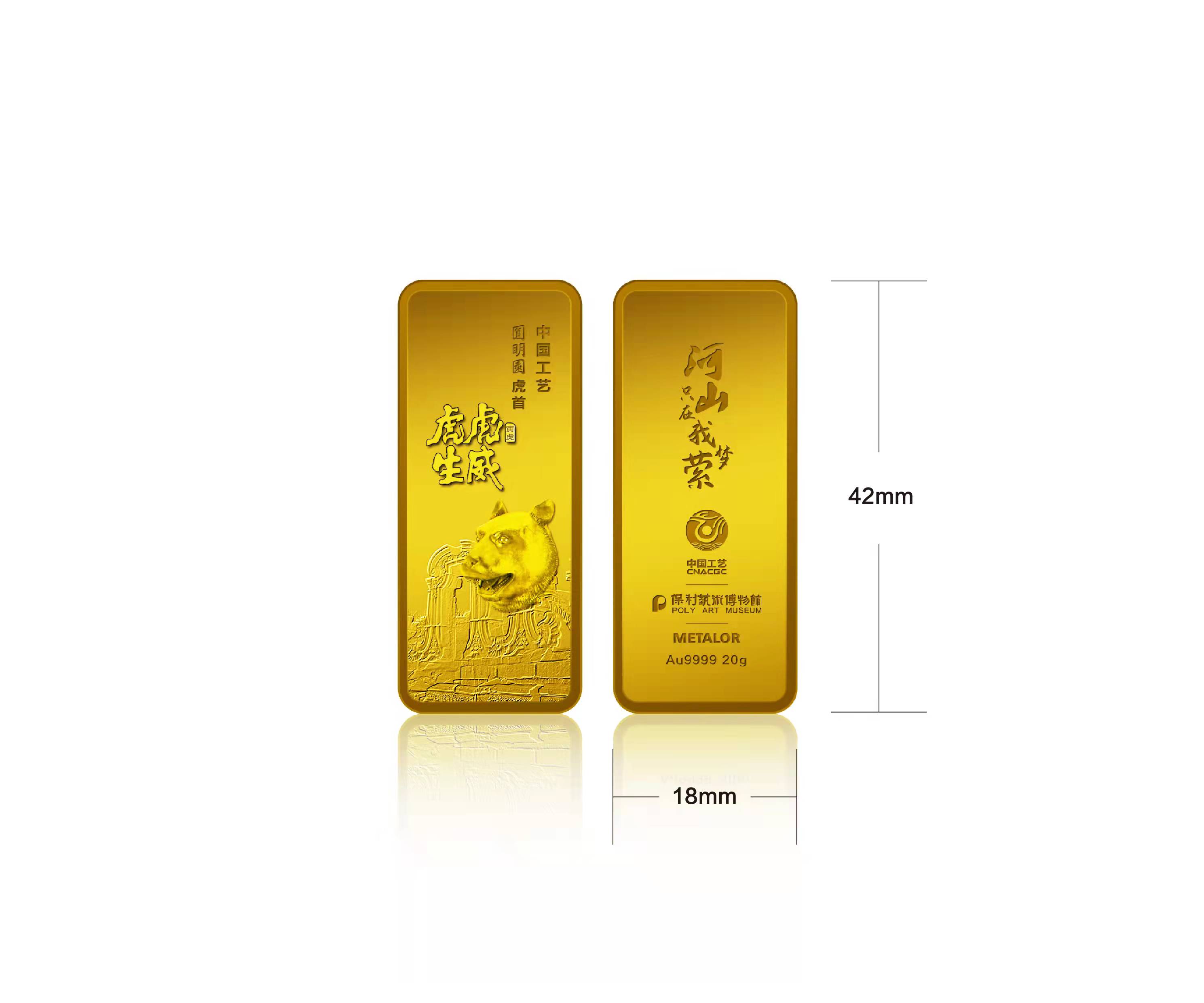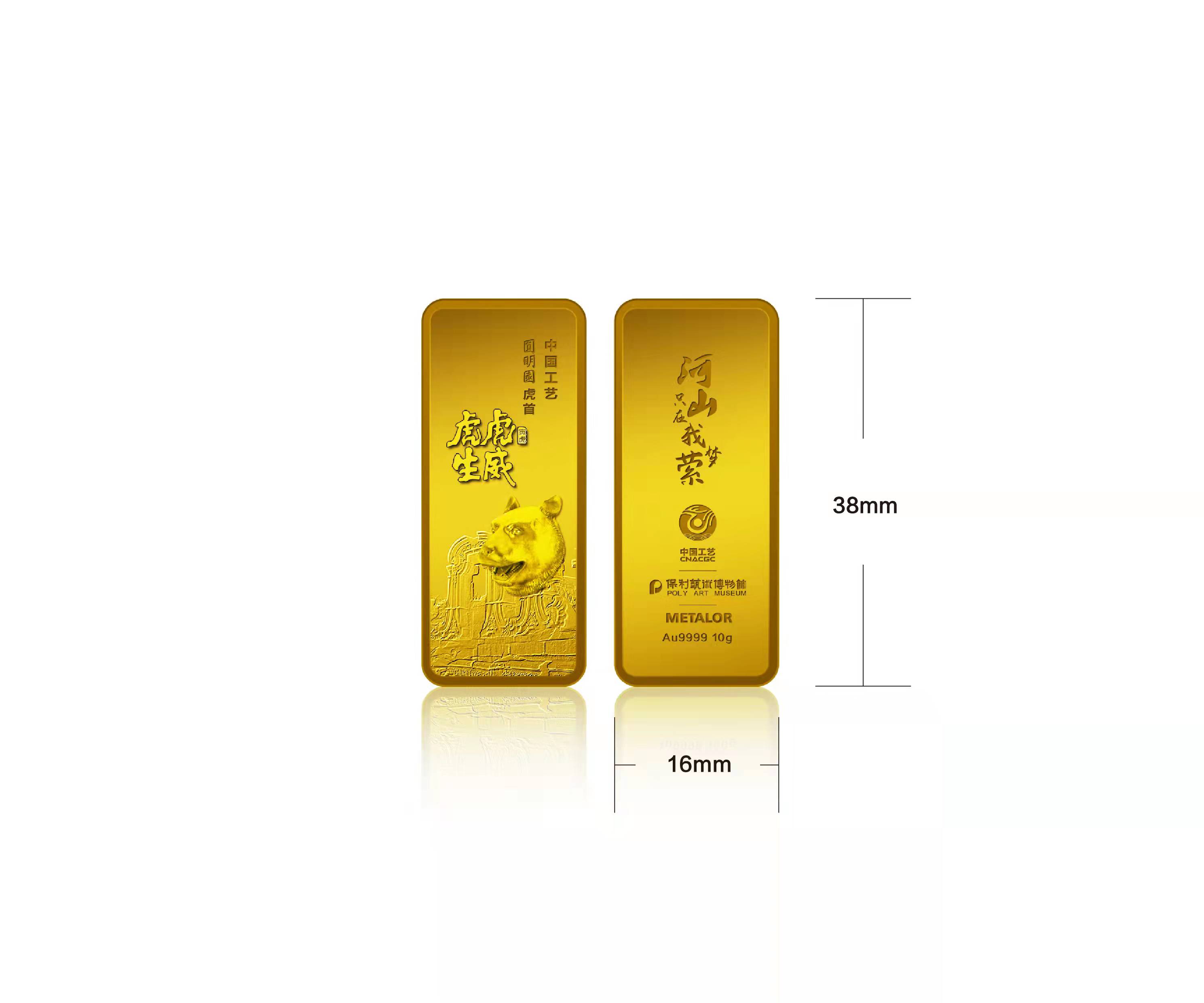 虎虎生威金条正面选用圆明园经典建筑西洋楼遗址与保利艺术博物馆馆藏圆明园虎兽作为核心元素,并配以虎虎生威字样;背面一句“河山只在我梦萦”,道出国宝流落梦我河山的百年艰难岁月,号召吾辈勿忘历史共创祖国伟大复兴。