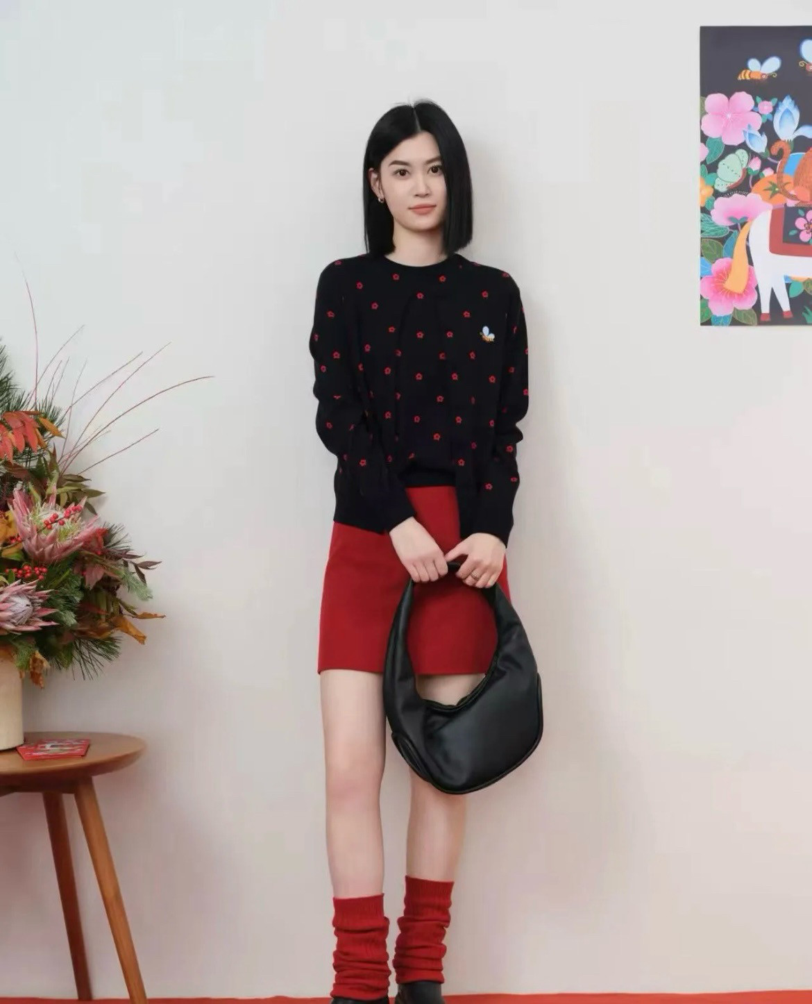 纯色底配红色桃花提花,左胸蜜蜂刺绣,寓意好运和事业升腾