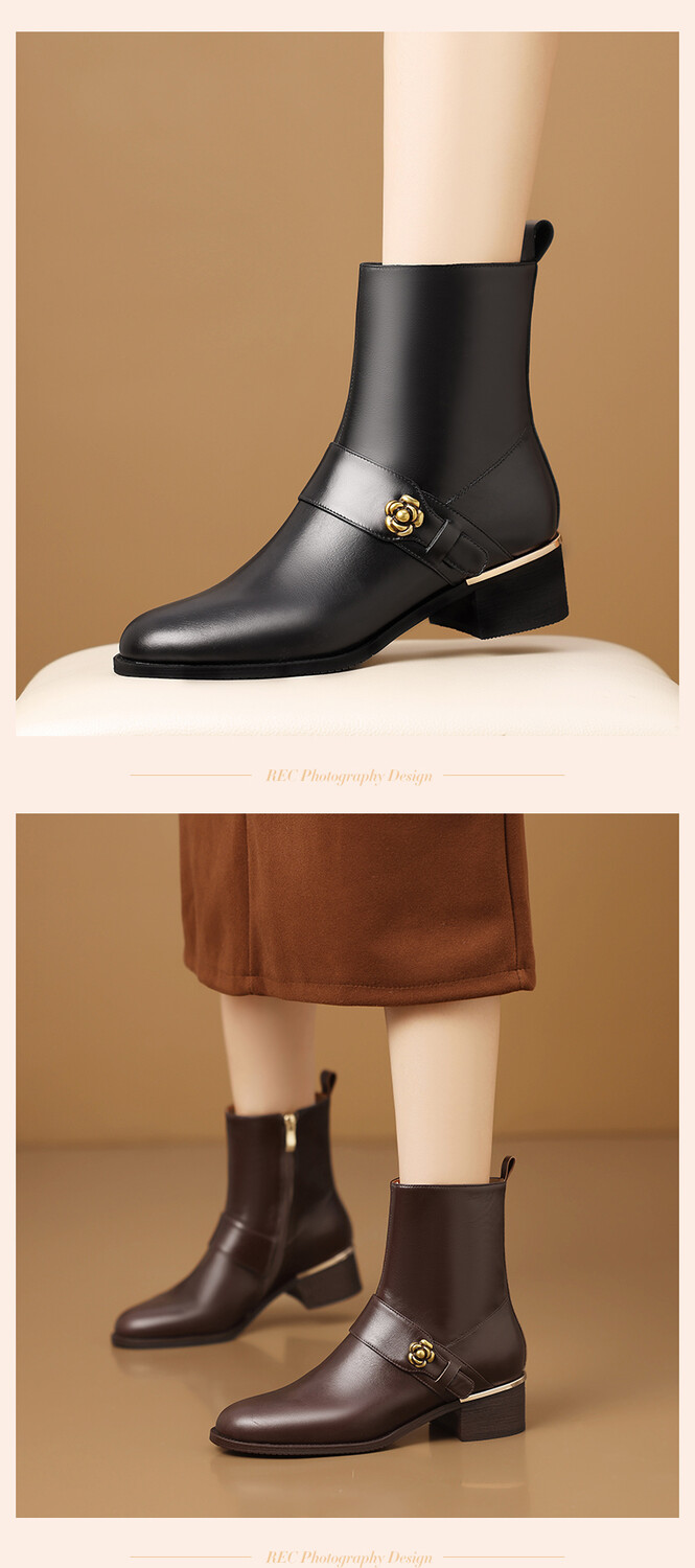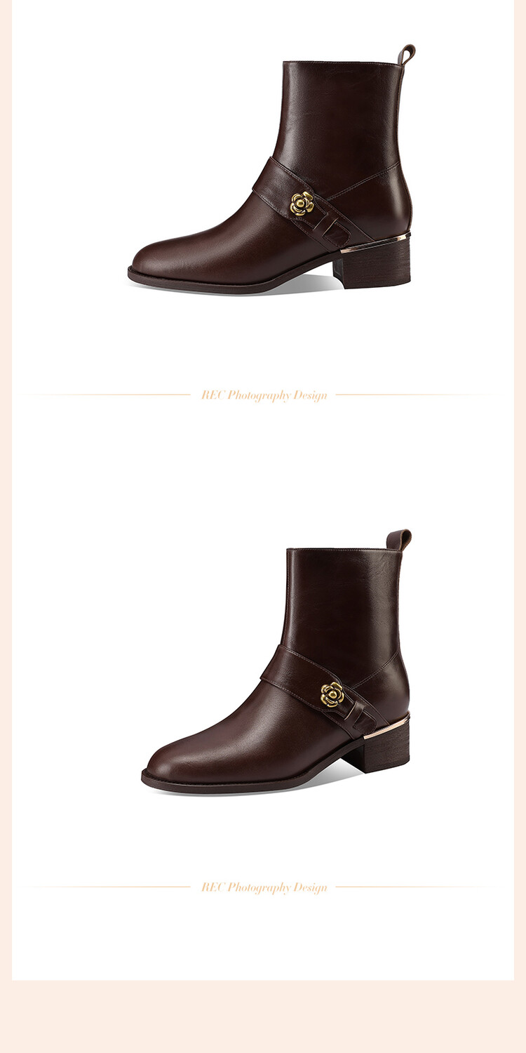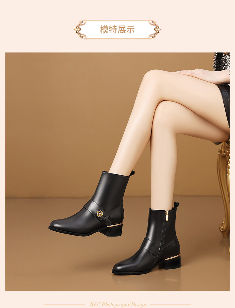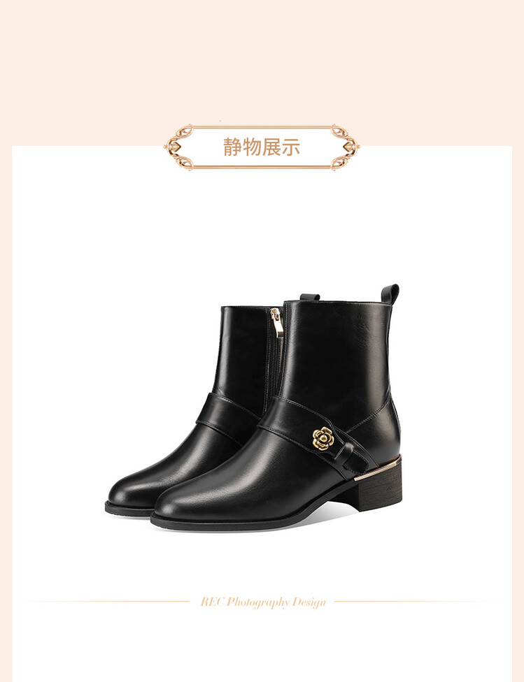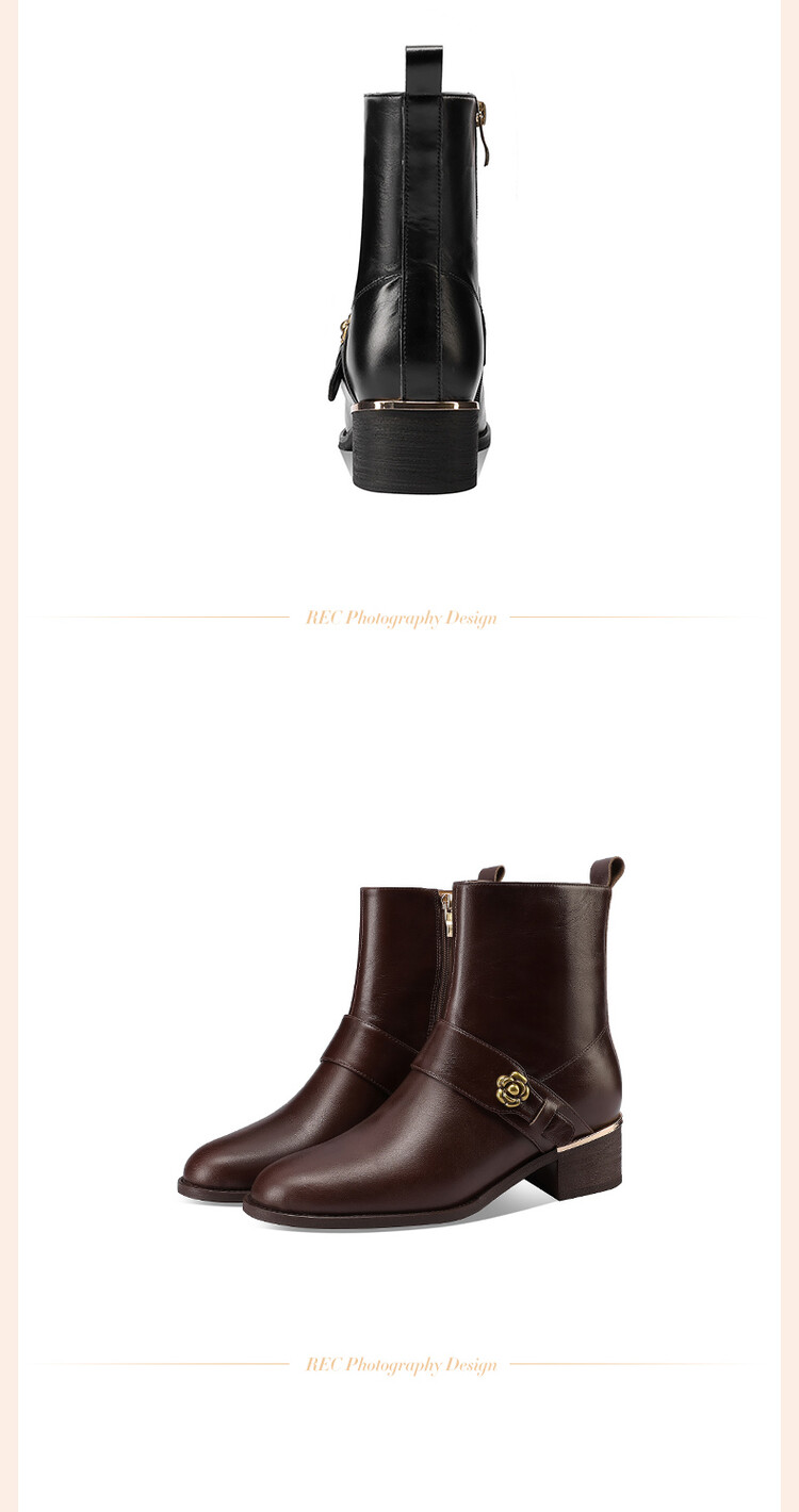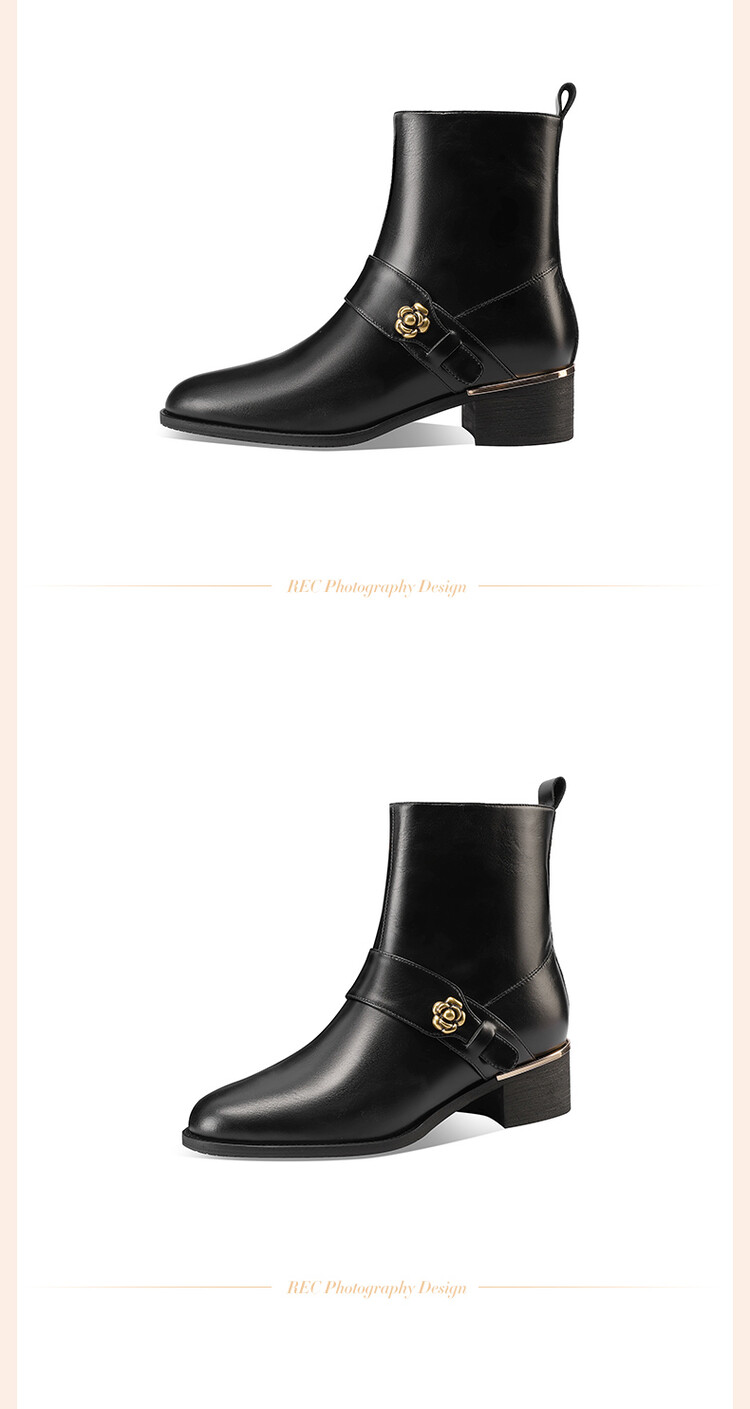 【预售5天】百搭时装靴秋冬季新款靴子圆头粗跟女靴金属扣花朵小皮靴牛皮短靴HY&H3544