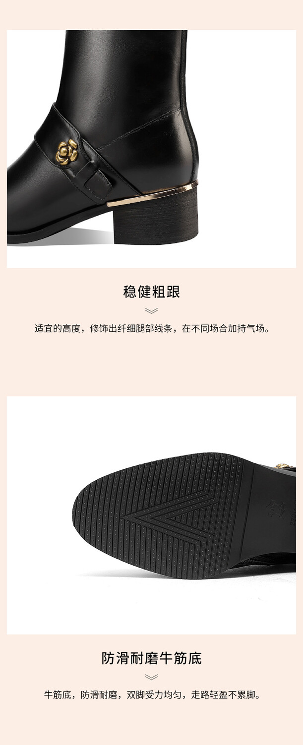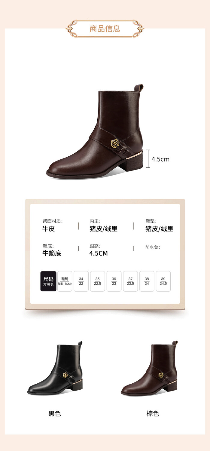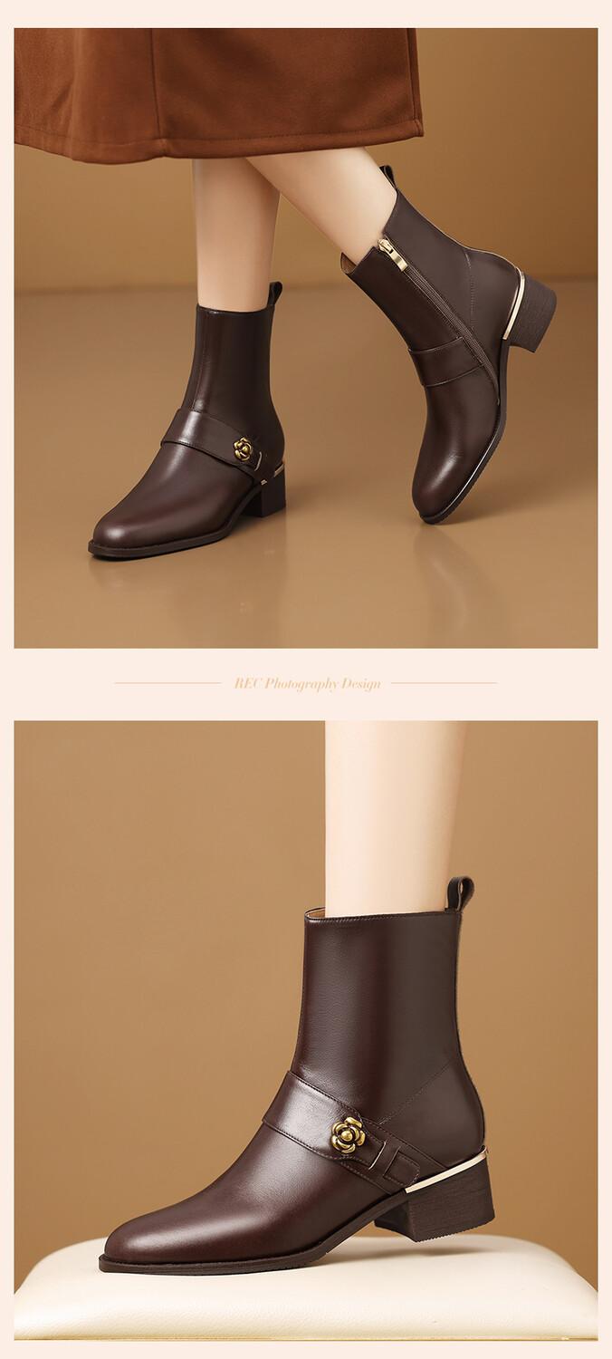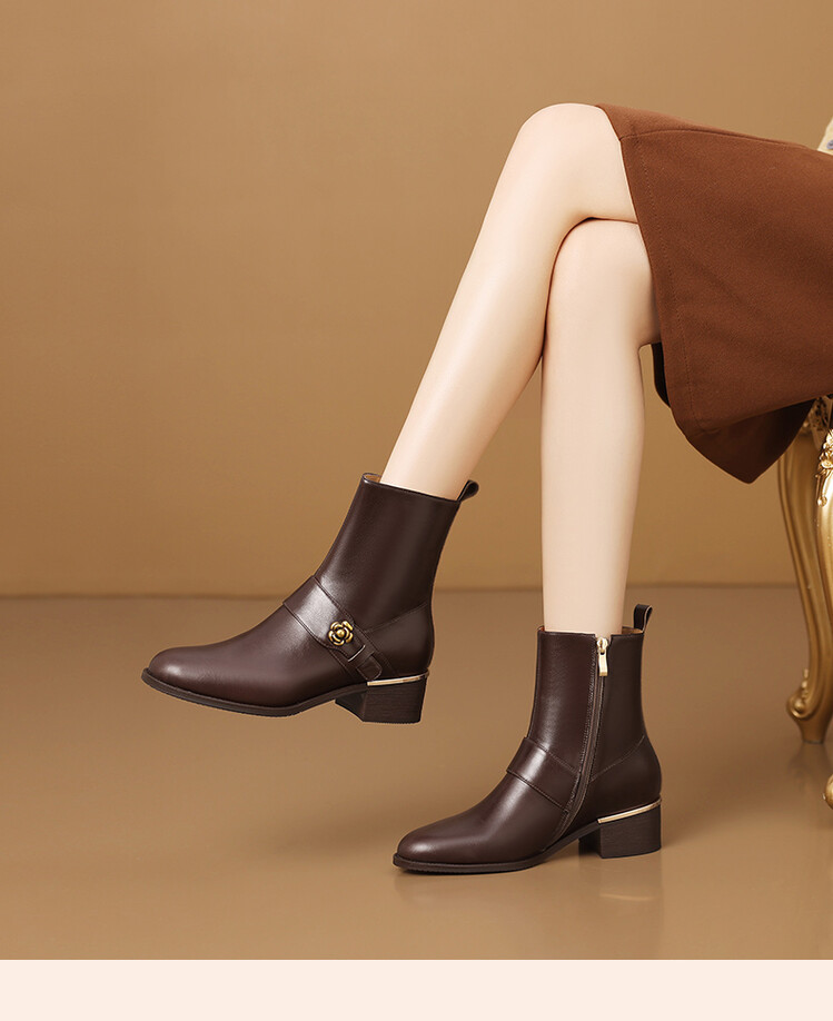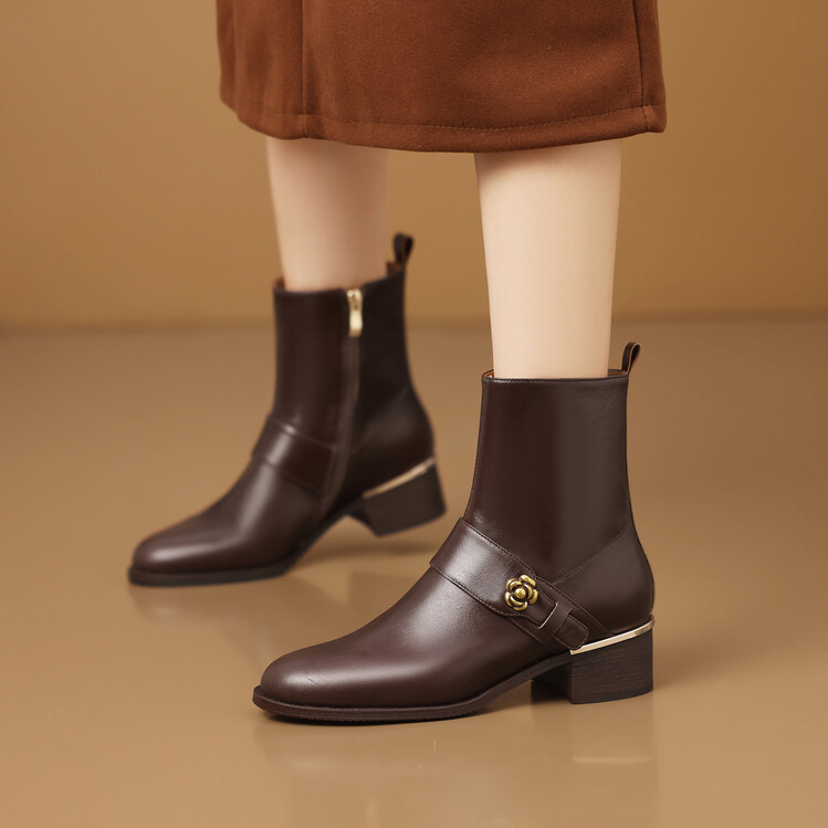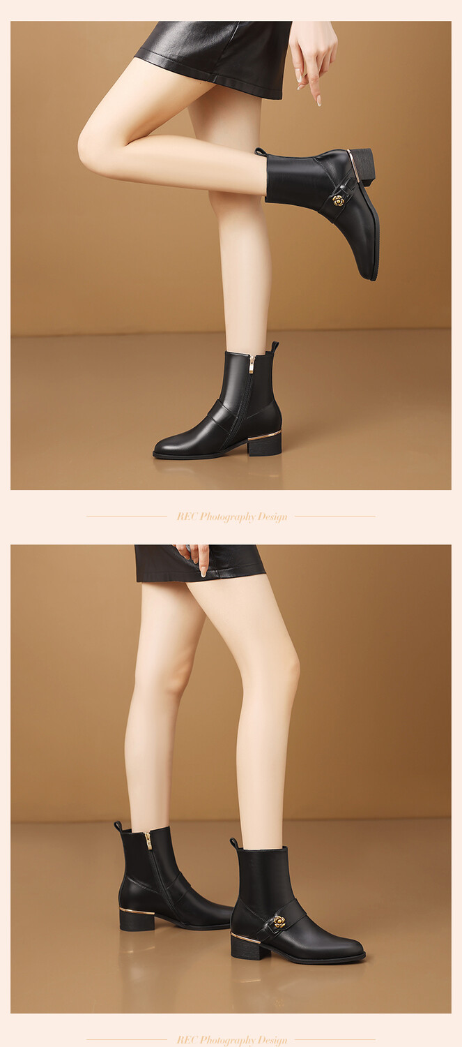 【预售5天】百搭时装靴秋冬季新款靴子圆头粗跟女靴金属扣花朵小皮靴牛皮短靴HY&H3544