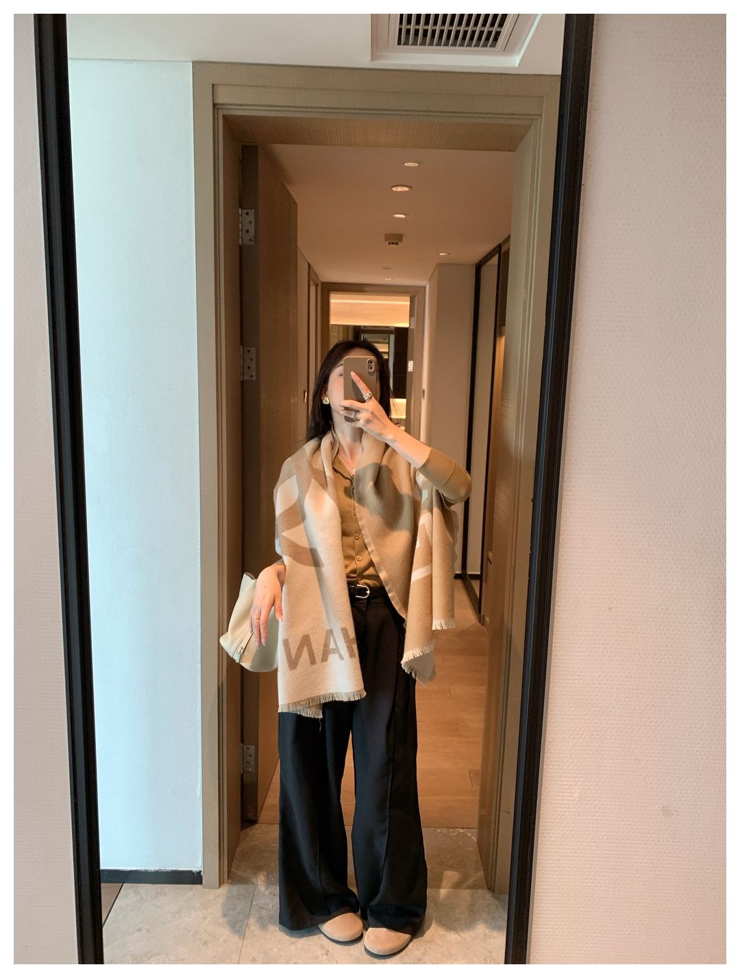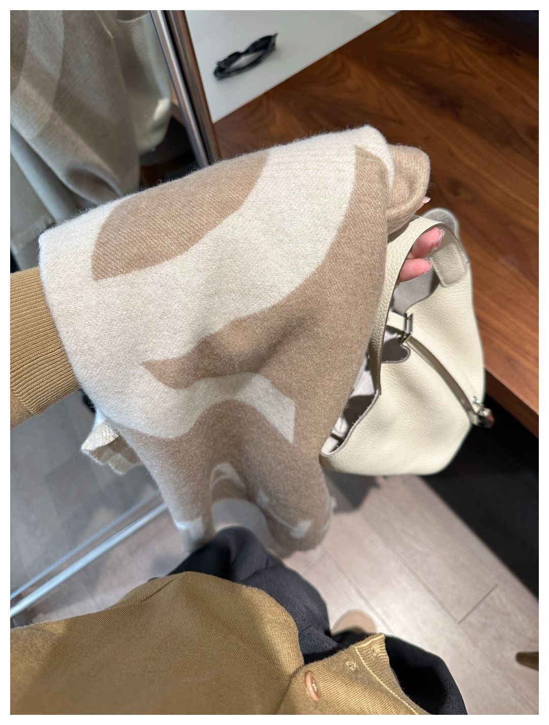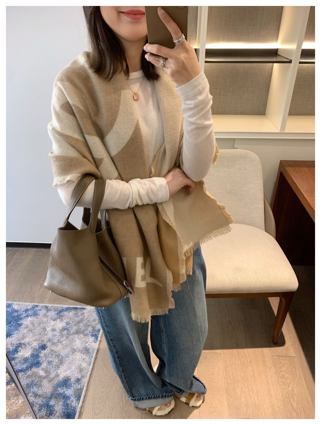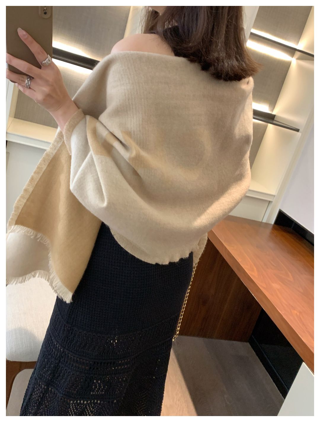 双色结合过度形成渐变 logo 清晰可见 两面都可以用哈! 属于大尺寸 170x60cm大尺寸 披肩围都可以!!