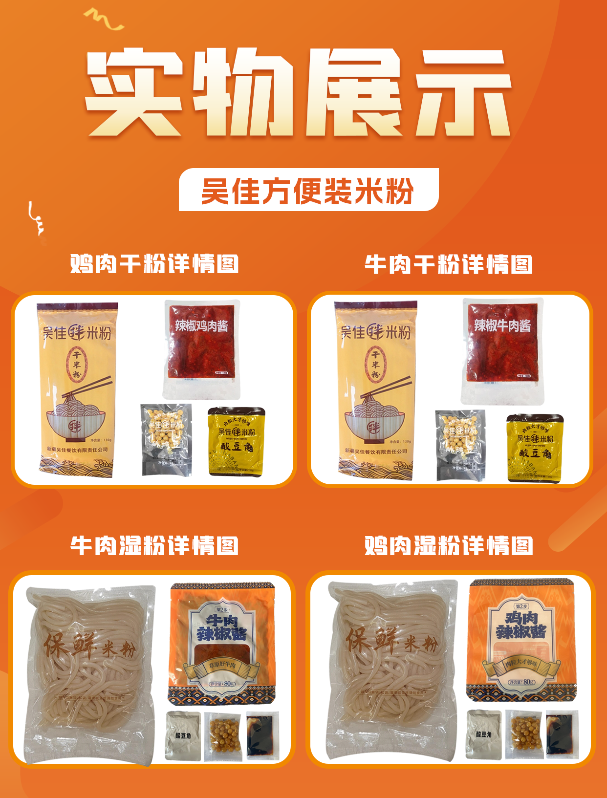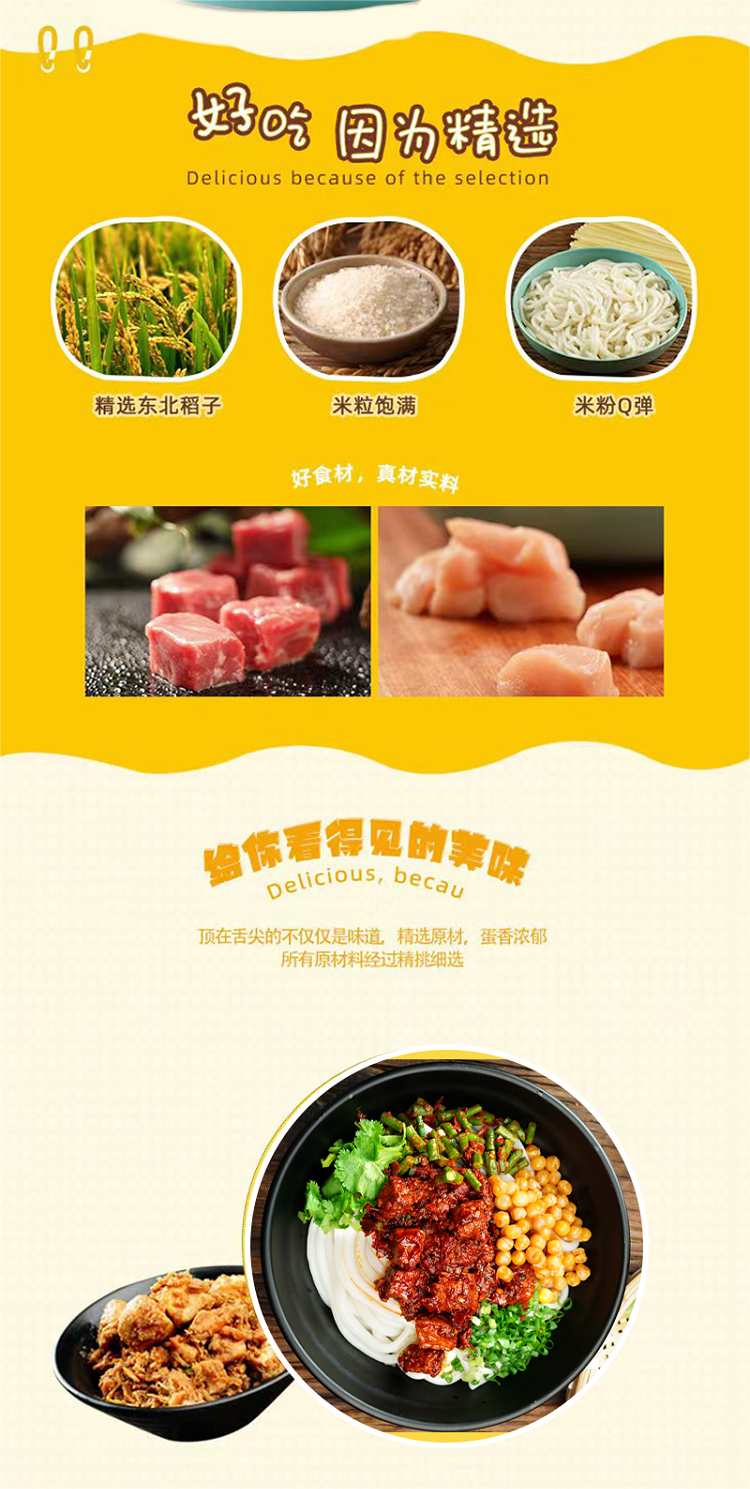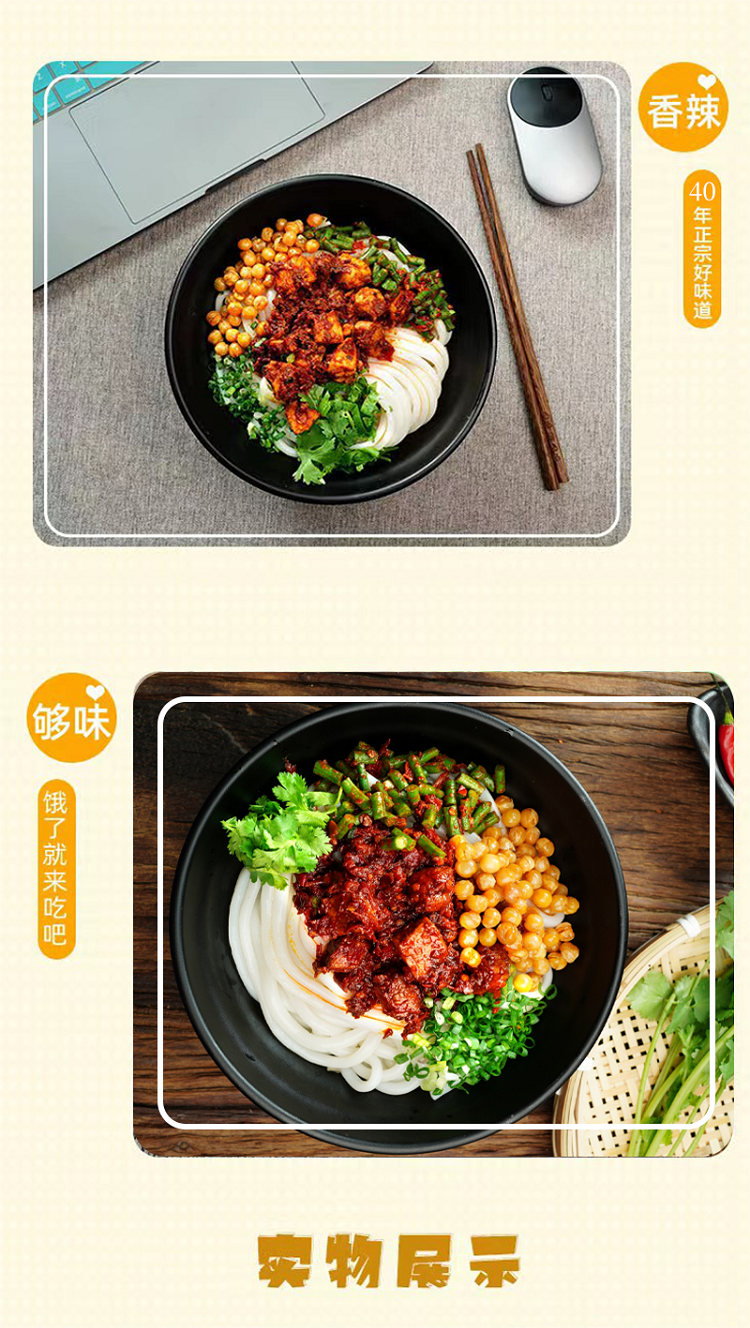 本产品规格:鸡肉酱包80克*2包+牛肉酱包80克*2包+湿粉240克*4包+豆子15克*4包+酸豇豆20克*4包(本规格为4人的份量独立包装)