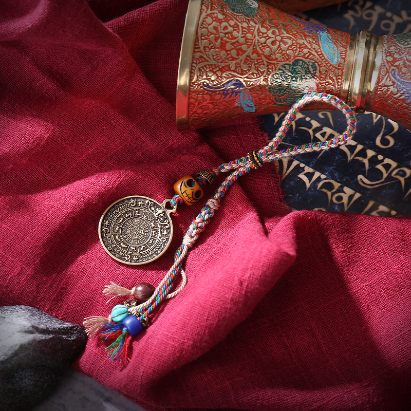 九宫八卦牌是唐卡斯巴霍的精髓结集,因为唐卡一般挂在室内,而九宫八卦牌即可随身携带,也可以挂于门上,非常方便。内圈是按龟背的九格,与汉地“戴九履一,二四为肩,六八为足,左三右七”一致,分为九数,第一宫为白色,坎卦;第二宫黑色,坤卦,第三宫绿色,震卦;第四宫碧色,巽卦;第五宫黄色,太极点;第六宫白色,干卦;第七宫赤色,兑卦;第八宫白色,艮卦;第九宫红色,离卦。相传源自西藏密宗开山祖师—莲花生大士的文殊九宫八卦图;聚集梵、藏、汉三地安居妙宝而成。