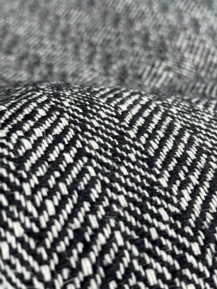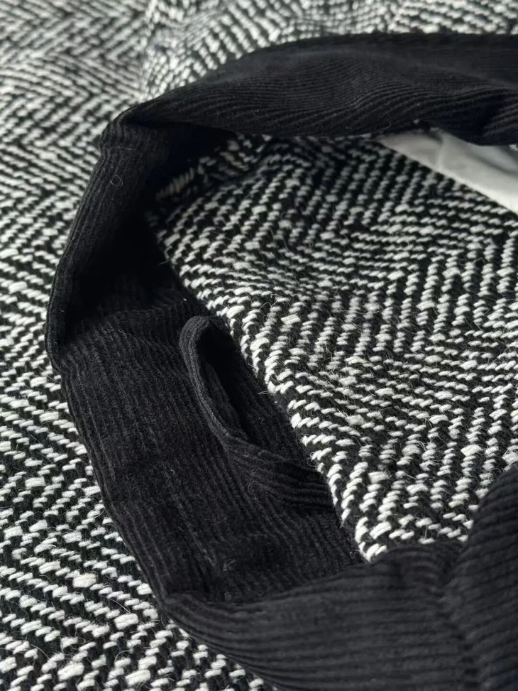 注意观察:咱们客供面料的人字纹,黑白交叉的白色,是带灰度的,接近灰米白,不是直愣愣的白,这样的配色才高级,视觉感受是柔和优雅的,而市面通货用直愣愣的白和黑色搭配,一下子档次就掉下来了。