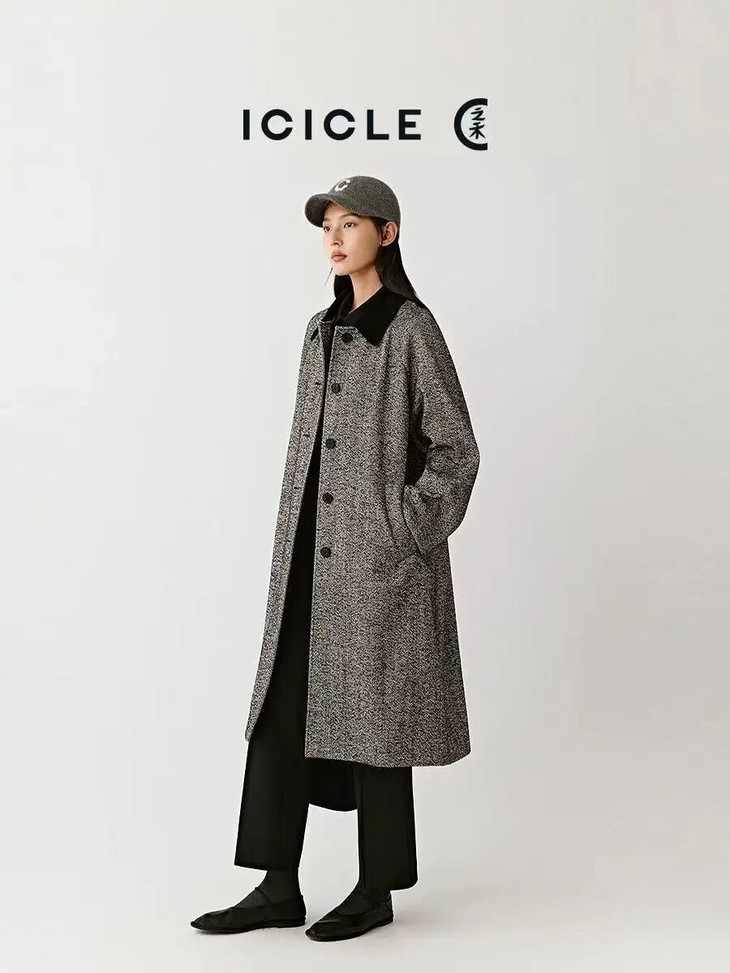 廓形设计为插肩袖的茧型大衣,不对身体进行紧密包裹,而是保留一丝空气感,看似宽松,其实有着巧妙的遮肉效果,中央微膨的造型能够自然修饰腹部与臀部线条,柔和曲线成为修饰身材的绝佳选择。