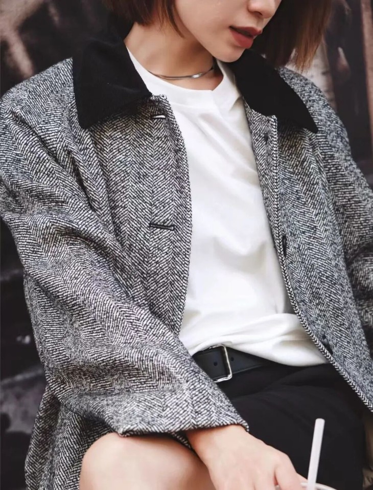 灯芯绒小翻领,是别致、知性的设计点,看起来格外文雅,撞色设计点亮整体造型,强化了大衣的结构感,成为点睛之笔。
