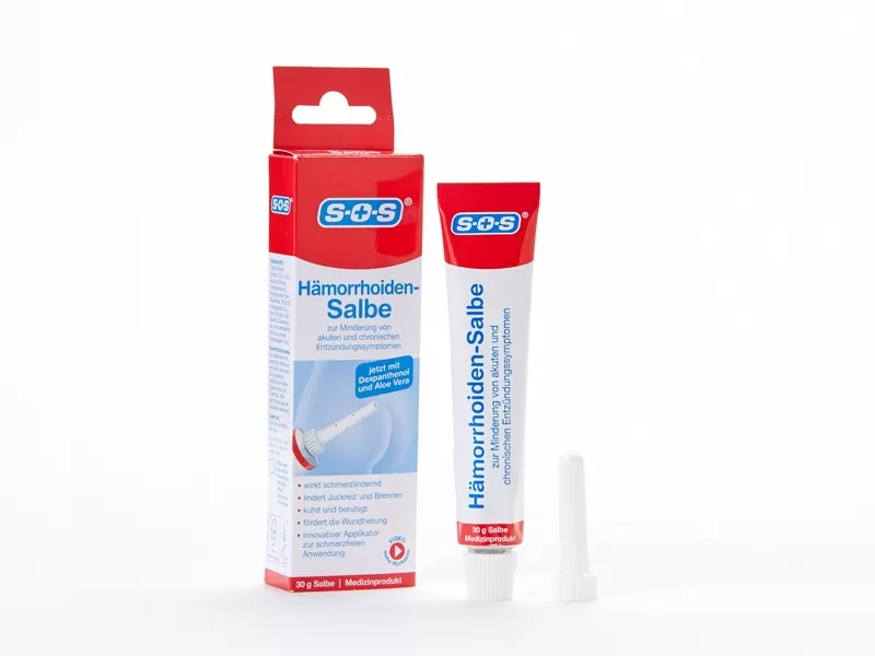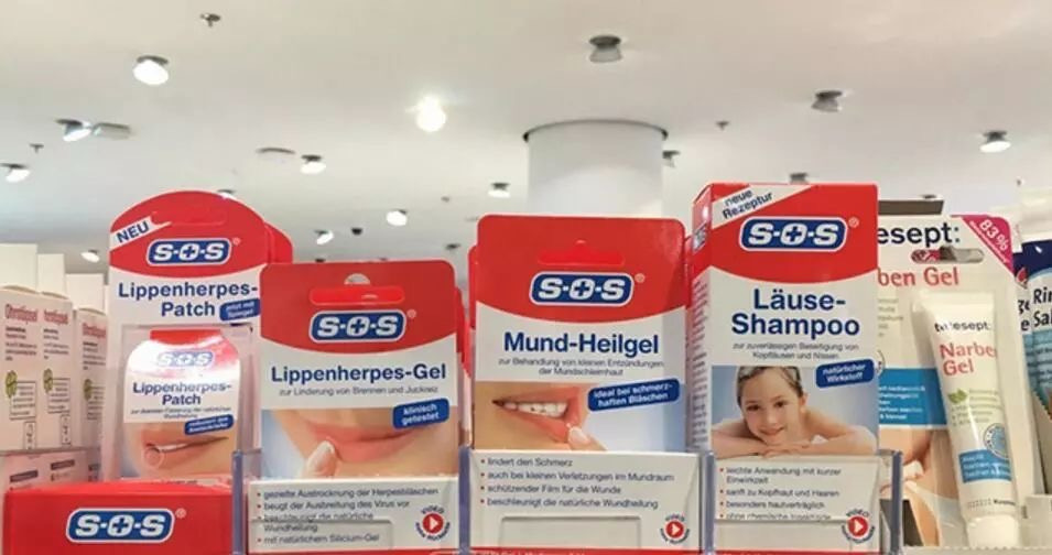 SOS是德国家喻户晓的个人健康护理品牌,欧洲将近95%的家庭都备有SOS的产品:痔疮膏、脚气水、口腔溃疡凝胶、液体创可贴等等。