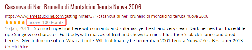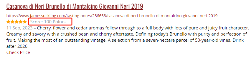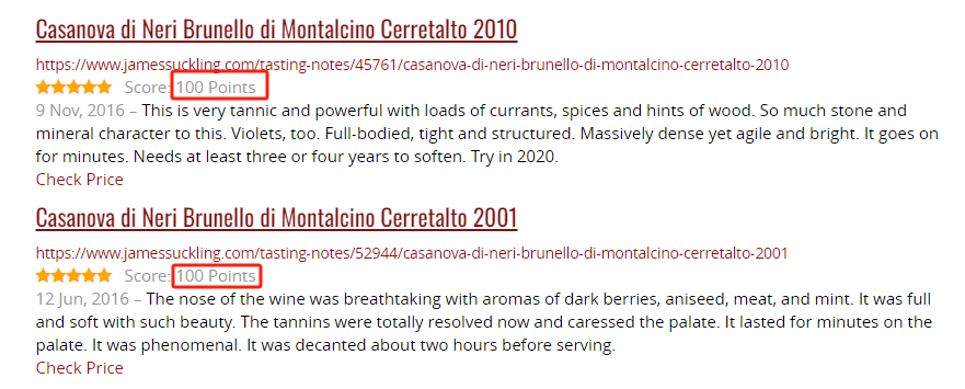 比如,WS 将 2001 年份 Tenuta Nuova 单一园布鲁奈罗旗舰干红选为“2006 年度之酒”,这也是 WS 历史上第 3 款获得此殊荣的意大利酒;2007 年,WS 给予 2001 年份的 Cerretalto 单一园布鲁奈罗旗舰干红 100 分。JS 本人对卡萨诺瓦酒庄的这几款单一园布鲁奈罗旗舰干红更是青睐有加,一共给予了 14 次 100 分(包含二次品鉴的分数)!