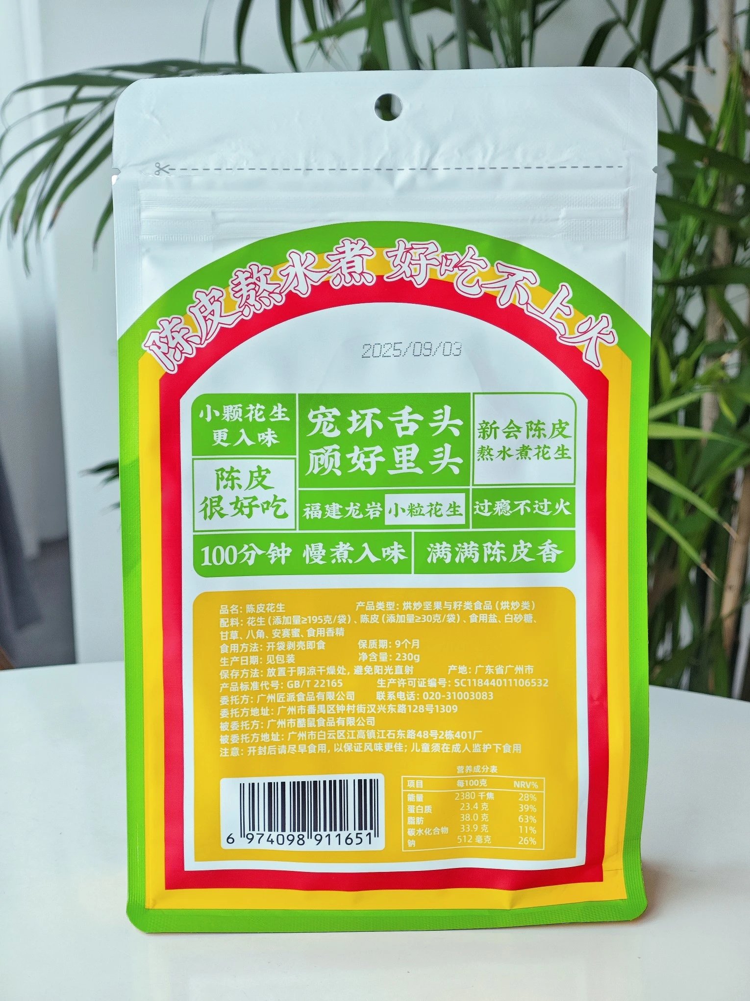 【名称】陈皮花生 【品牌】陈皮皮和朋友们 【规格】230g/包(200g花生+30g即食陈皮碎) 【适用人群+年龄段】年龄不限制,花生过敏者不可食用,三岁以下儿童需在成人监护下食用 【产地】广东省广州市 【保质期】9个月 【发货快递】默认申通、圆通 【发货地】广东广州 【发货时间】周一至周六是48小时内发货 【不发货地区】港澳台不发 【加运费地区】新疆、西藏、甘肃、青海、宁夏、内蒙+6元/件 【售后标准】 1.产品质量问题包退包换,收货48小时内带图和快递单号
