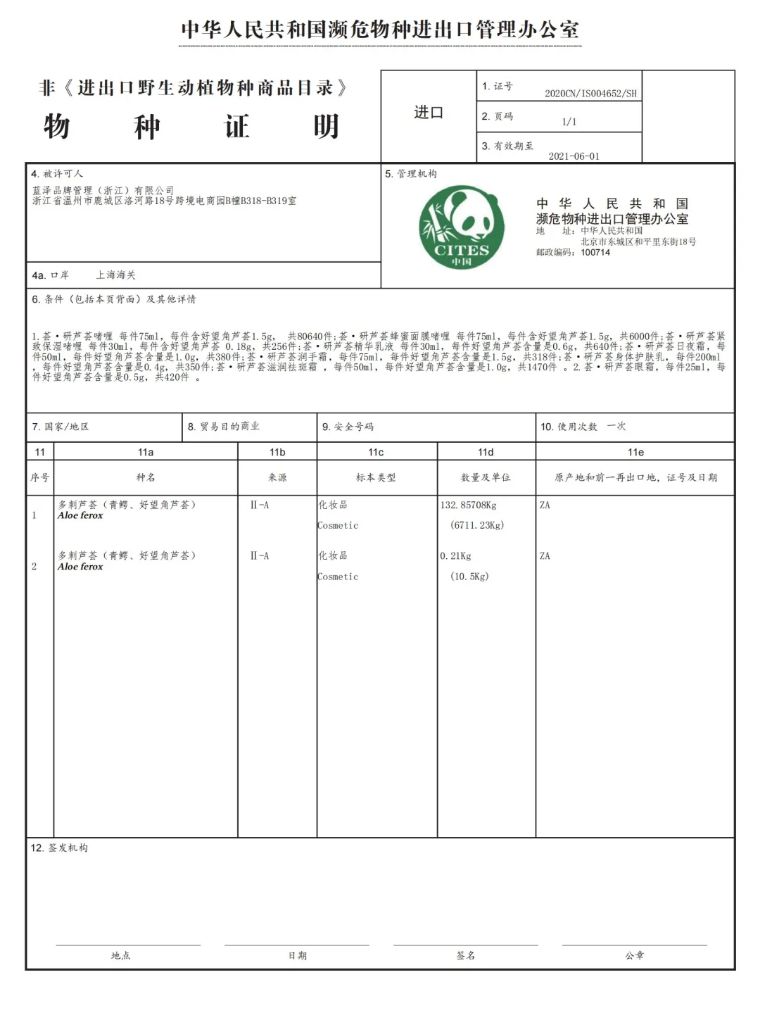 而且为防止该物种遭到濒危灭绝,南非当地严格限至其chu口量。出口到我们国家,还是经过了南非林叶局的出口许可,在国际的CITES公约组织备案,再到中国林叶局申请濒危进口许可,蕞终才能拿到一张印有中国大熊猫的许可证(这流程跟出借大熊猫一样困难繁琐),这款“大熊猫芦荟胶”,可以说是来之不易的。
