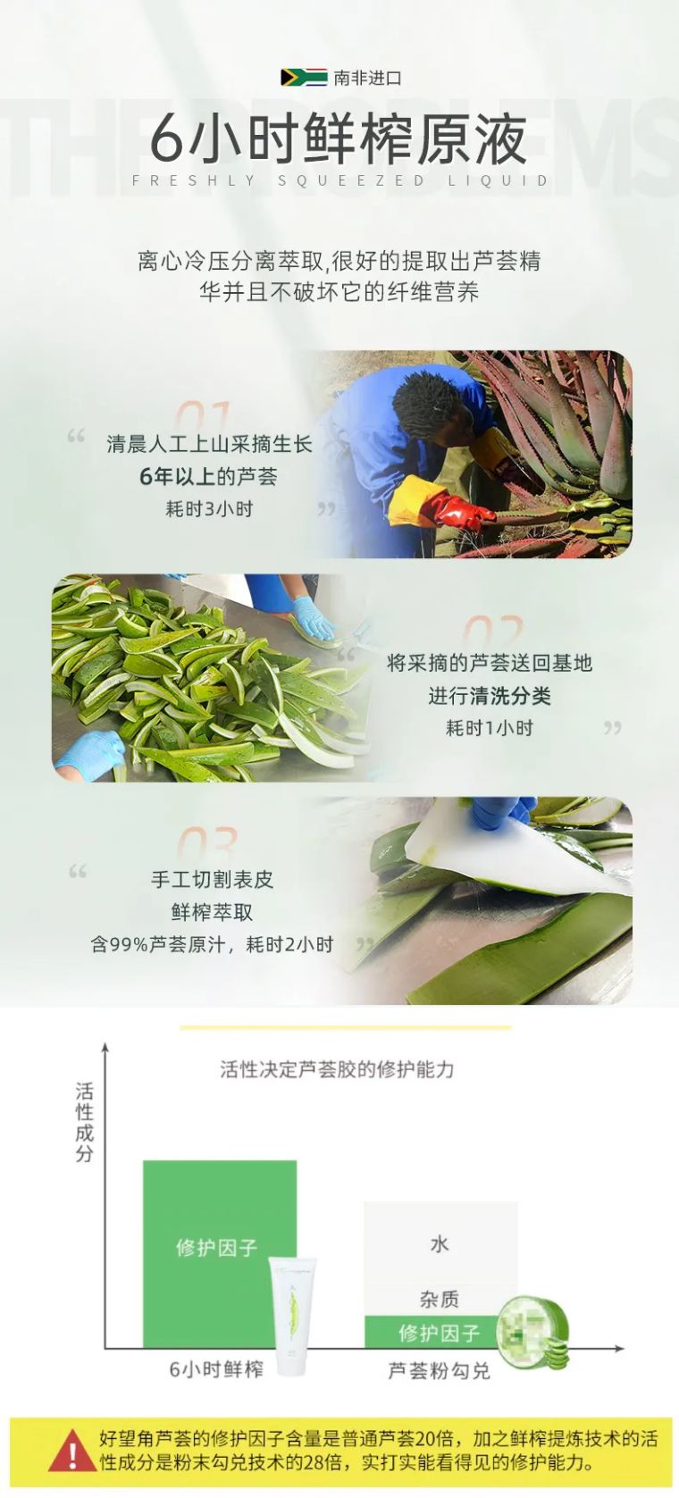 因为足够棒,所以足够珍贵,好望角芦荟在南非是濒危灭绝的。南非zf仅发放几张开采许可证,AMC正是其中一家能够正规开采的公司,每棵好望角芦荟树都有zf登记,而且只收割6年以上树龄的芦荟叶,避免该物种灭绝。