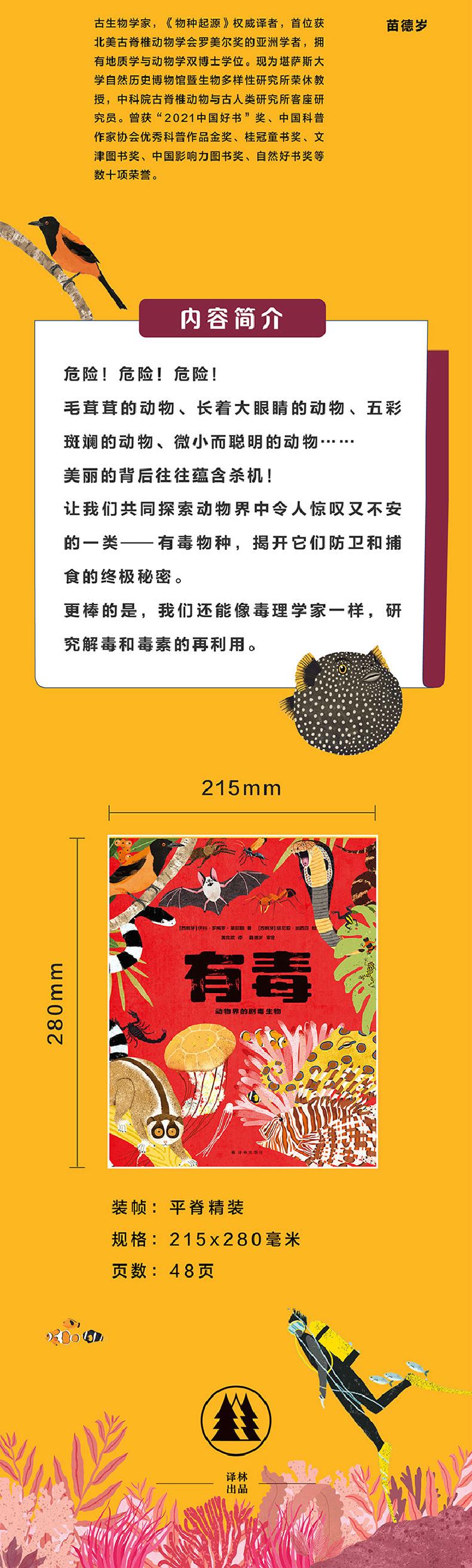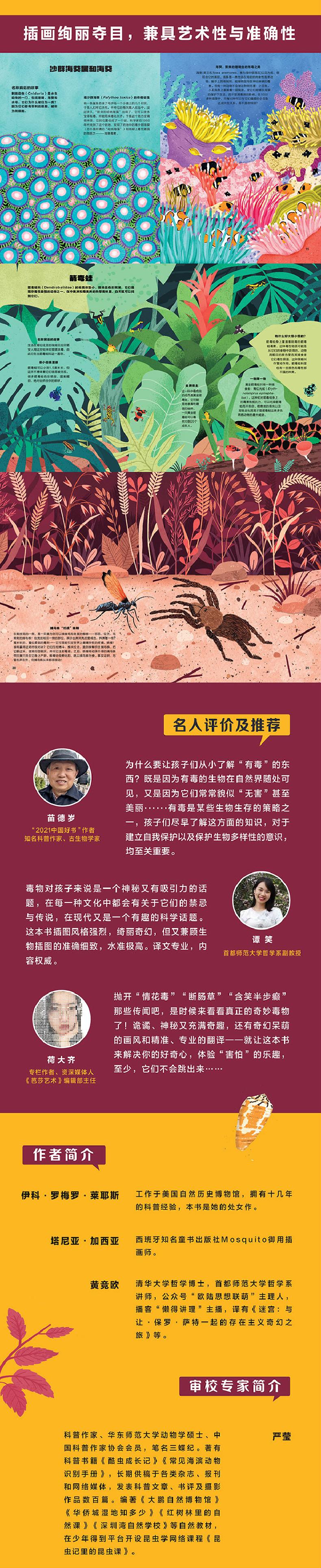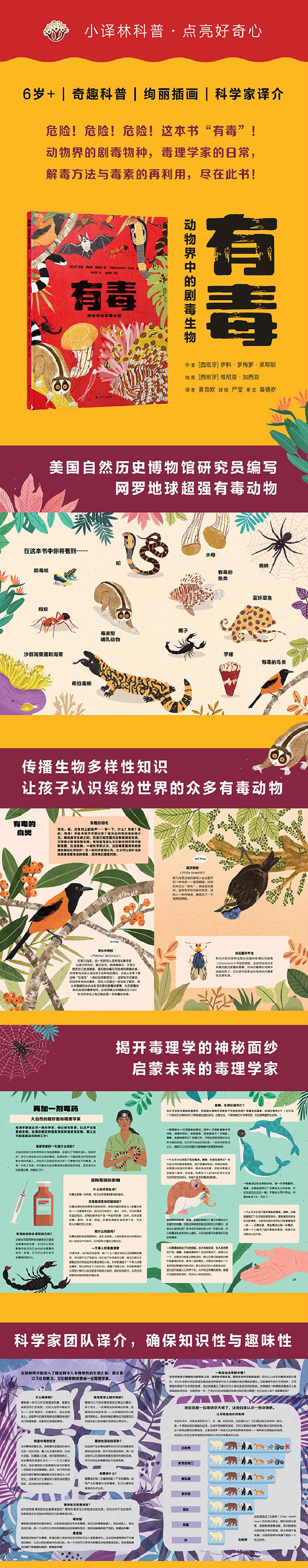 主题独特的奇趣科普;美国自然历史博物馆研究员编写,网罗地球超强有毒动物;传播生物多样性知识,让孩子认识缤纷世界的众多有毒物种;揭开毒理学的神秘面纱,启蒙未来的毒理学家;科学家团队译介,确保知识性与趣味性;插画绚丽,兼具艺术性与准确性