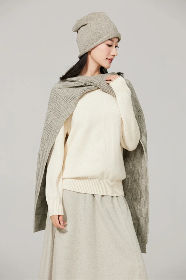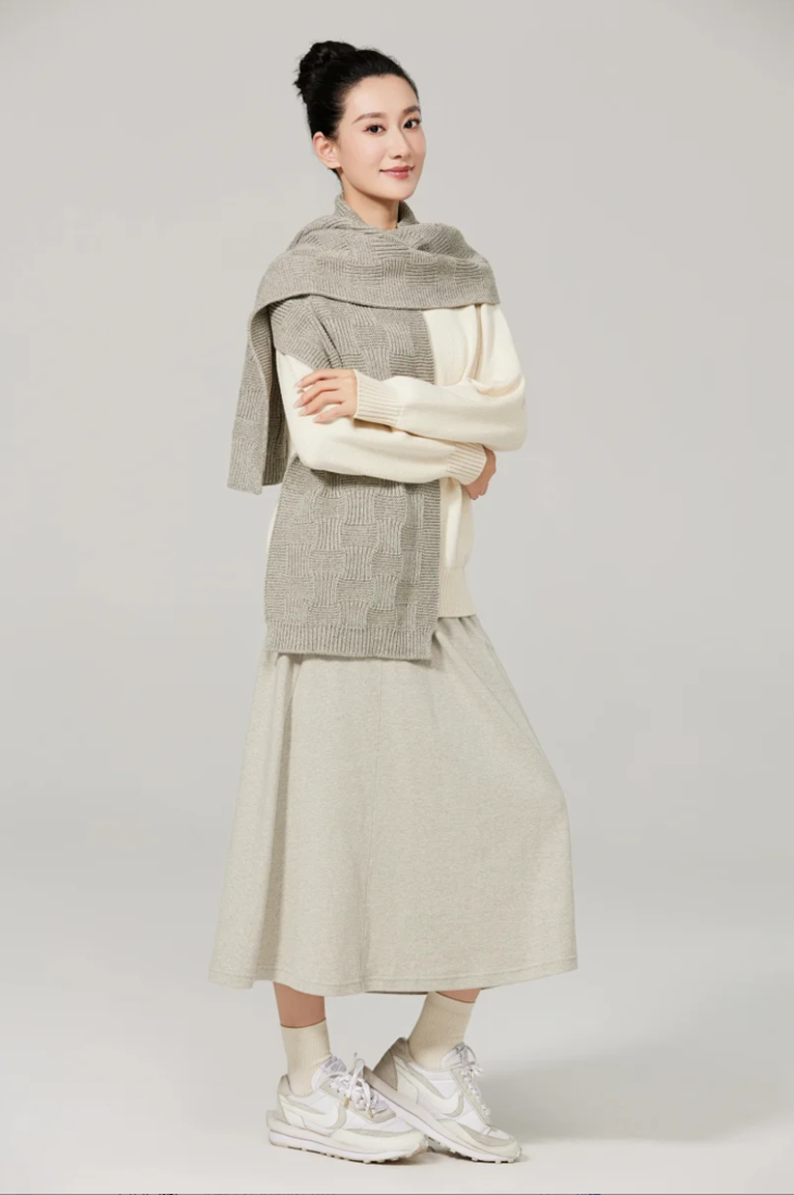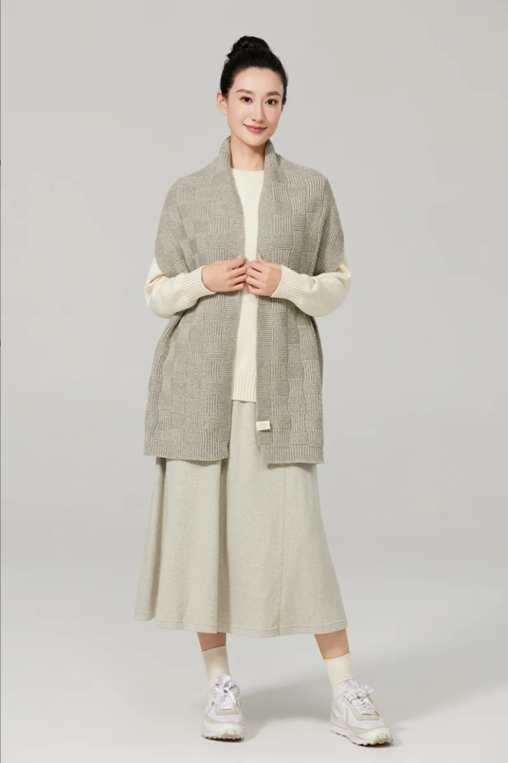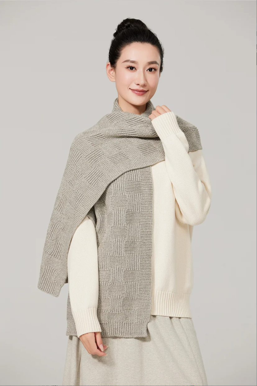 特选21支合股花灰纱线,柔软亲肤又有骨感,摸起来是那种软糯中带点韧劲的治愈触感。独创「错位格子织法」,通过经纬纱线错位交织,让围巾呈现出迷人的立体层次。远看有格纹的经典氛围,近看却藏着不规则的灵动细节!既保留了英伦风格的文艺感,又用高级灰叠加错位设计,营造出慵懒又优雅的日常氛围。