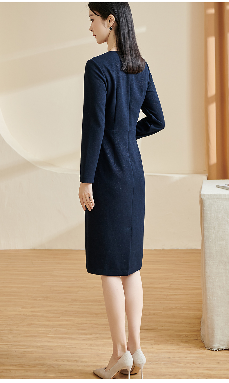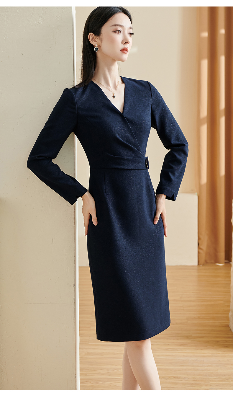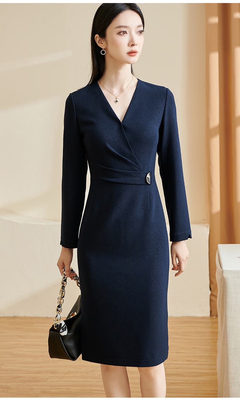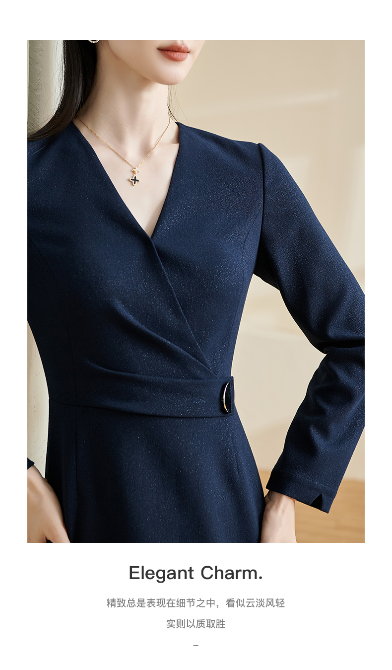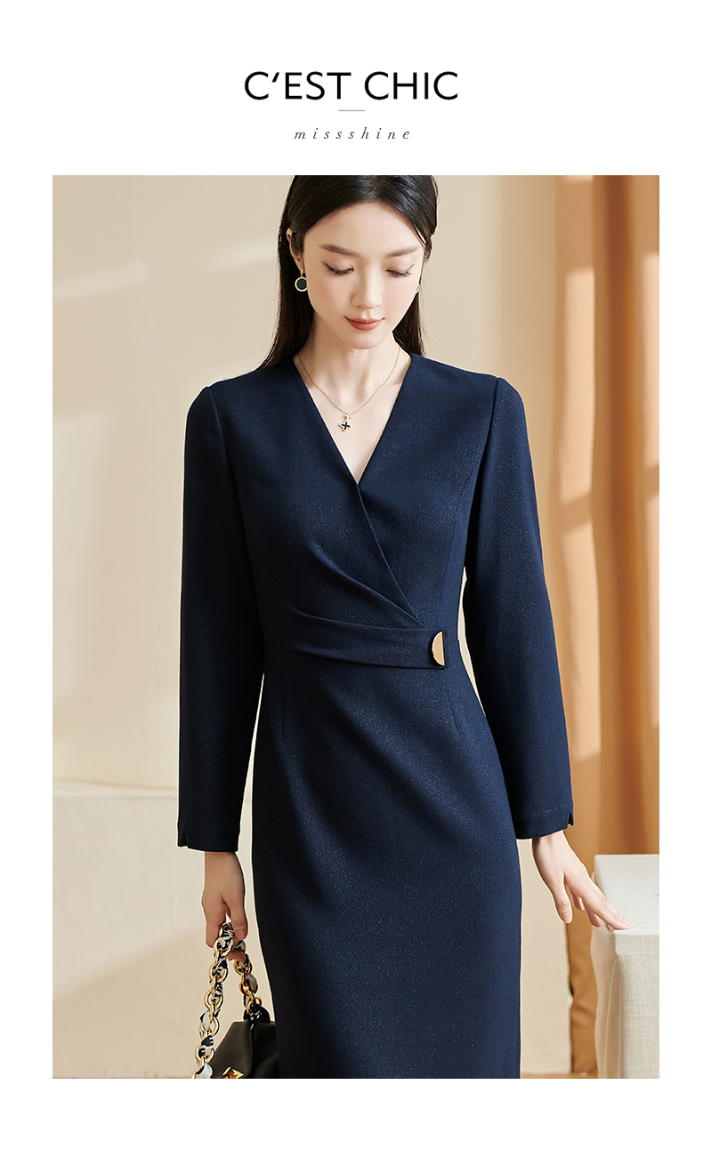 剩S/M/XL 米思阳2026春季新款通勤优雅收腰修身裙纯色长袖V领显瘦长裙2418