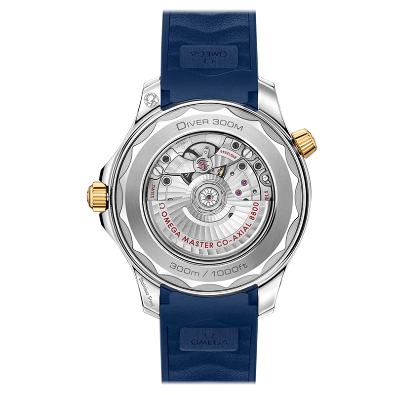 镜面材质 | 蓝宝石水晶玻璃 | 表盘 | 精钢-黄色18 K金表壳表壳 表圈采用蓝色陶瓷,潜水刻度经 OMEGA Ceragold®技术制成。表盘亦以抛光蓝色陶瓷制成,饰以激光镌刻波纹图案,6点钟位置设有日历窗口。 镂空指针和浮雕小时刻度由黄色18K金制成,并覆以白色Super-LumiNova夜光涂层,而排氦气阀门则以圆锥形造型呈现。 日期显示 防磁 背透 |