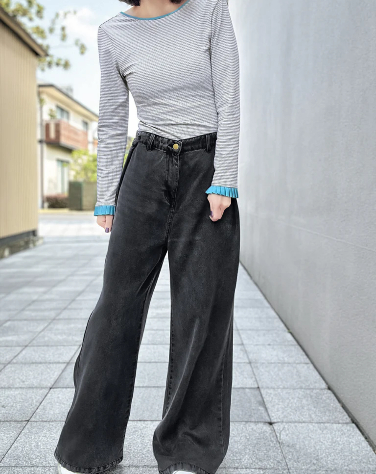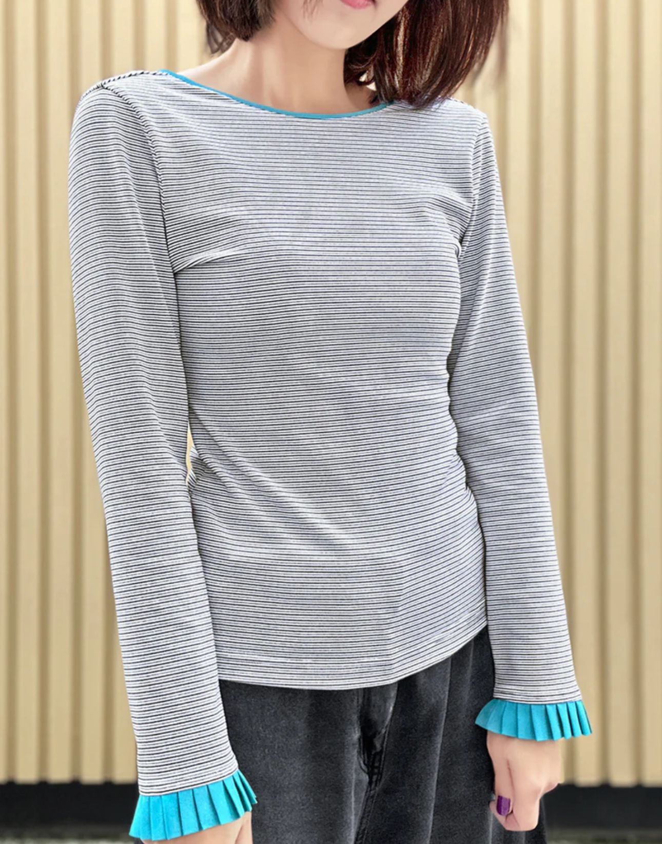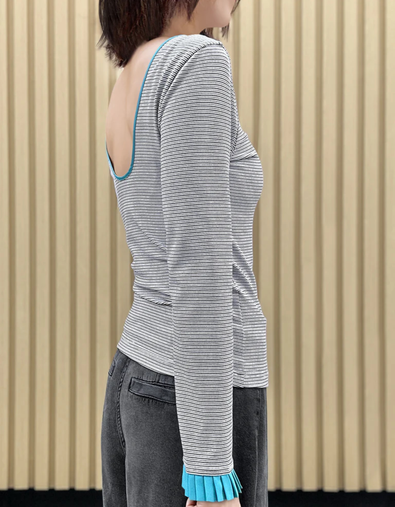 TYNVIE 排褶装饰袖口露背长袖上衣 - 蓝条纹