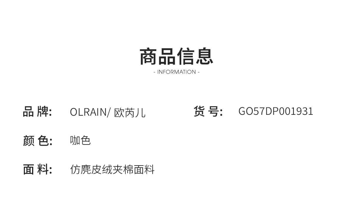 - “精致”是欧芮儿olrain品牌文化的核心,欧芮儿认为,精致的女人,不但要外在动人,更要内在迷人,内外兼修,有魅力、有气质、有内涵,自信而不自傲,优雅而不矫揉,自有万种风情而不轻浮,更不故作矜持。