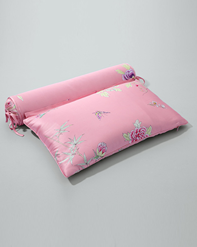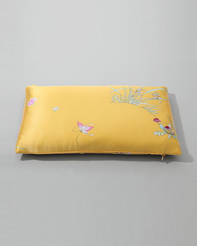 采用柔滑轻盈的桑蚕丝面料,搭配满庭芳的图案,含有幸福美满的寓意,整体布局均衡大气。