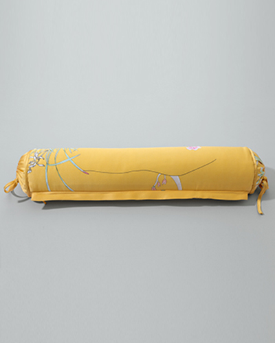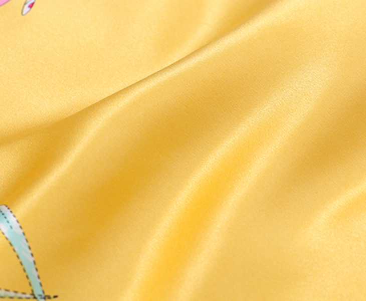 取自宋代词牌《满庭芳》,苏轼词有“江南好,千钟美酒,一曲满庭芳”句,晓色云开,赵粉,魏紫与姚黄竞芳菲,漫步庭院,顿觉春随人意的舒畅。繁花缀锦,彩蝶穿花,春光一派明媚,而春风过处,风摇翠竹,新绿溅溅,让人流连忘返,忘却归路。 此款印花图案,着色清雅,花卉姿态自然,强调了仿手绣的轻松笔触。