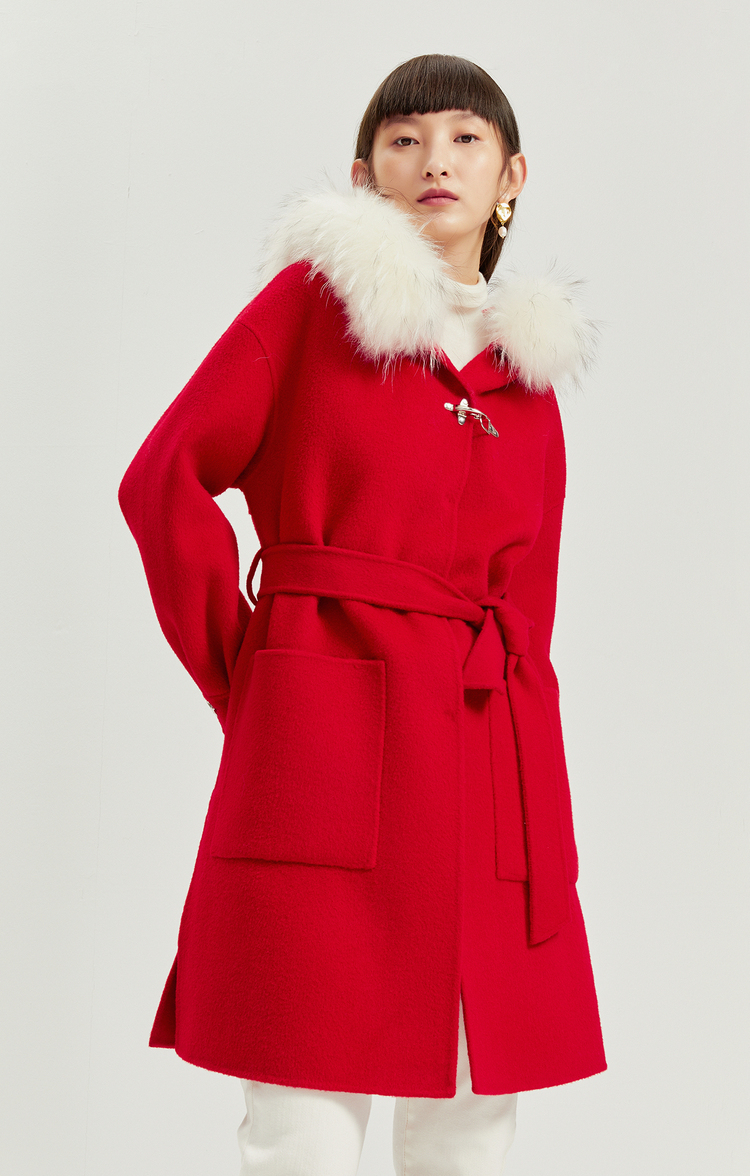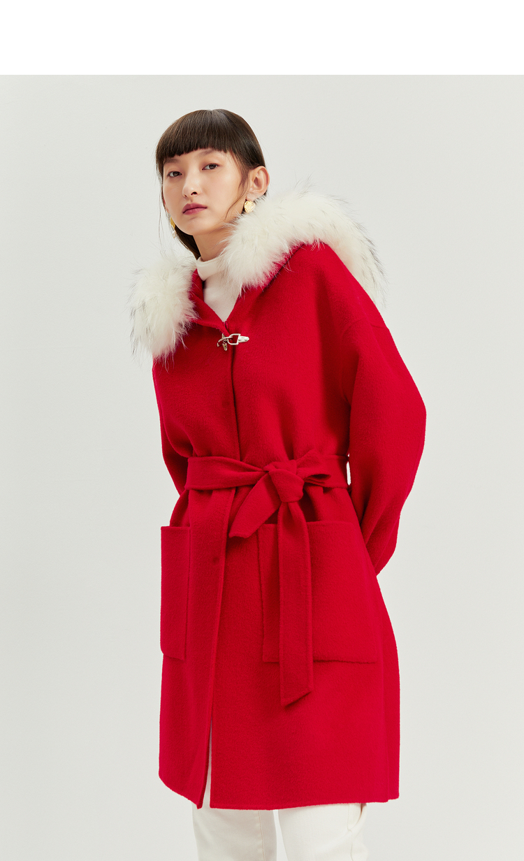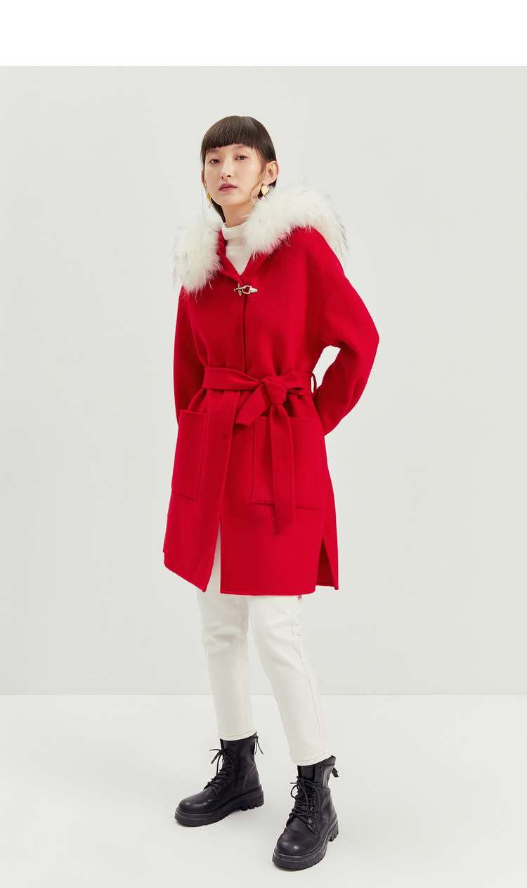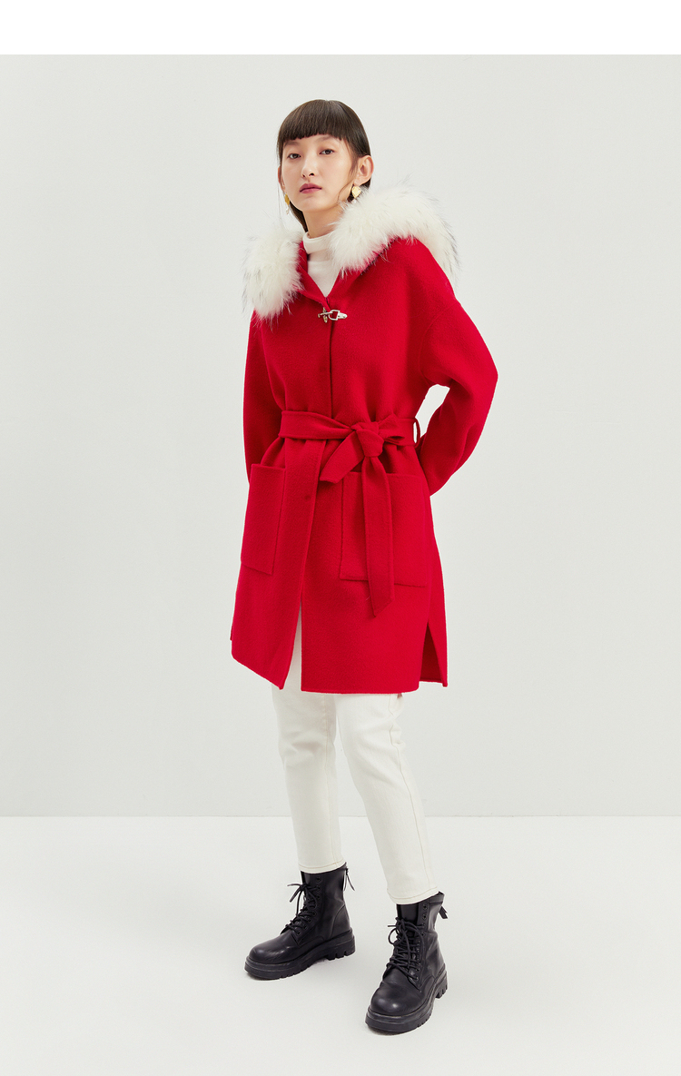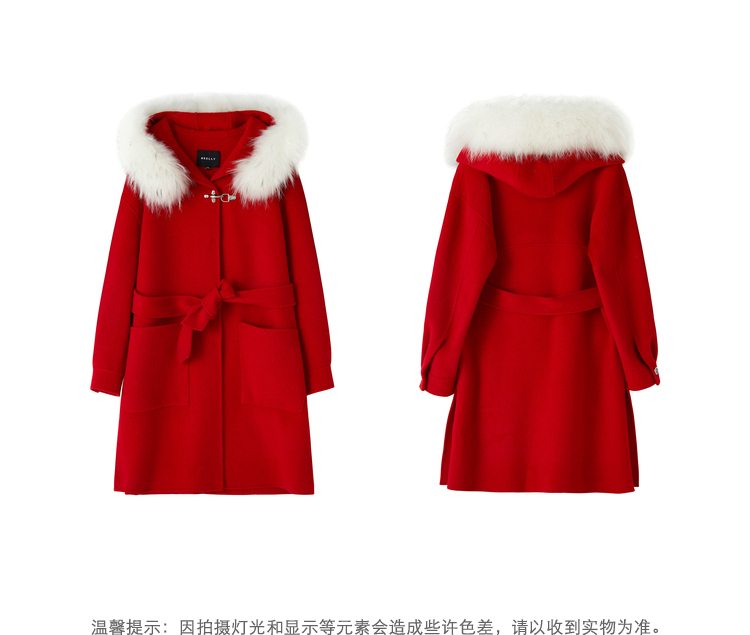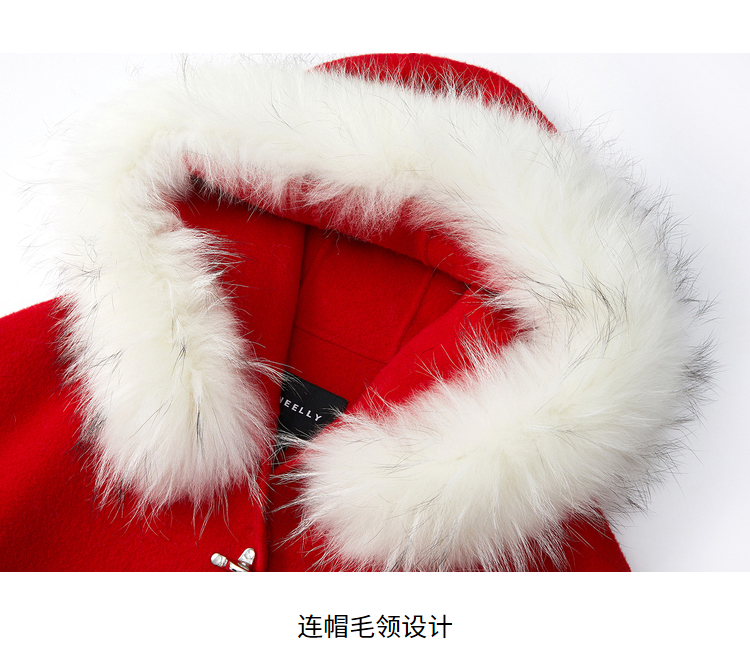 NEELLY纳俪冬季貉子大毛领连帽双面呢大衣女收腰系带外套保暖百搭N21121N01237