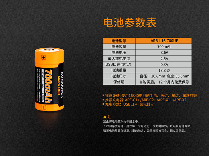 Fenix 菲尼克斯ARB-L16-700UP锂子USB充电动力电池 16340充电电池