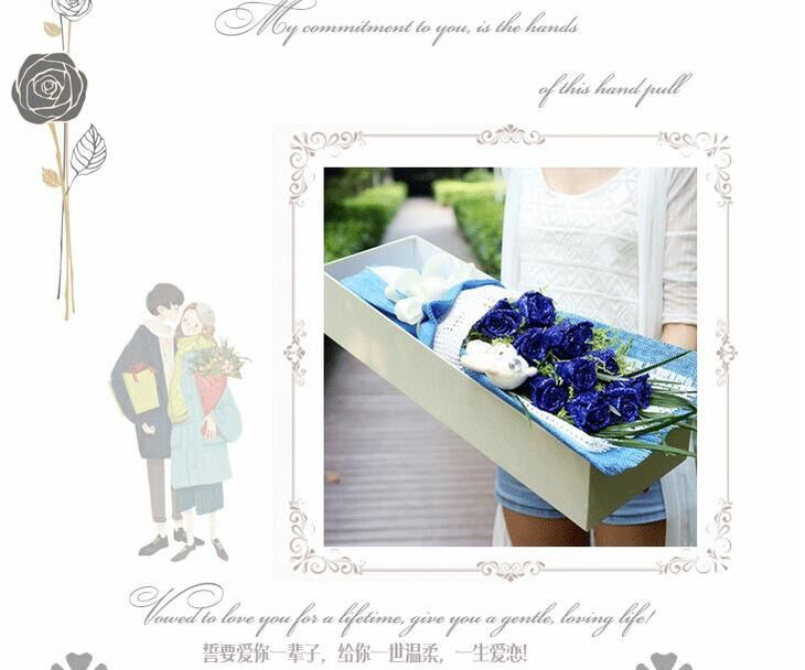 花材:11枝蓝玫瑰,点缀黄莺,剑叶适量托底,搭