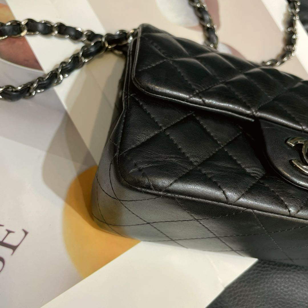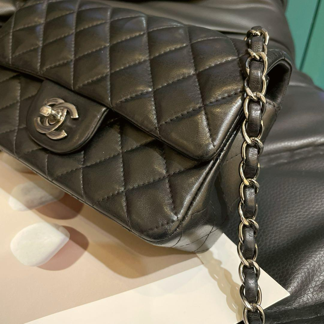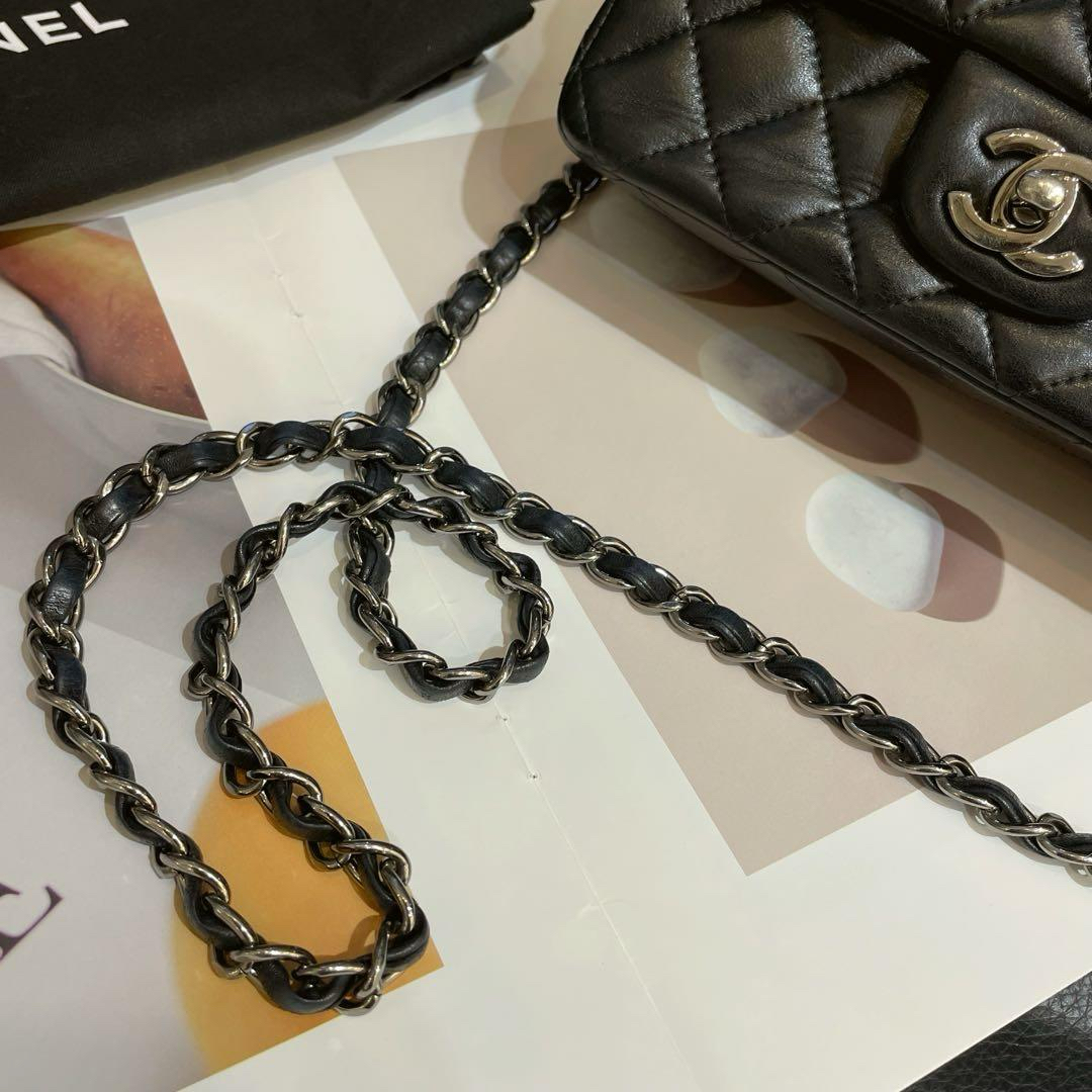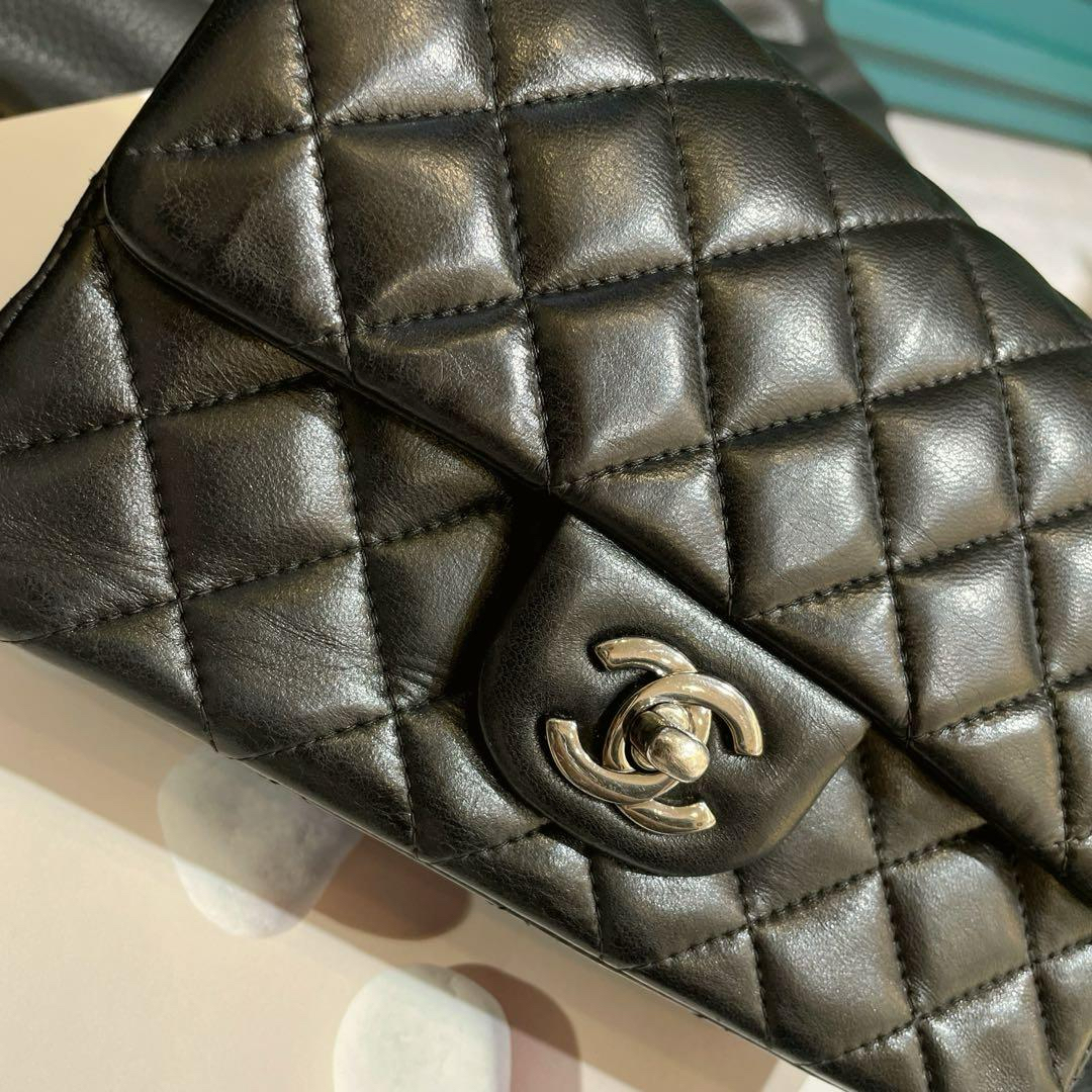 【商品详情】正品二手 Chanel CF 黑银 羊皮 大mini 链条包😍95新 19x11 镭射23开 配件:防尘袋。包面底部有正常使用纹路 边角轻微磨损。精致款小包 流通性好