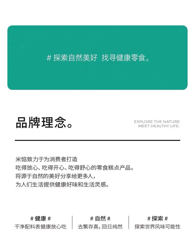 ✔米惦,以找寻和分享健康零食而来,秉持着低添加甚至无添加的产品理念,致力于为每个人提供更安心的美味。