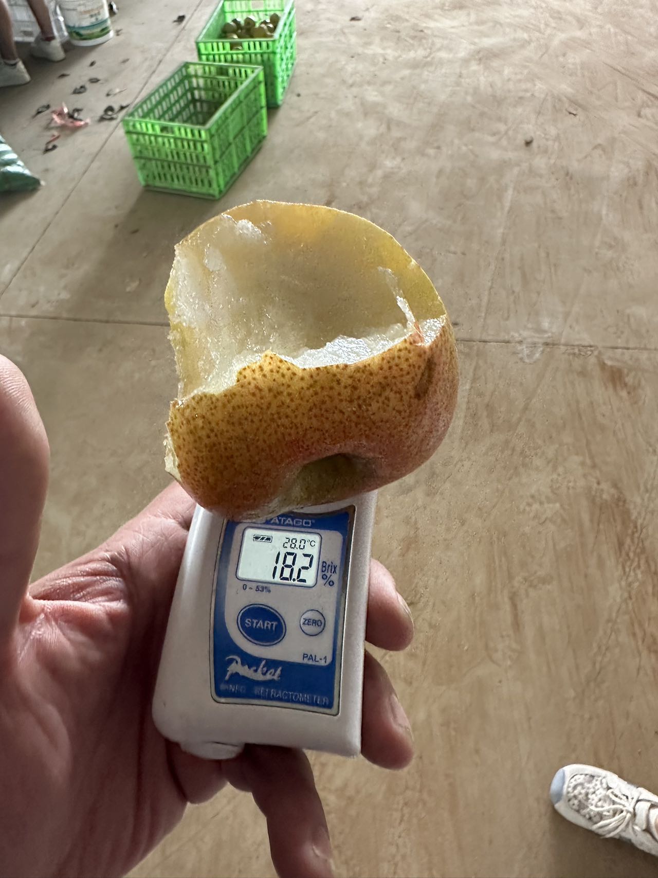 二代红梨,总是很大方的展示她的优点!红色的外表绝不会欺骗人的味觉!一般的梨糖度在12度以上就可以称之为优秀的梨,这款甜蜜炸弹!随测糖度都可达15度以上!