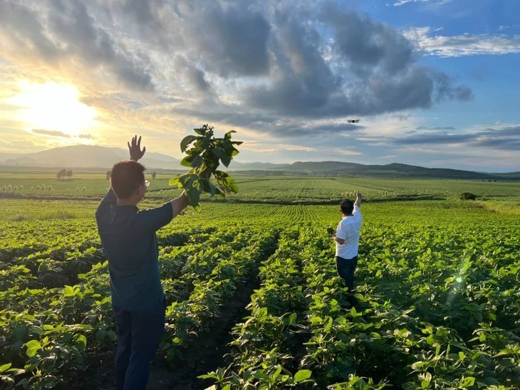 这片土地,杜绝使用传统农药化肥,使用的是富碳生态农业技术,双色豆的肥料,是用100多种草药配制而成的,人都可以直接喝。