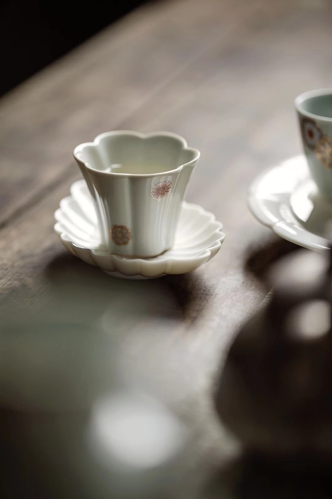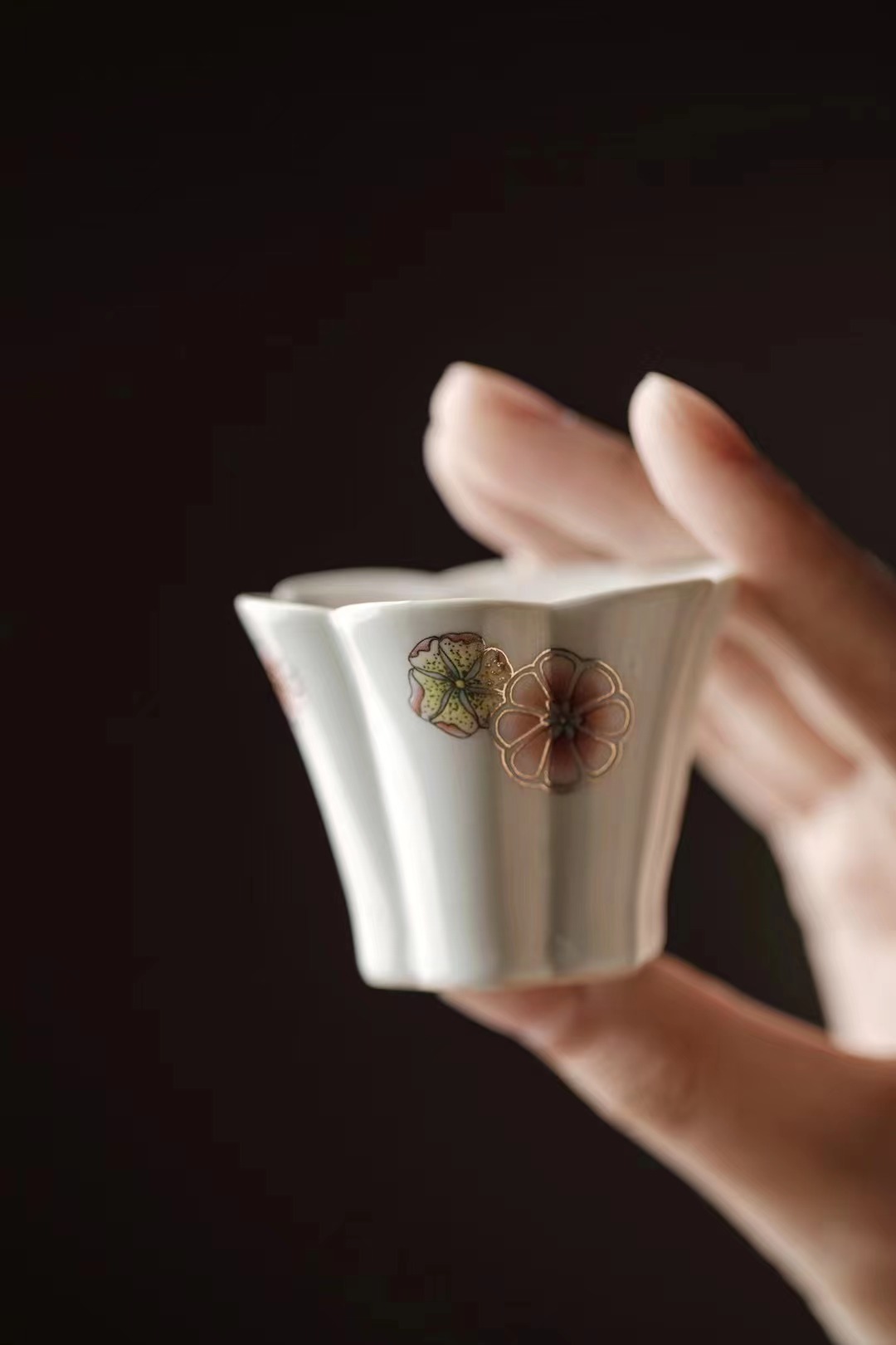 束刻 古青/海棠茶杯 口径5.4cm 高4.5cm 满容30ml 古青手绘兰花绣球花茶杯文人器功夫茶具海棠茶杯花口小品茗杯
