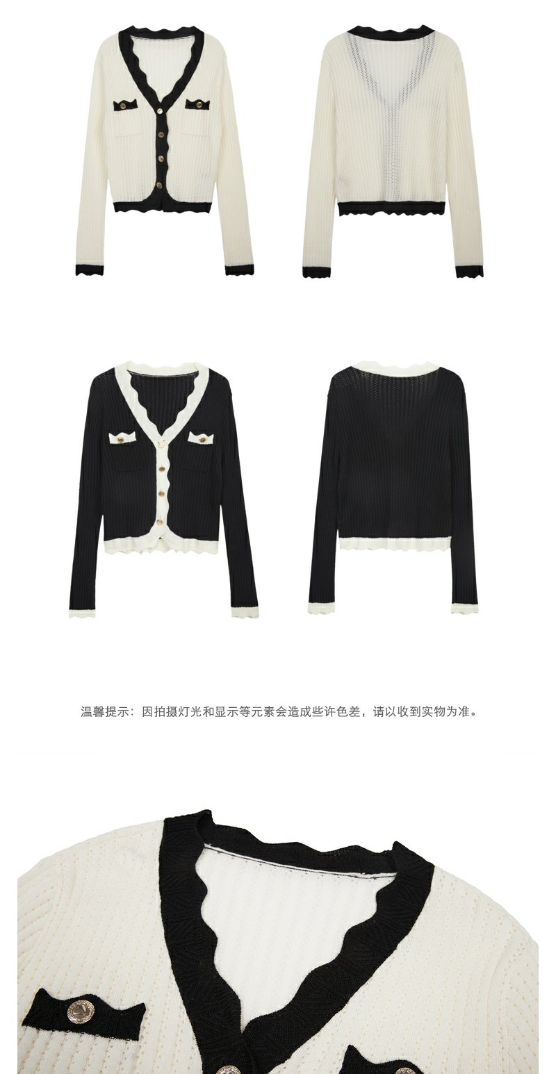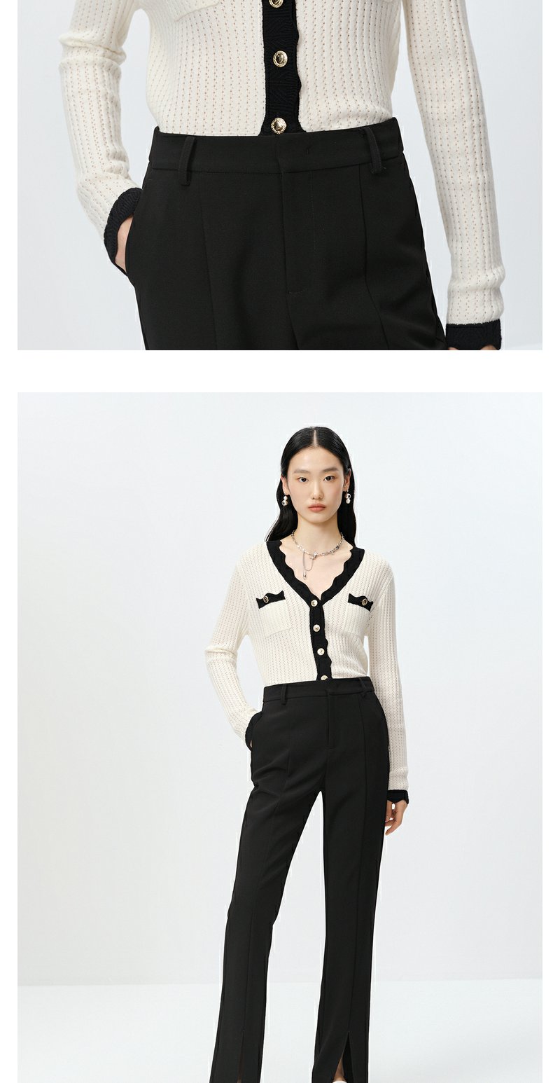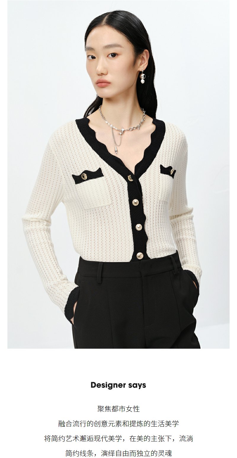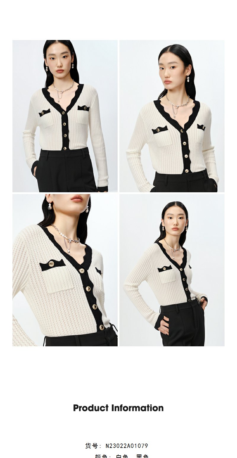 NEELLY纳俪商场同款气质V领针织衫女撞色黑边单排扣开衫上衣时尚N23022A01079
