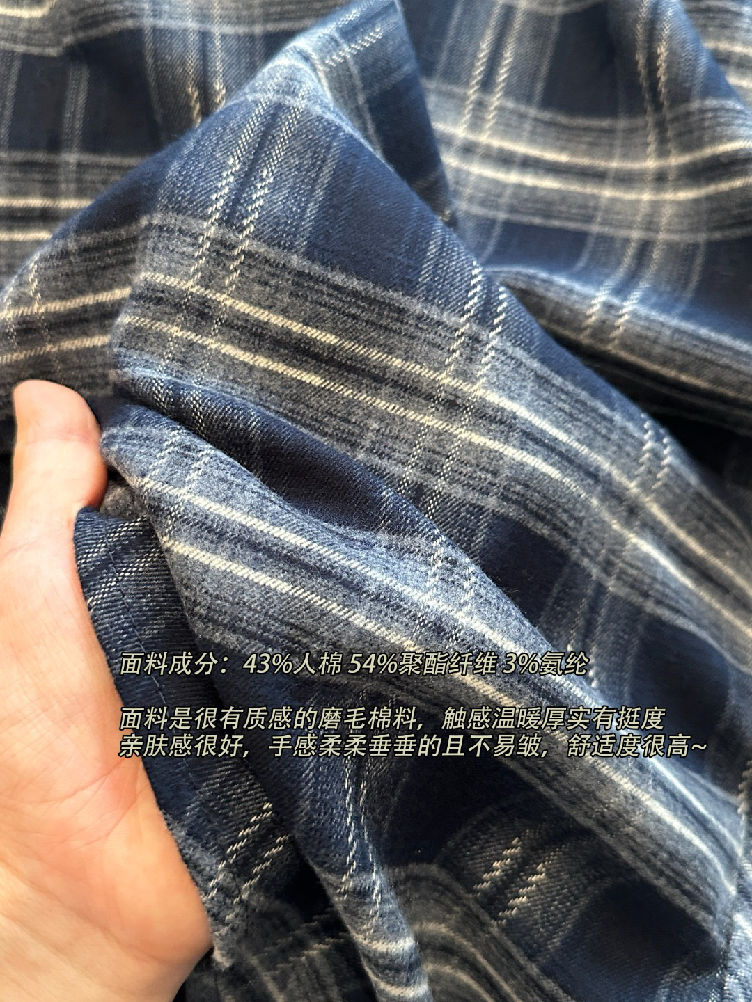 面料成分:43%人棉 54%聚酯纤维 3%氨纶面料是很有质感的磨毛棉料,触感温暖厚实有挺度,亲肤感很好,手感柔柔垂垂的且不易皱,舒适度很高~