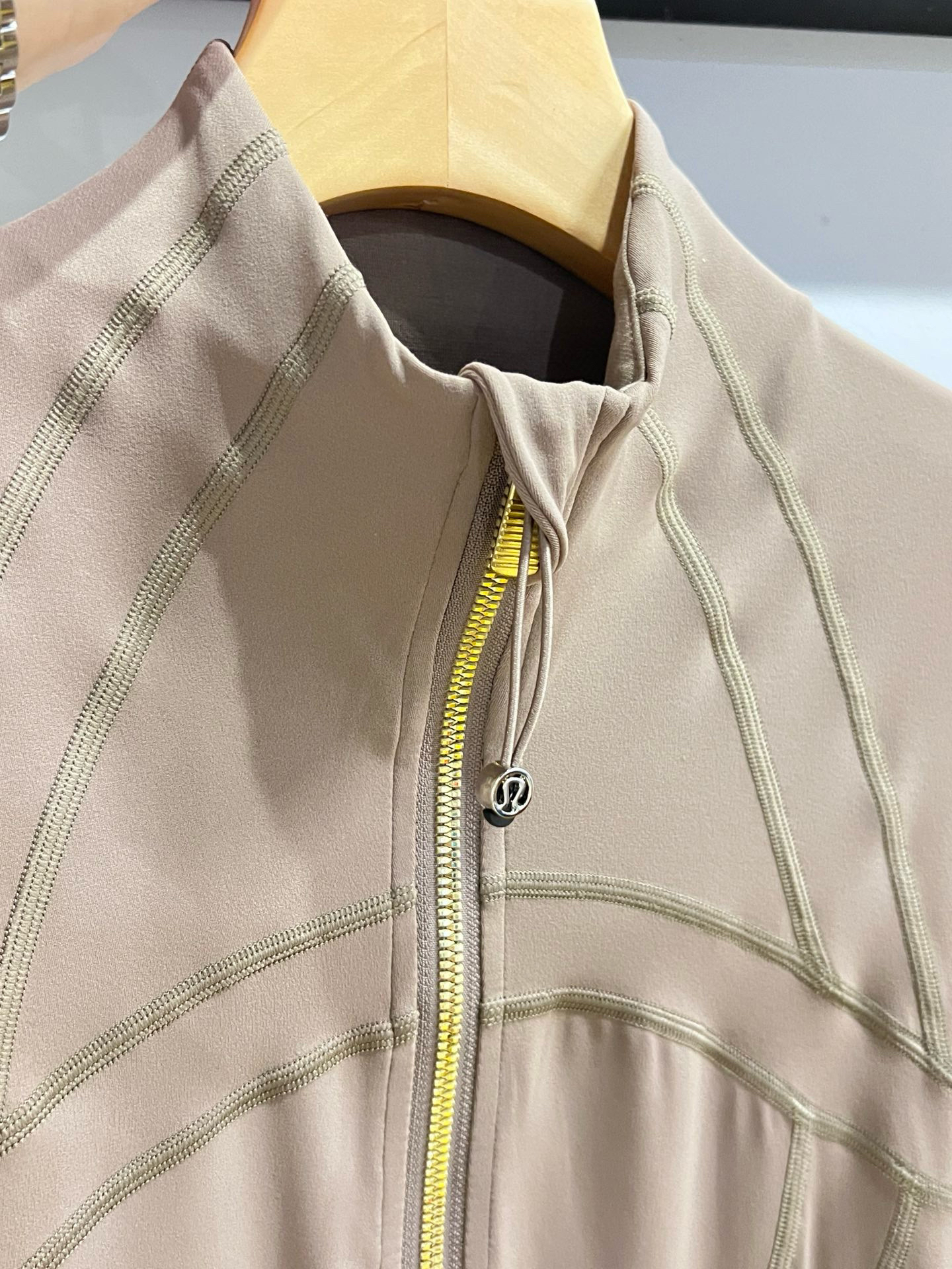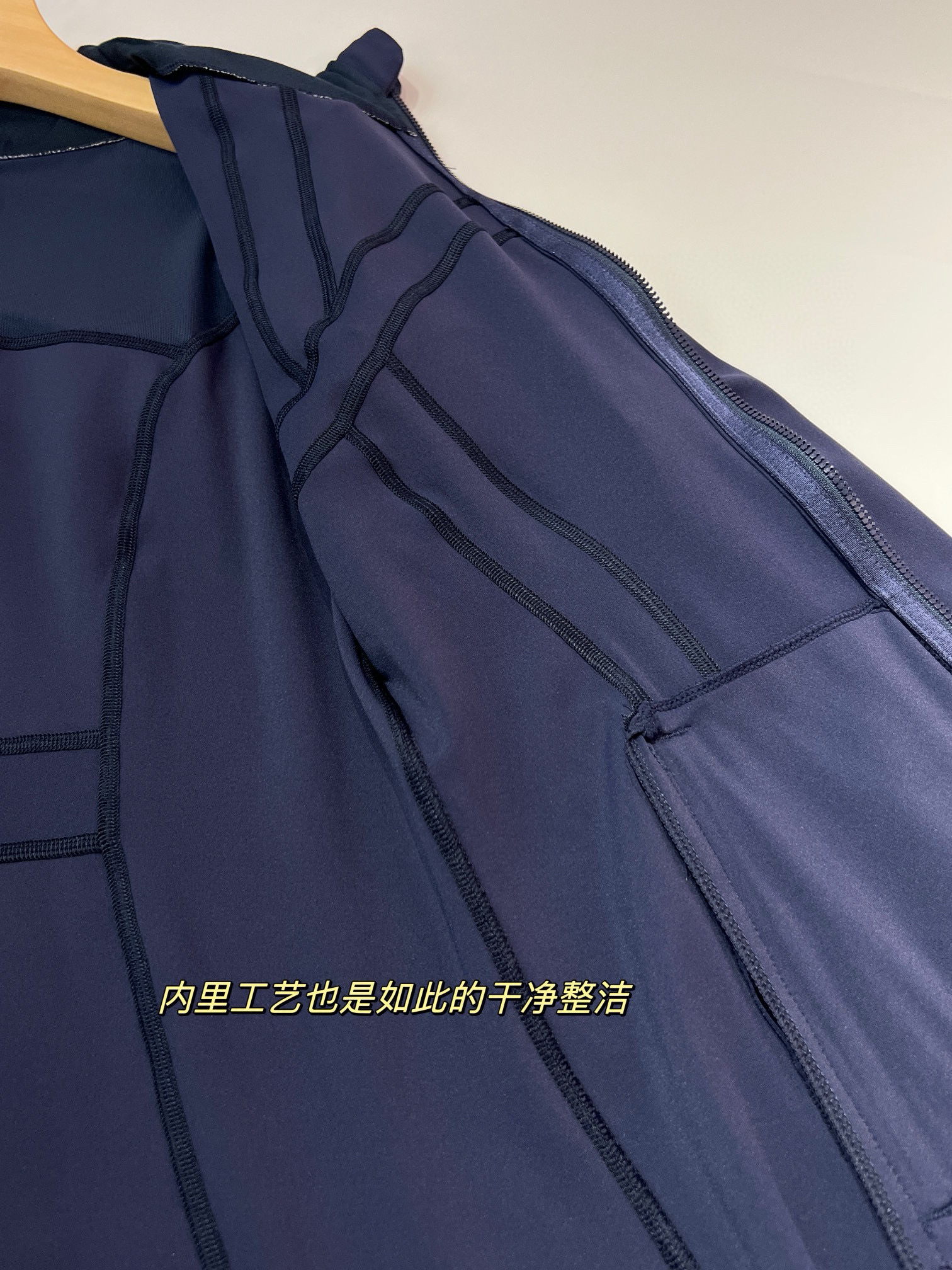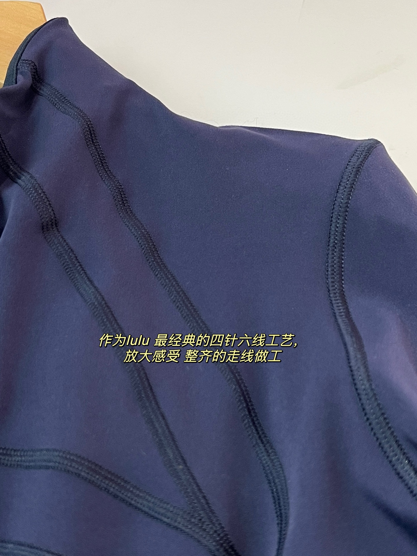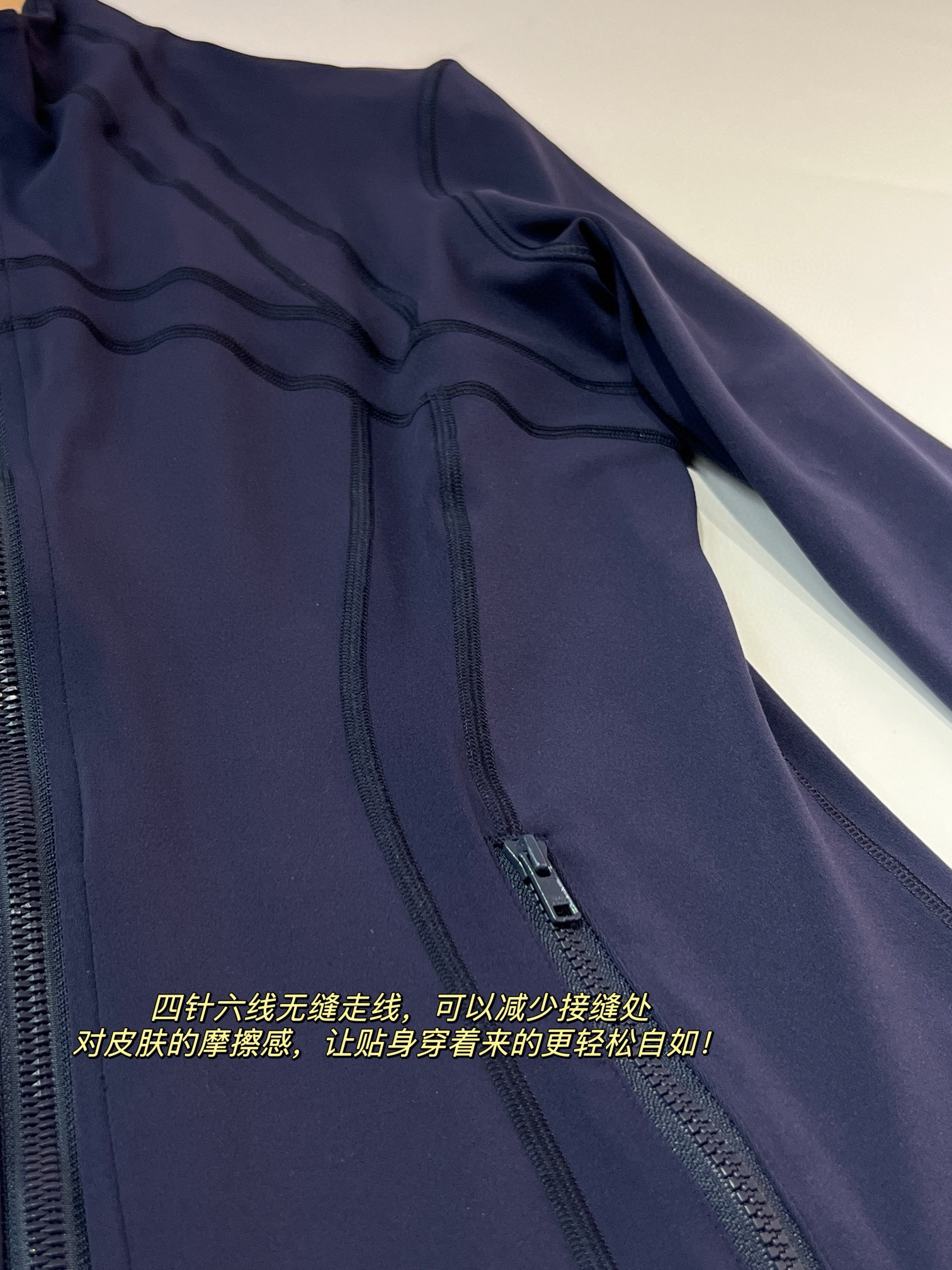 【四针六线无缝工艺】:作为lulu 最经典的四针六线工艺,放大感受内里如大阅兵一般工整整齐的走线做工,看似简单的运动外套,拼接处几乎找不到任何接