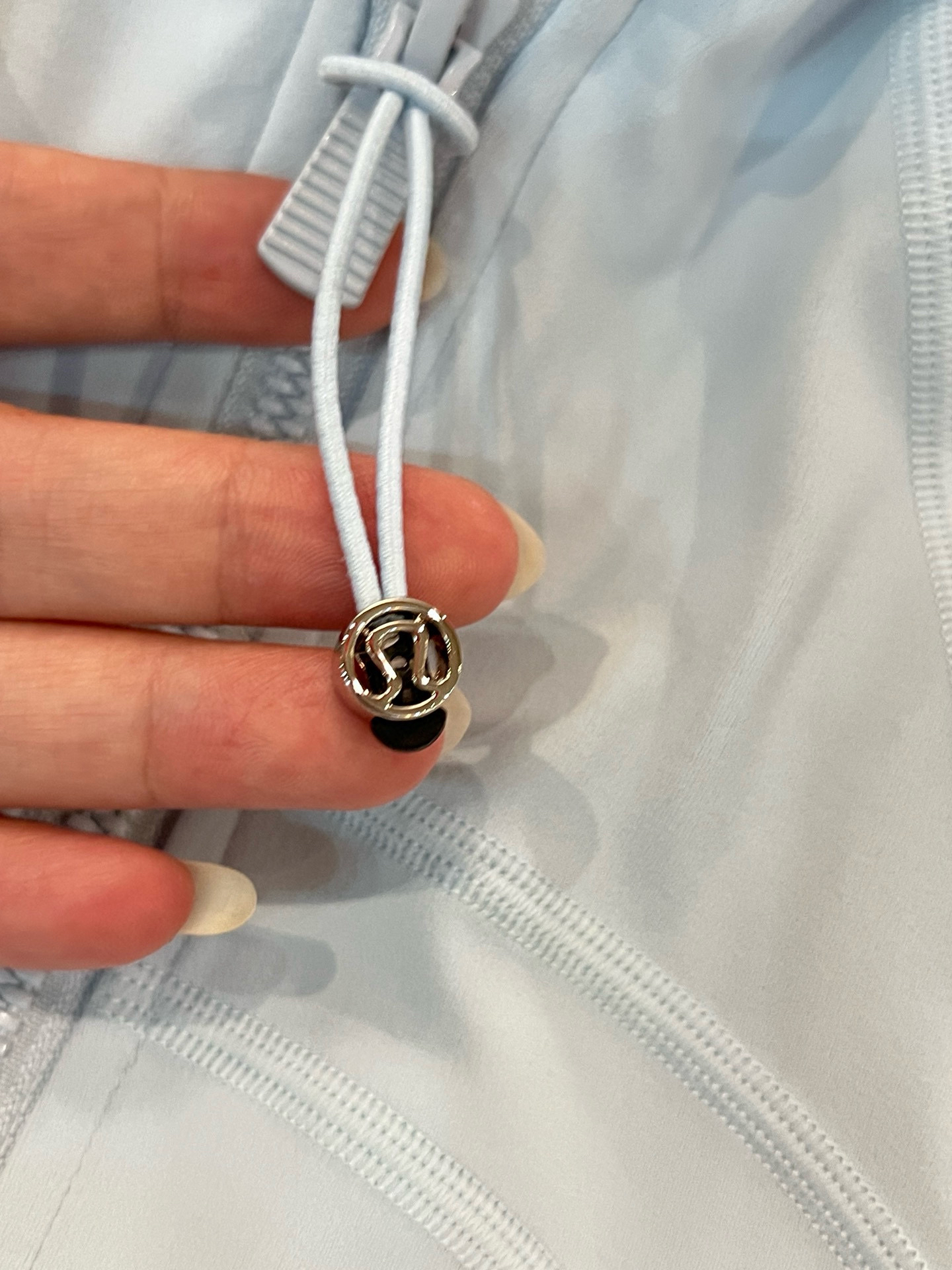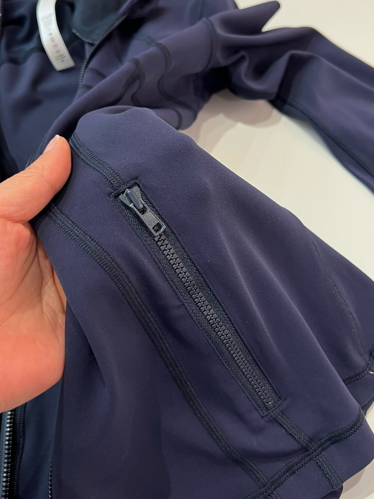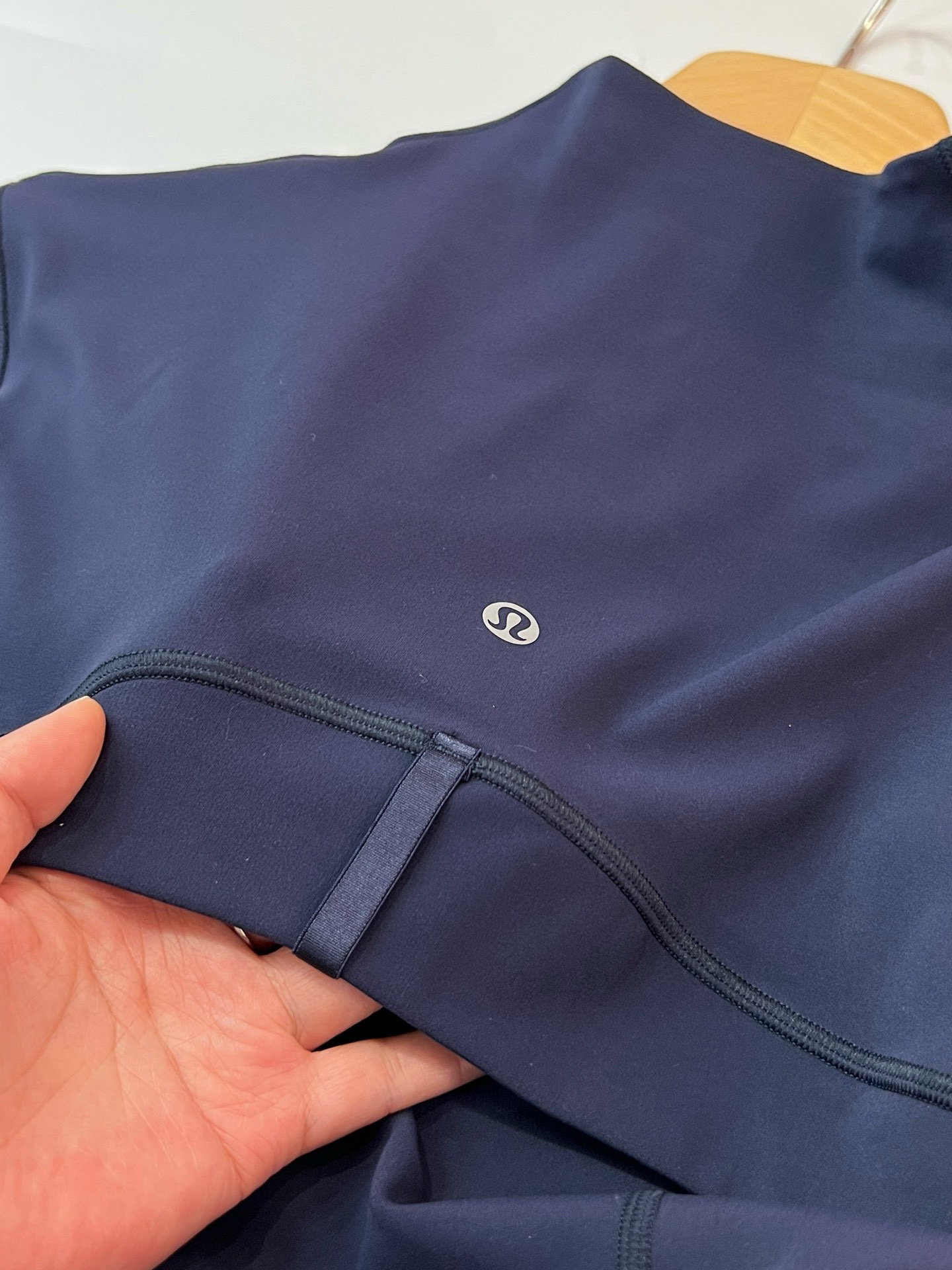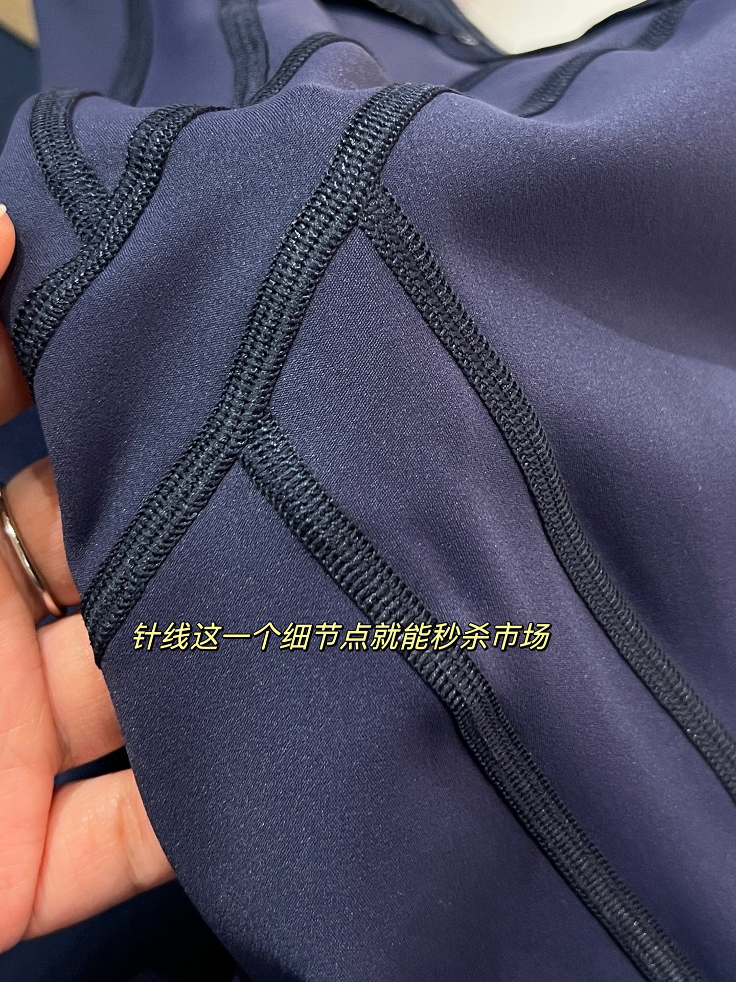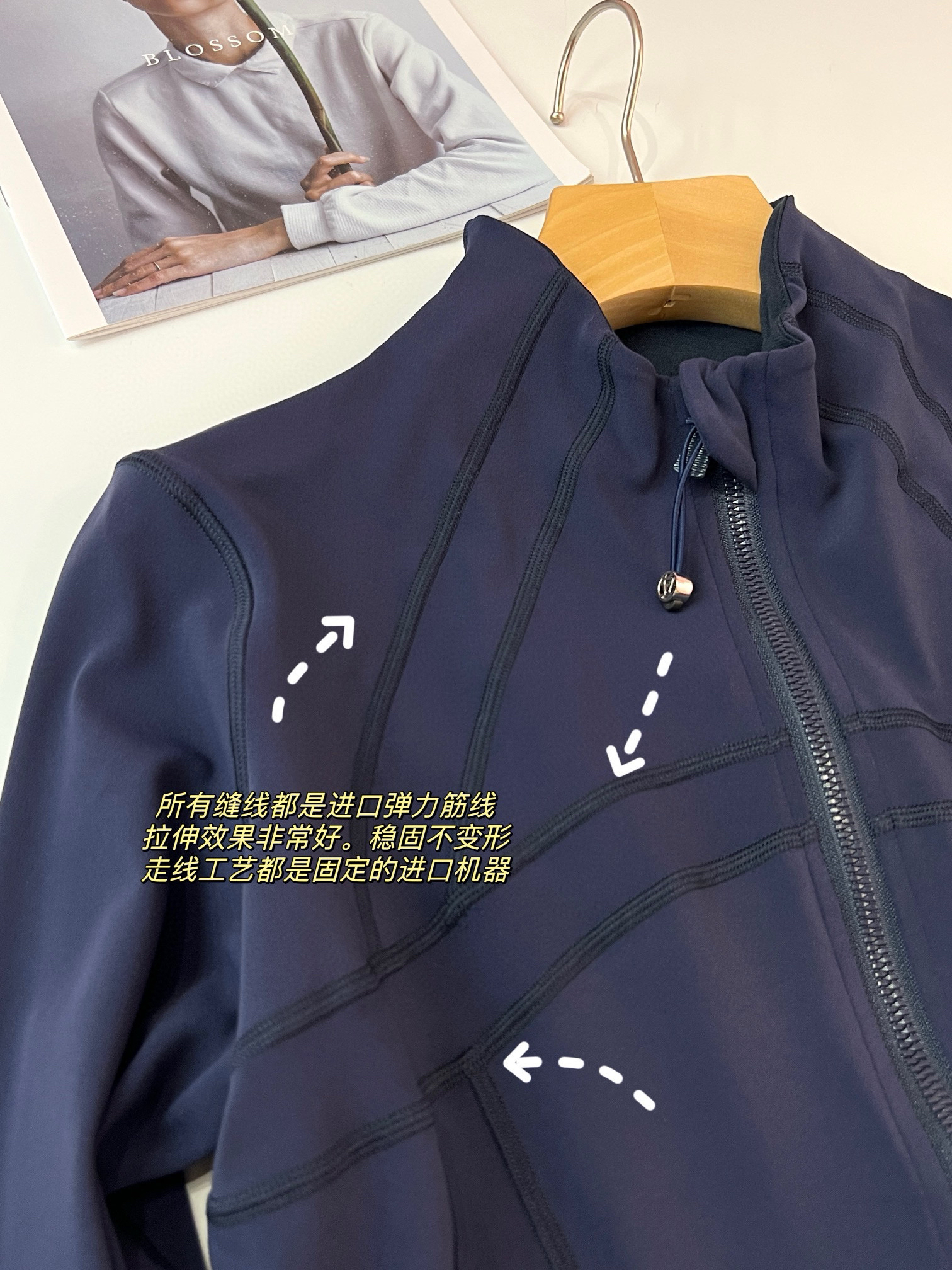 【四针六线无缝工艺】:作为lulu 最经典的四针六线工艺,放大感受内里如大阅兵一般工整整齐的走线做工,看似简单的运动外套,拼接处几乎找不到任何接