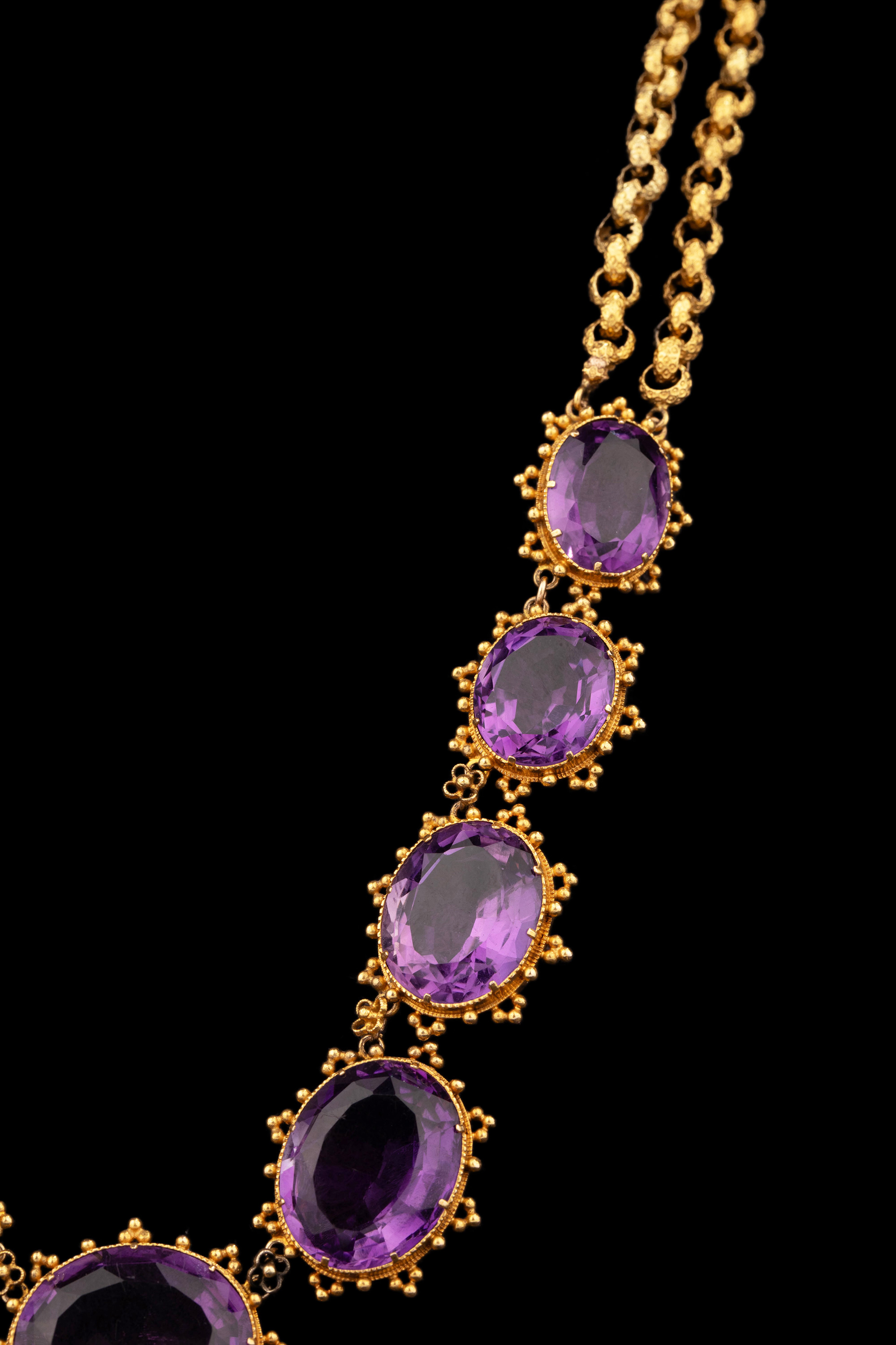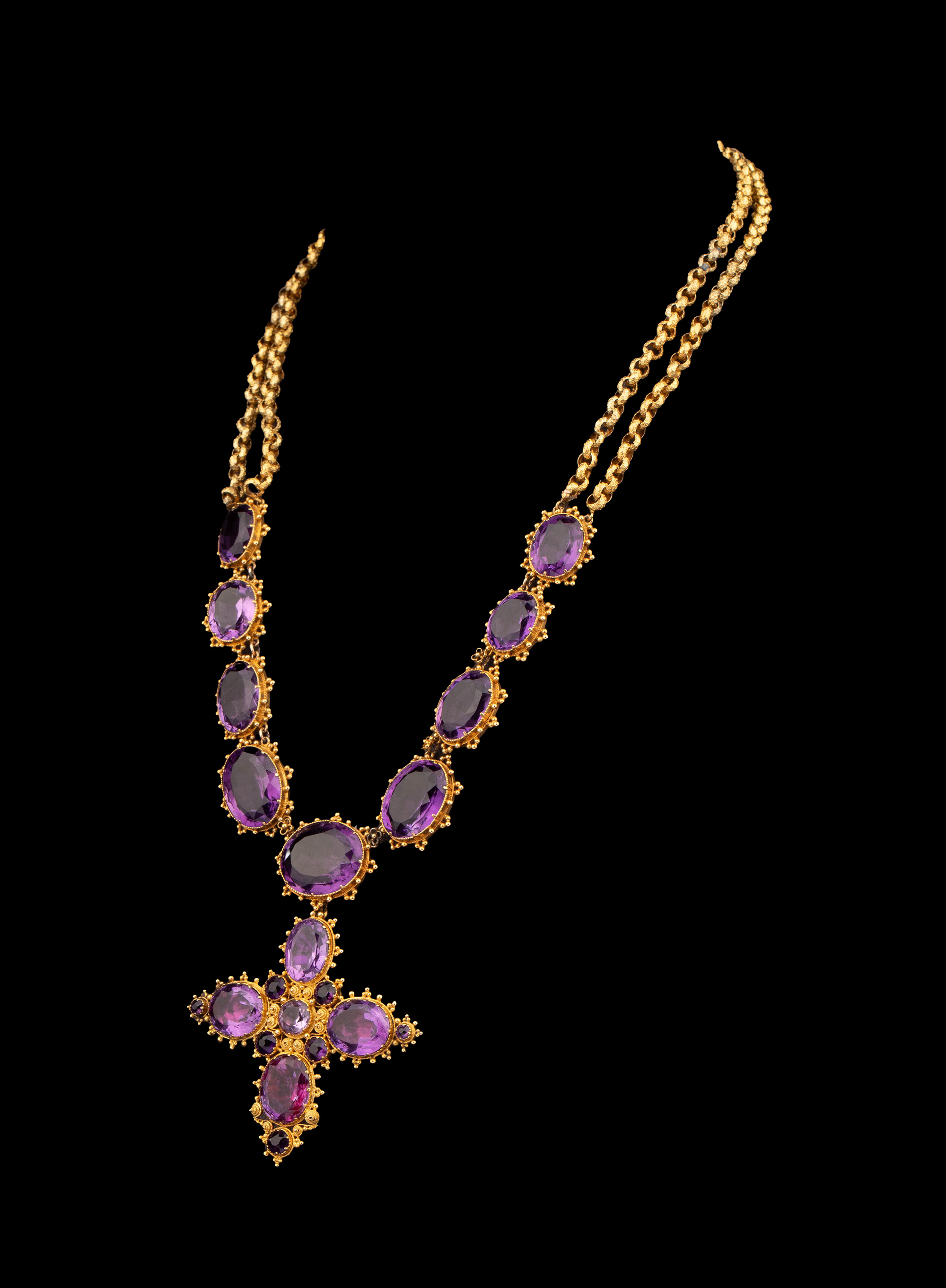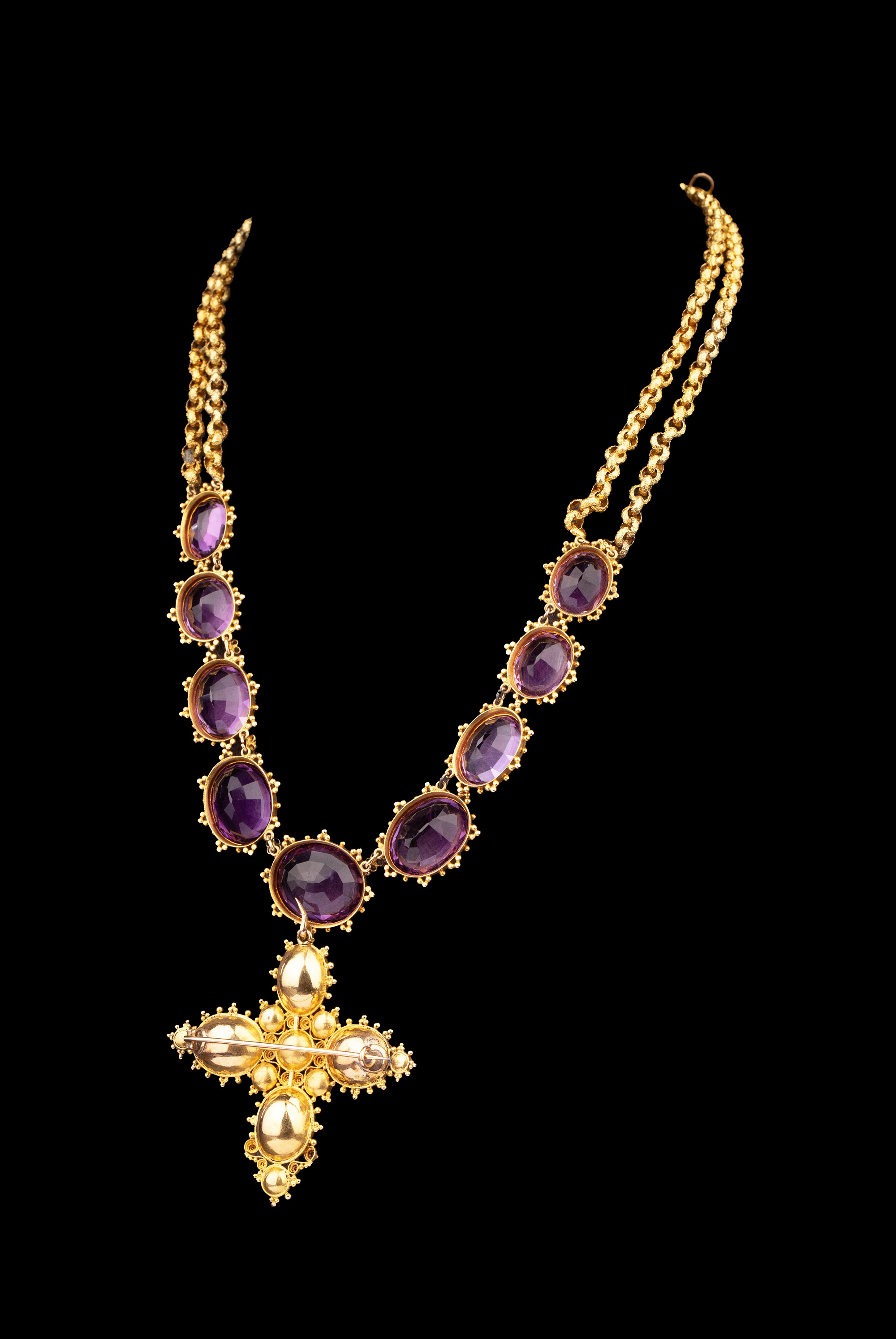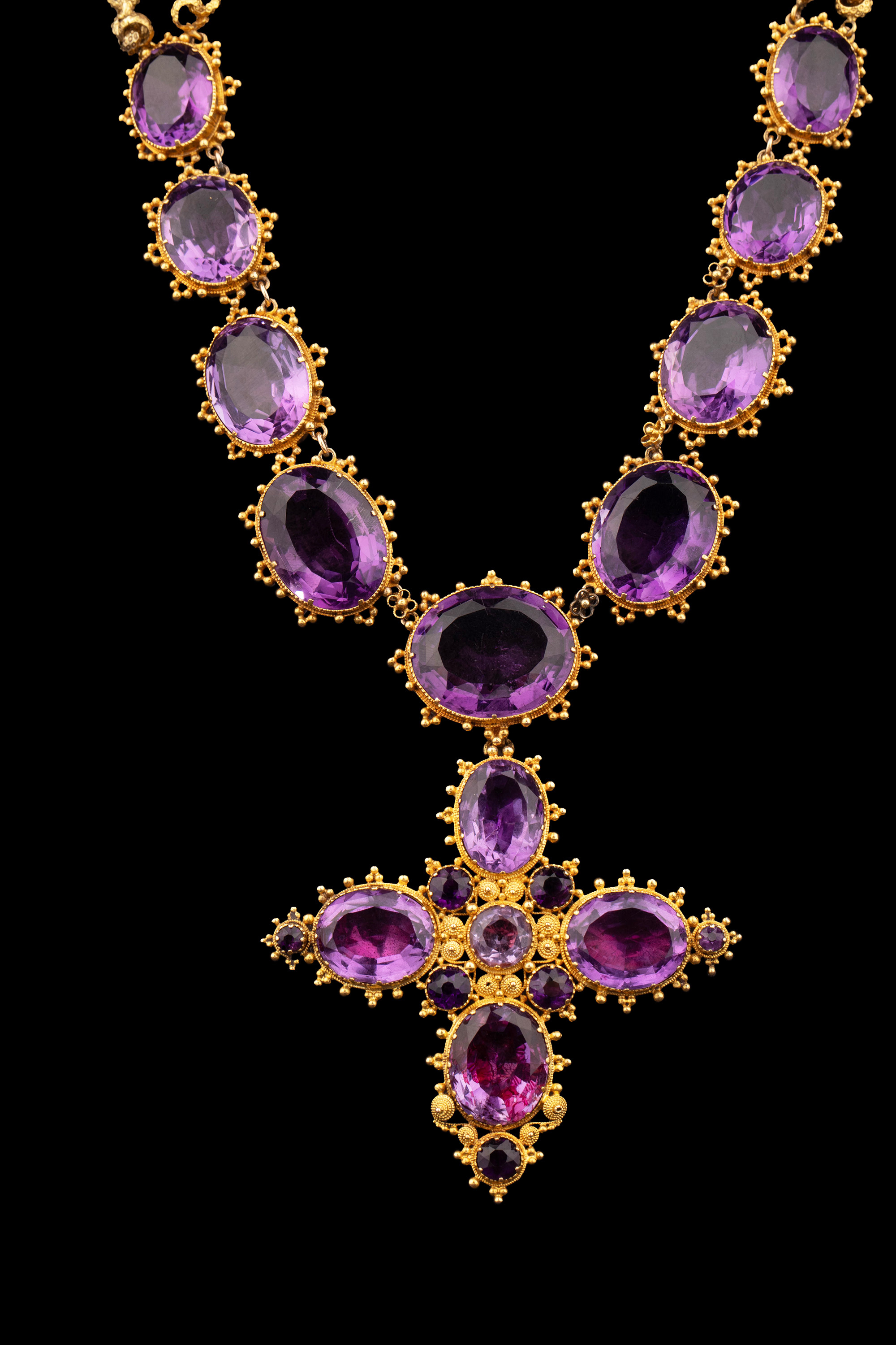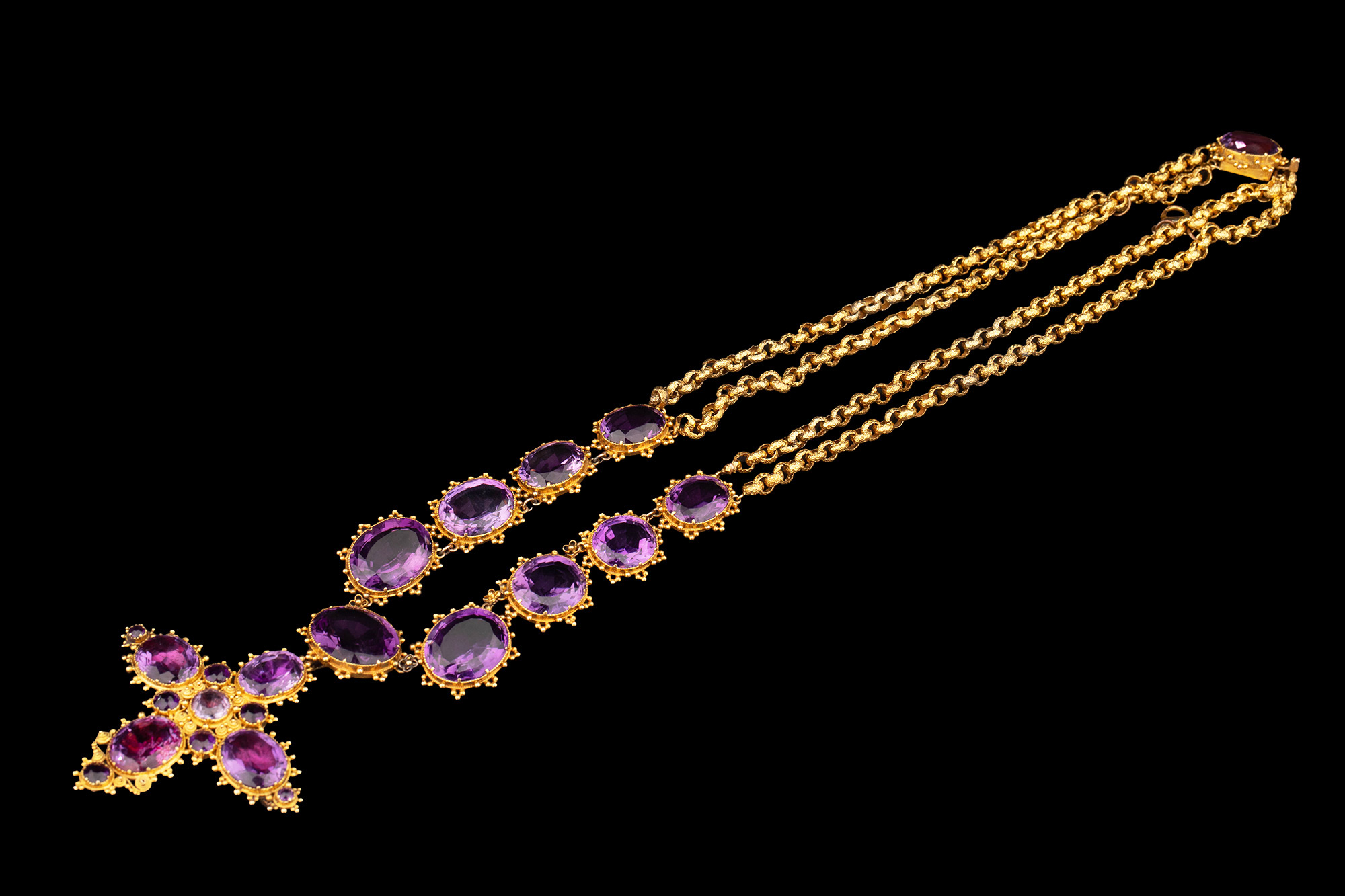 19世纪欧洲出品十字架造型滚珠卷草纹18K黄金精雕镶嵌可拆卸式紫水晶吊坠项链