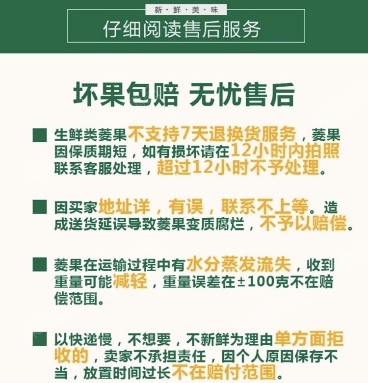 正常赔付情况:快递损毁;配重错误;产品变质,产品变粘,异物【⚠果身小白斑属正常介意勿拍】