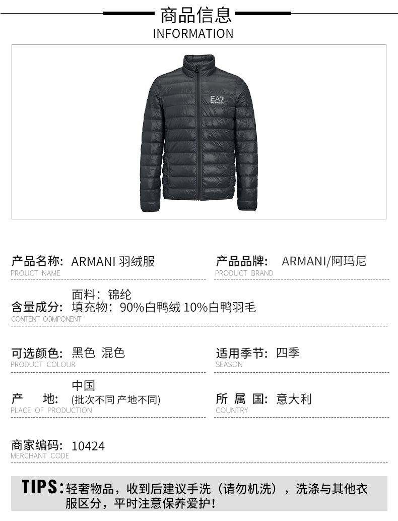 【超惠秒】Armani EA7运动休闲系列 轻薄款90%白鸭绒羽绒服/外套 10424 喜欢宽松可拿大一码