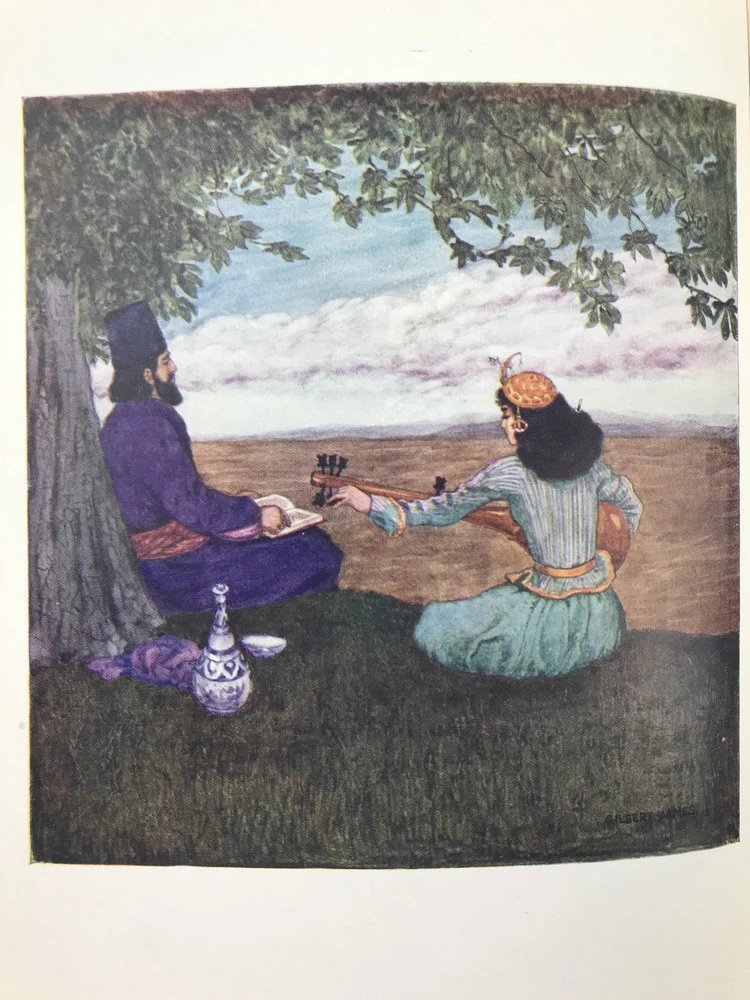 吉尔伯特·詹姆斯(Gilbert James,1865-1941),英国著名插画家,《鲁拜集》插画艺术先驱之一,先后在1898、1907和1909年为《鲁拜集》绘制过三版插图,风格秀丽,独具一格,为后世藏书家所推崇。
