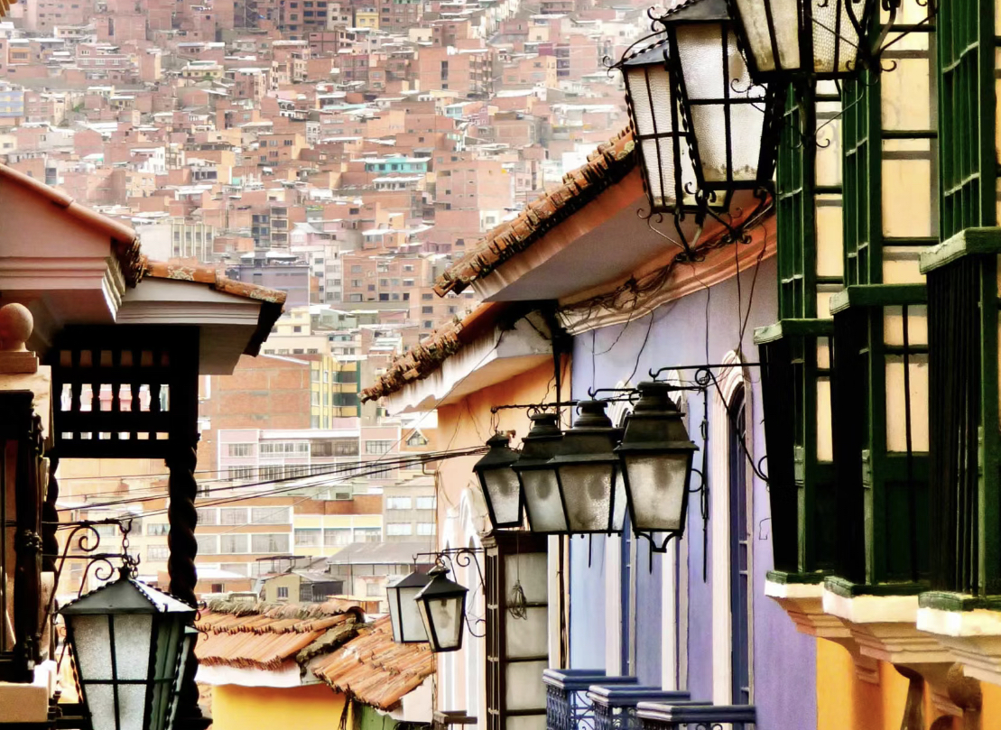 乘坐飞机前往拉巴斯,乘坐当地特色缆车交通前往城市最高点观景台,俯駛被誉为南美大陆最魔幻的城市,被雪山环绕在盆地山谷中的拉巴斯全景。